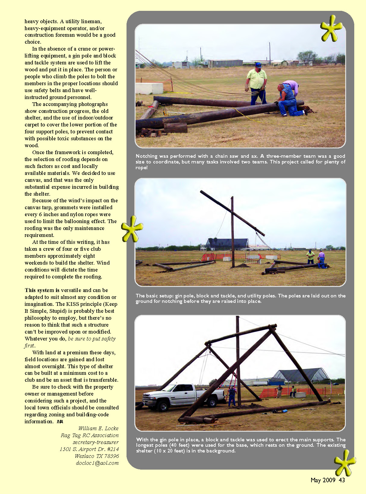 With the gin pole in place, a block and tackle was used to erect the main supports. The