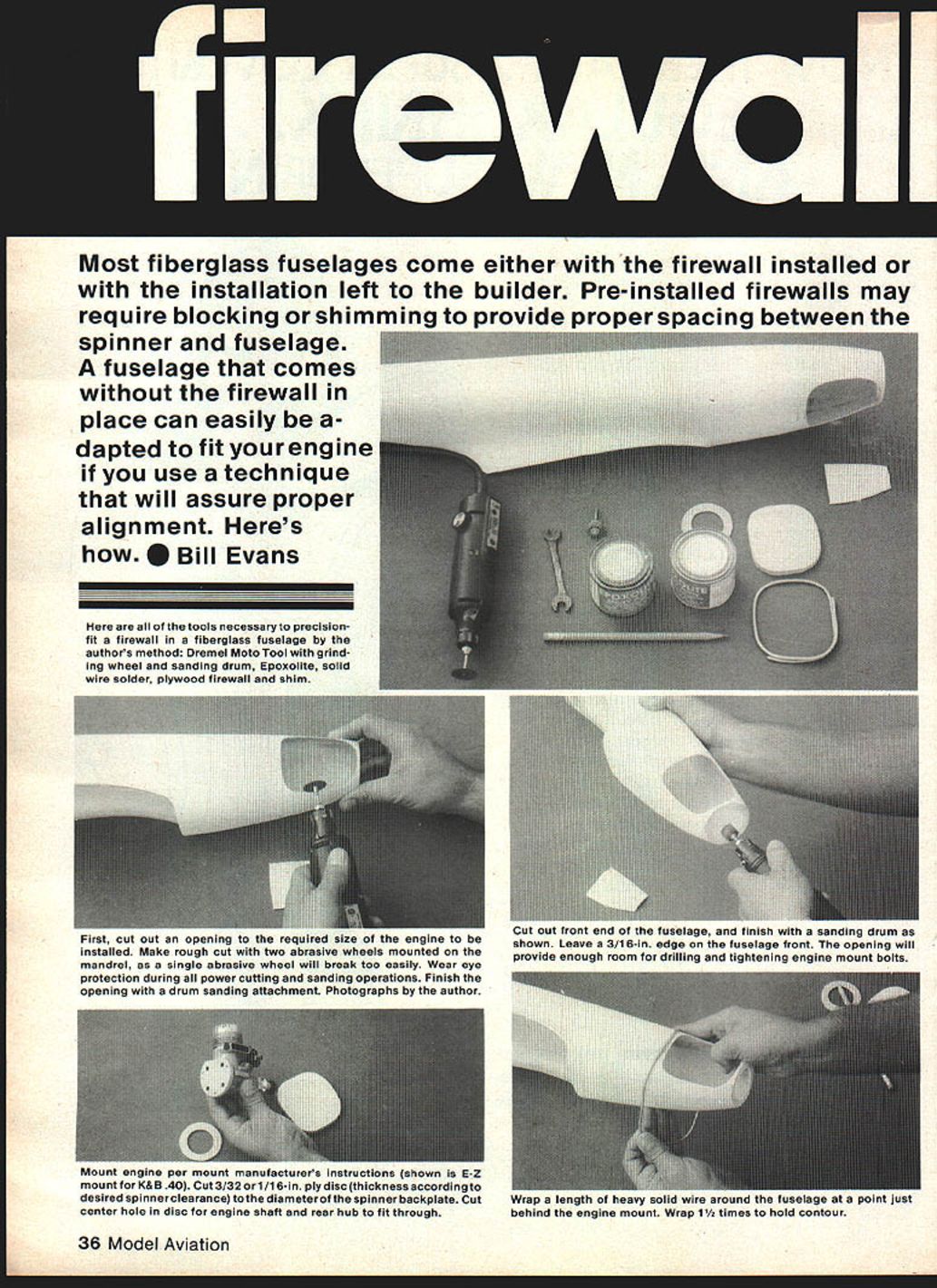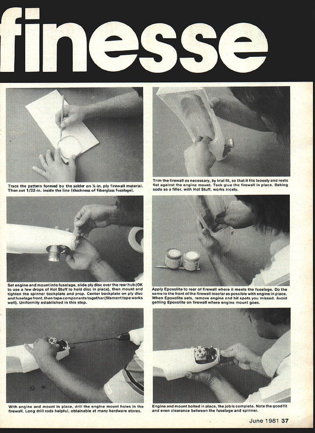 r Most fiberglass fuselages come either firewall installed installation left builder Pre-installed firewalls may require blocking orshimmir spinner fuselage fuselage comes firewall place can easily dapted fit yourengine use technique will assure proper alignment Heres howO Bill Evans tools necessary precisionfit firewall fiberglass fuselage authors method Dremel Moto Tool grind ing wheel sanding drum Epoxolite solid wire solder plywood firewall shim Mount engine per mount manufacturers instructions shown E-Z mount K&B 40 Cut3/32 /16-in ply disc thickness according desiredspinnerclearancetothediameterofthespinnerbacplate Cut center hole disc engine shaft rear hub fit through 36 Model Aviation V orovide oroner soacina between ui urn iront ena OT ruseiage ana tinisn witn sanaing drum First cut out opening required size engine shown Leave 3/16-in edge fuselage front opening will installed Make rough cut two abrasive wheels mounted provide enough room drilling tightening engine mount bolts mandrel single abrasive wheel will break too easily Wear eye protection during power cutting sanding operations Finish opening drum sanding attachment Photographs author wrap engin neavy soiio wire arouna inc iuseiage am point just behind engine mount Wrap 11/2 times hold contour June 1981 37 Trace pattern formed solder Y4-in ply firewall material cut 1/32-in inside line thickness fiberglass fuselage Trim firewall necessary trial fit fits loosely rests flat against engine mount Tack glue firewall place Baking soda filler Hot Stuff works nicely Set engine mount fuselage slide ply disc over rear hubOK use few drops Hot Stuff hold disc place mount tighten spinner backplate prop Center backplate ply disc fuselage front tape componentstogetherfilamenttape works well Uniformity established step Apply Epoxolite rear firewall meets fuselage same front firewall insofaras possible engine place Epoxolite sets remove engine hit spots missed Avoid getting Epoxolite firewall engine mount goes engine mount place drill engine mount holes firewall Long drill rods helpful obtainable hardware Stores Engine mount bolted place tile joo complete Note tne gooa lit clearance between fuselage spinner