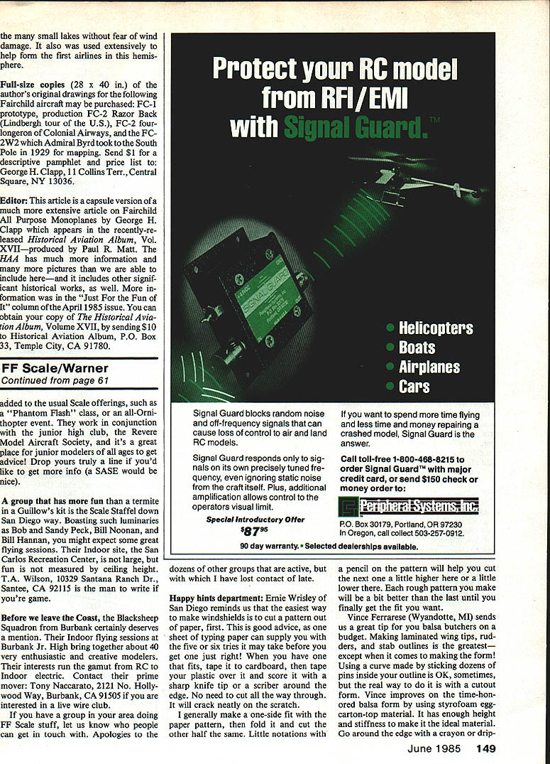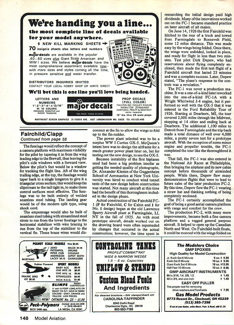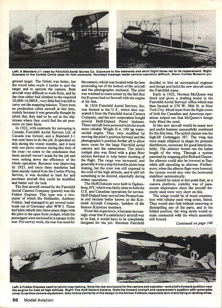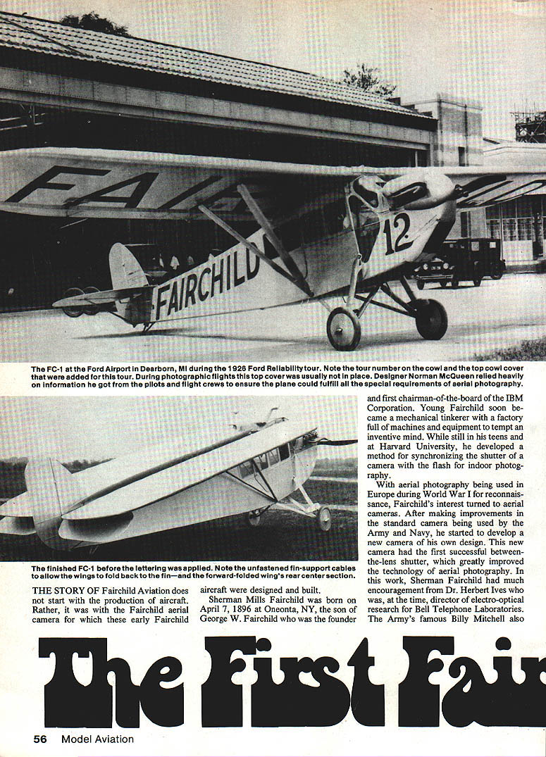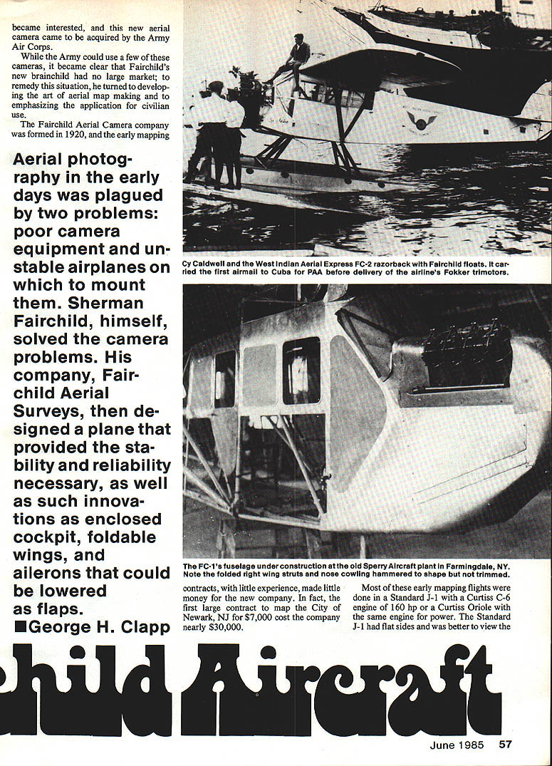 The FC-1 Ford Airport Dearborn MI during 1926 Ford Reliability tour Note tour number cowl top cowl cover added forthis tour During photographic fiights top coverwas ususily place Designer Norman McQueen relied heavily information got pilots flight crews ensure plane could fulfill special requirements aerial photography THE STORY OF Fairchild Aviation does start production aircraft Rather Fairchild aerial camera early Fairchild aircraft designed built Sherman Mills Fairchild born April 7 1896 Oneonta NY son George W Fairchild founder first chairman-of-the-board IBM Corporation Young Fairchild soon came mechanical tinkerer factory full machines equipment tempt inventive mind still teens Harvard University developed method synchronizing shutter camera flash indoor photog raphy aerial photography being used Europe during World War reconnais sance Fairchilds interest turned aerial cameras After making improvements standard camera being used Army Navy started develop new camera own design new camera first successful betweenthe-lens shutter greatly improved technology aerial photography work Sherman Fairchild much encouragement Dr Herbert Ives time director electro-optical research Bell Telephone Laboratories Armys famous Billy Mitchell also 56 Model Aviation finished FC-1 before lettering applied Note unfastened fin-support cables allow wings fold backto finand forward-folded wings rear center section became interested new aerial camera came acquired Army Air Corps Army could use few cameras became clear Fairchilds new brainchild no large market remedy situation turned develop ing art aerial map making emphasizing application civilian use Fairchild Aerial Camera company formed 1920 early mapping Aerial photog raphy early days plagued two problems poor camera equipment un stable airplanes mount Sherman Fairchild himself solved camera problems company Fair child Aerial Surveys de signed plane provided sta bility reliability necessary well such innova tions enclosed cockpit foldable wings ailerons could lowered flaps EGeorge H Clapp FC-1 s fuselage under construction old Sperry Aircraft plant Farmlngdaie NY Note folded right wIng struts nose cowling hammered shape trimmed contracts little experience made little Most early mapping flights money new company fact thedone Standard J-l Curtiss C-6 first large contract map City ofengine 160 hp Curtiss Oriole Newark NJ $7000 cost companythe same engine power Standard nearly $30000J- 1 flat sides better view Left Standard J-1 used Fairchild Aerial Survey Co Exposure elements short flight times led Its replacement Right Example Curtiss Oriole used first contracts Rounded fuselage made camera operation difficult Glenn Curtiss Museum plc ground target Oriole faster round sides made harder spot target operate camera Both aircraft difficult work time either climbed required 10000-14000 ft very little fuel leftto carry out mapping mission no production cabin aircraft time mainly because generally thought pilots out slip stream could feel air pres sures faces 1922 contracts surveying Canada Fairchild Aerial Surveys Ltd Canada formed Standard J-1 sent job operated skis during winter months took photo mission during time yearto come conclusion aircraft werent made job cutting down efficiency whole operation Business improving 1923 since machines merely rented Curtiss Flying Service decided look purchase aircraft could modified better suit task first aircraft owned Fairchild Aerial Camera Company parent Fokker Express type twoseater Hollander Anthony Fokker managed get several trainloads out Germany after WW rebuilt three-place ships pilot open front cockpit passengers enclosed canopy rear survey work rear used camera located lens protruding out bottom aircraft photographer enclosed pilot warmed some extent fact Express no firewall engine feet 1924 Fairchild Aerial Surveys Inc formed US sep arated Fairchild Aerial Camera Company new corporation bought several Huff-Daland Petrel biplanes aircraft powered much reliable Wright E-4 190 hp watercooled engine modified moving pilots position forward photographers position further aft allow room large Fairchild aerial camera cameraman pilots cockpit also fitted glass floor section forward help better tracking flight range increased generally step forward photo map making crew still exposed cold high altitude still left something desired especially during winter operations Huff-Dalands built Ogdens burg NY fairly close both US Canadian operations service Huff-Daland later moved Pennsylvan ia became better known Key ston Aircraft Company builders famous Keystone bombers experience became increas ingly clear satisfactory aircraft would have completely designed job Sherman Fairchild decided hire aeronautical engineer design build new aircraft under Fairchild name Early 1925 Norman McQueen hired given drafting board Fairchild Aerial Surveys office located 270 W 38th St New York City Much input flight crews both Canadian American oper ations helped see McQueens design truly fitted need new aircraft would new useful features successfully combined first time airfoil chosen high-lift Gottinggen 387 wing tips made elliptical shape pressure distribution necessary good lateral sta bility ailerons would run entire length wing Through system patented mapping pilot Richard Depew ailerons could also lowered flaps still operating ailerons Further aileron-flaps lowered system would also trim horizontal stabilizer automatically should noted point camera platform stability para mount importance since aircraft merly used very short wings would wood construc tion tubular steel wing struts faired would also fold removing dismantling parts folded position wing struts would re main connected whole assembly still braced Continued page 148 Left Fokker Express used photo map making Note rear enclosure forthe camera operatorand pilots forward position near engine heat high altItude Right Huff-Daland biplane Note forward cockpIt cameramans position re