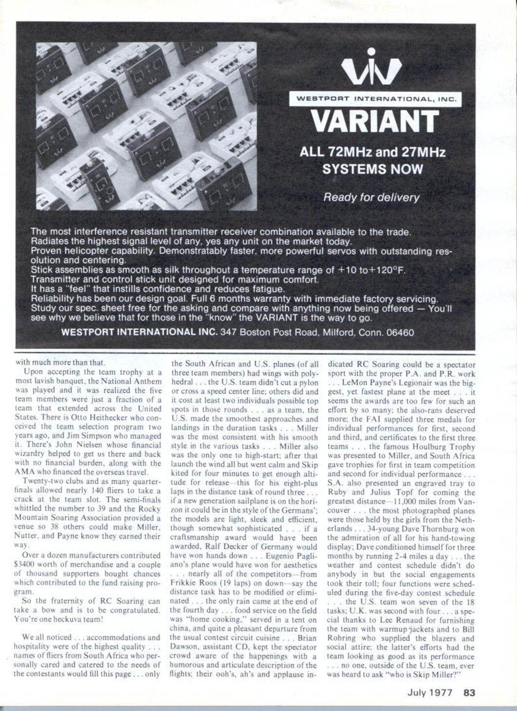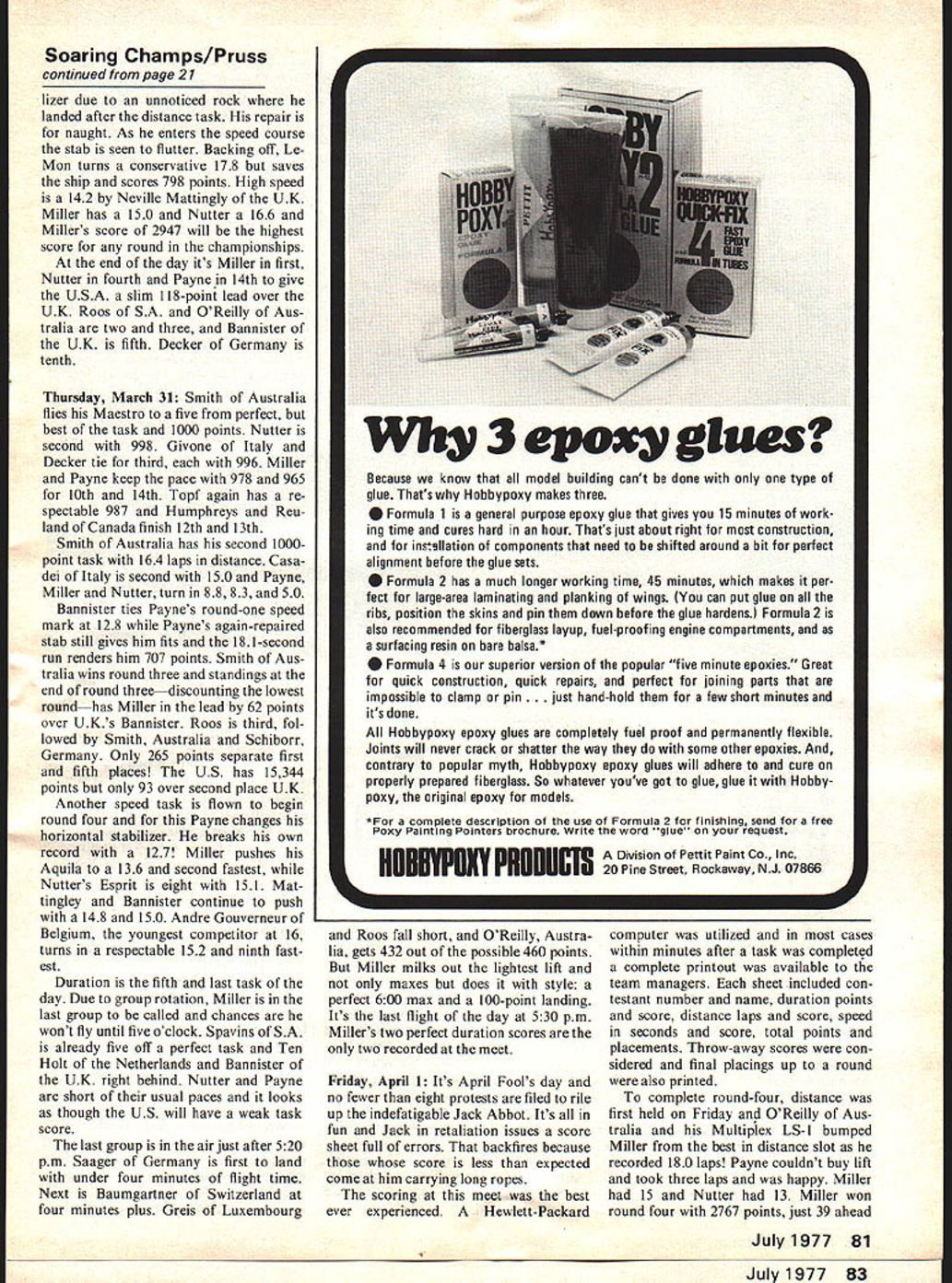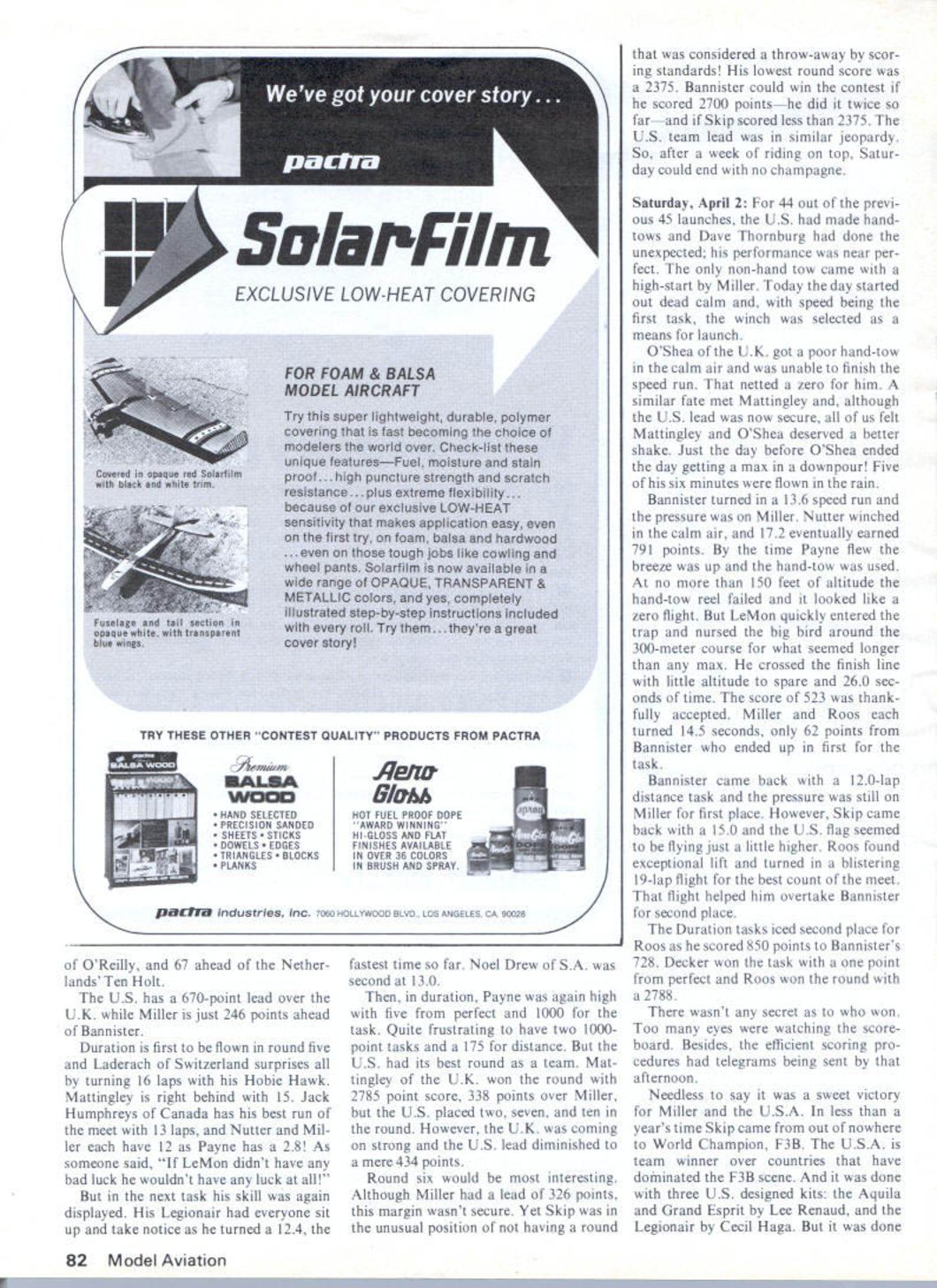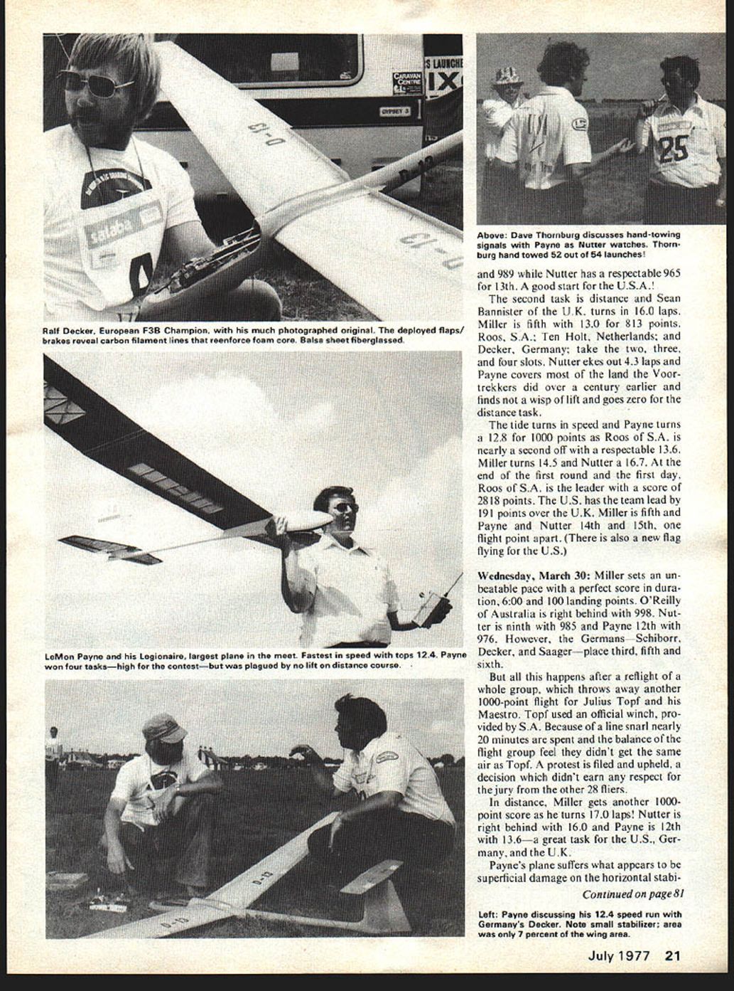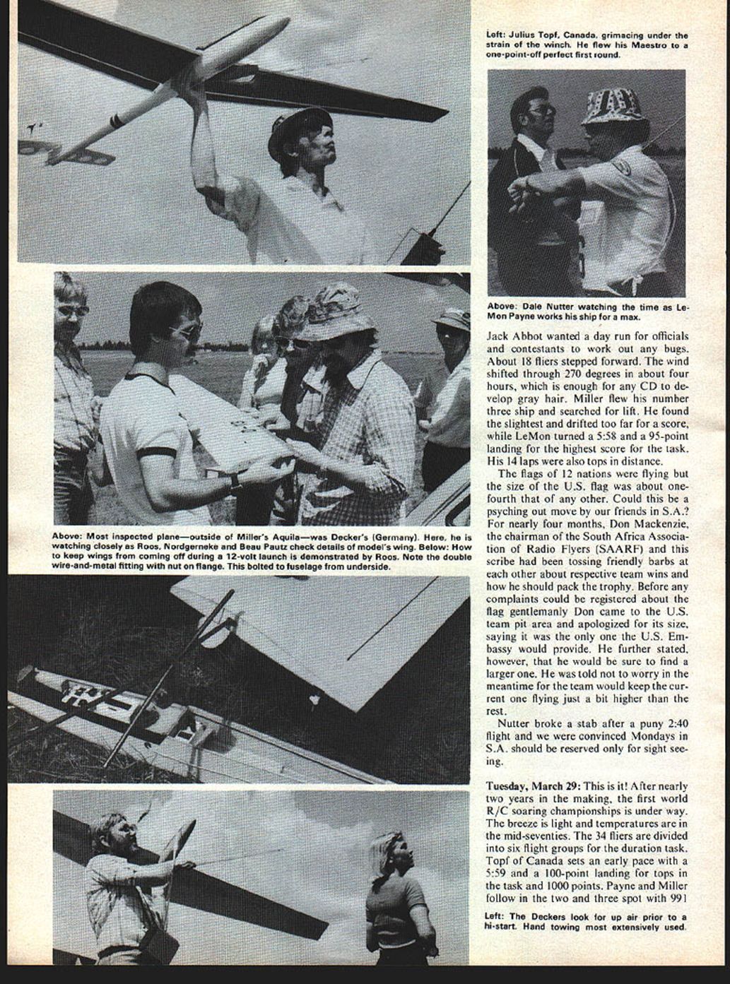 NO OCR TEXT similar design simpler flap/airbrake arrangement Tuesdays routine pace main tained through weekbreakfast eight field nine Suntan oils applied about day too late after winter like past nobody cared Duration times looking good spot landings Dale decided sheetedwing Grand Esprit would number ship began groom following week Speed times unim pressive act beginning get together Wednesday team stuck winch hand-tow Payne near 12-second mark speed Miller near 15 Dale 17 team began groove Thursday split practice session held eight 12 oclock Nutter having no trouble getting six-minute flights hitting hat spot landings speeds fast 14 seconds con sistent 15s afternoon Skip Le Mon went through paces LeMon broke 12-second mark five runs elevens best 115 Skip calling shots landing speed course textbook smooth 15 seconds act ready big time However Australians Cana dian team Decker Germany getting sunburned corners eyes getting much ex ercise watching Friday after about 120 man hours practice took holiday strong feeling confidence After six minutes six minutes no matter simple phisticated ship No matter what LUTt success story year amount ot tame Skip Miller Went zero world champ holding Holburg Trophy awarded Belgium Above Skip assembling Aquila sailplane Right PAl officials inspectedand weighedjust about everything officialwe assume wings benefit Dan Pruss camera rumors have spread past year about superships 12 seconds still num ber beat speed distance would take chances luck factor just II other countries would Saturday resumed practice Skip outdid himself consistent 135s air calm downwind Dave winches got workout Walt Schroder MAN appeared scene support team increased 100% evening dinner together Ron Moulton editor RCM & E Monte hosted affair Young Mike Mal herbe received commission SA Airforce reason 18 Model Aviation Swiss team manager Hans Schiapter shows team member Gerhard Laderach well-equipped clip boardlap counter three stop watches calculator tape recorder score sheets No yodel F Roos South Africa second place 19 laps World renowned Eugenio Pagliano Italy latest design Wing pylon mounted flap servo distance high meet in pylon Wind tunnel tested Crescendos design has proved aerodynamically sound Britains Sean Bannister seems offering sacrifice sun gods pushed Miller throughout meet outdone Roos last day Left Innards Bannisters Algebra Flaps permitted variable camber airfoil otherwise semi-symmetrical Left The US team first field morningit paid off R Nutter Payne Meesh Rheault Skip Miller celebrate honored part gathering Sunday practice Dale Le Mon continued pour six-minute duration spot two have friendly feud past five years Tulsa/Dallas war has healthy sport two days theyll have address USA Italians showed up best looking ships week model boxes works art much publi cized Eugenio Pagliano Vevi 75 another super-ship among favor ites Swiss team red-andwhite jumpsuits showed up looking like Olympic track team team manager Hans Schlapfer performing efficiently Monday March 28 formal prac tice schedule held Contest director Left Julius Topf Canada grimacing under strain winch flew Maestro one-point-off perfect first round Jack Abbot wanted day run officials contestants work out bugs About 18 fliers stepped forward wind shifted through 270 degrees about four hours enough CD de velop gray hair Miller flew number three ship searched lift found slightest drifted too far score LeMon turned 558 95-point landing highest score task 14 laps also tops distance flags 12 nations flying size US flag about onefourth other Could psyching out move friends SA9 nearly four months Don Mackenzie chairman South Africa Associa tion Radio Flyers SAARF scribe tossing friendly barbs other about respective team wins should pack trophy Before complaints could registered about flag gentlemanly Don came US team pit area apologized its size saying the US Em bassy would provide further stated however would sure find larger told worry meantime team would keep cur rent flying just bit higher rest Nutter broke stab after puny 240 flight convinced Mondays SA should reserved sight see ing Tuesday March 29 After nearly two years making first world R/C soaring championships under way breeze light temperatures mid-seventies 34 fliers divided six flight groups duration task Topf Canada sets early pace 559 100-point landing tops task 1000 points Payne Miller follow two three spot 991 Left The Deckers look up sir prior hi-start Hand towing extensively used Above Dale Nutter watching time Le Mon Payne works ship max Above Most inspected planeoutside Millers Aquilawas Deckers Germanyl watching closely Roos Nordgerneke Beau Pautz check details models wing Below keep wings coming off during 12-volt launch demonstrated Roos Note double wire-and-matal fittina nut flange bolted fuselage underside 989 Nutter has respectable 965 13th good start USA second task distance Sean Bannister UK turns 160 laps Miller fifth 130 813 points Roos SA Ten Holt Netherlands Decker Germany take two three four slots Nutter ekes out 43 laps Payne covers land Voor trekkers did over century earlier finds wisp lift goes zero distance task tide turns speed Payne turns 128 1000 points Roos SA nearly second off respectable 136 Miller turns 145 Nutter 167 end first round first day Roos SA leader score 2818 points US has team lead 191 points over UK Miller fifth Payne Nutter 14th 15th flight point apart also new flag flying US Wednesday March 30 Miller sets un beatable pace perfect score dura tion 600 100 landing points OReilly Australia right behind 998 Nut ter ninth 985 Payne 12th 976 However GermansSchiborr Decker Saagerplace third fifth sixth happens after reflight whole group throws away another 1000-point flight Julius Topf Maestro Topf used official winch pro vided SA Because line snarl nearly 20 minutes spent balahce flight group feel didnt get same air Topf protest filed upheld decision didnt earn respect jury other 28 fliers distance Miller gets another 