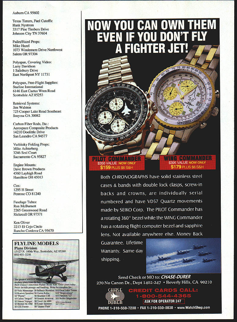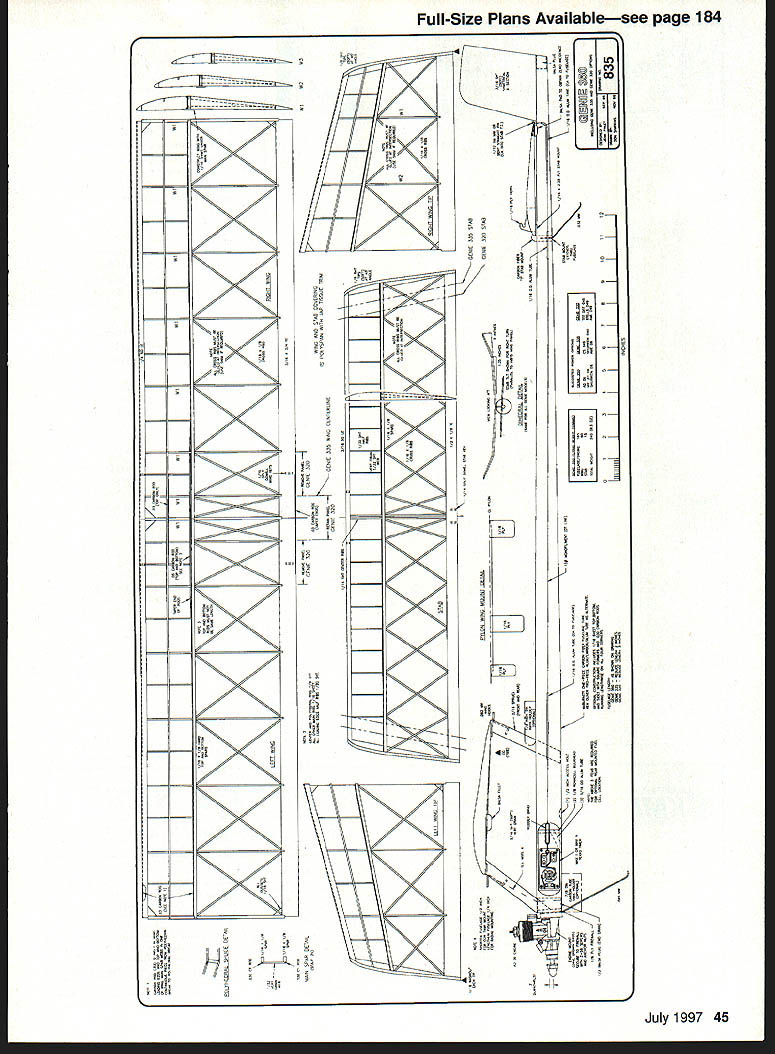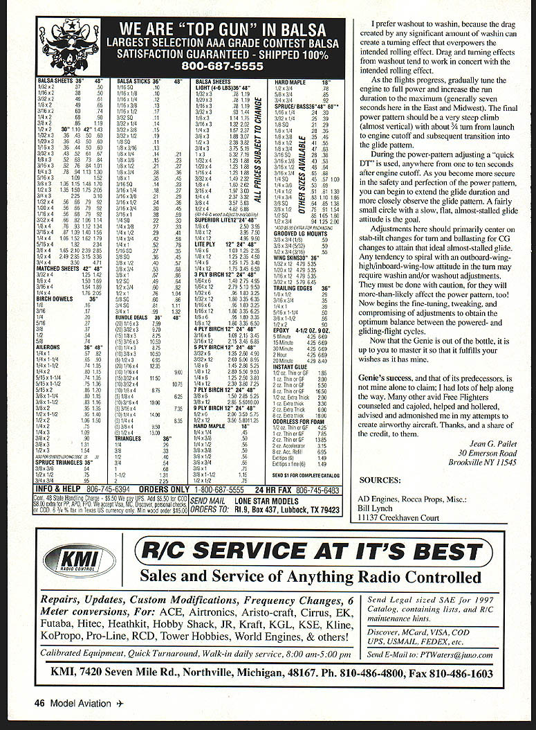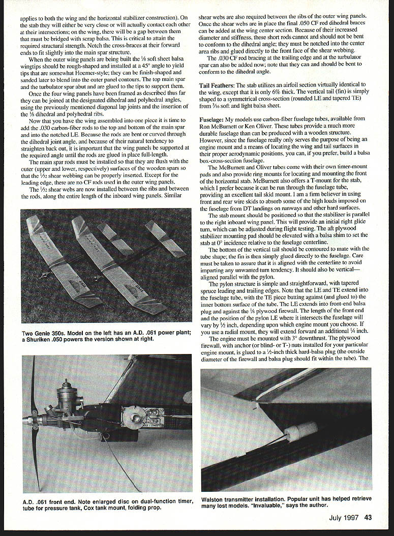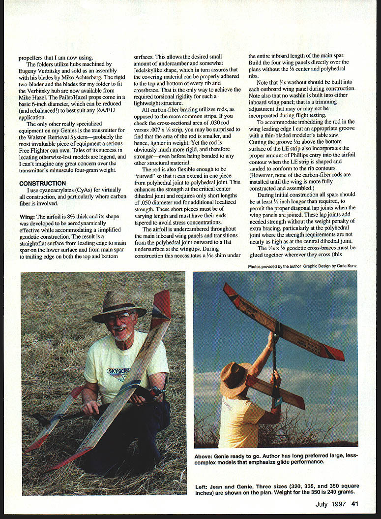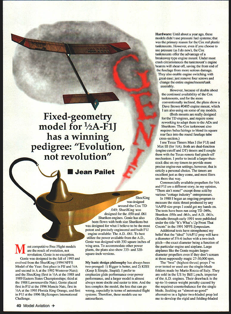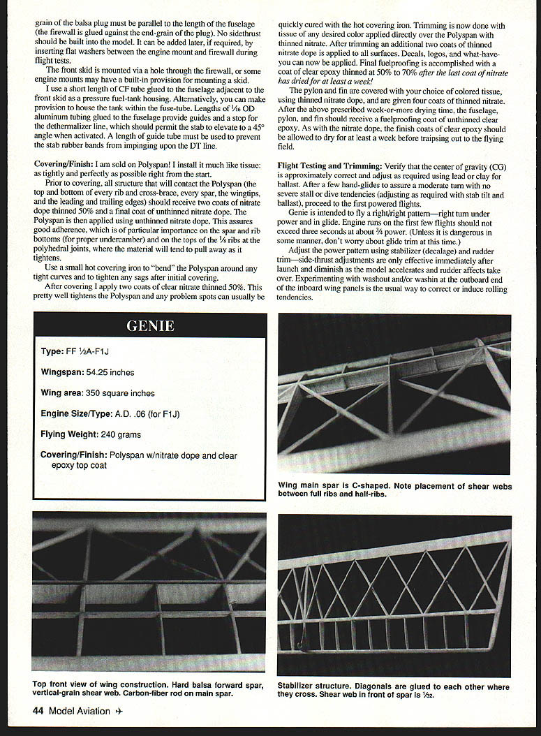 Most competitive Free Right models result evolution revolution Genie no exception Genie designed fall 1995 evolved ShunKing 1994 NFFS Model Year first place F1J and second 1992 Westover Nats ShocKing first 1988 1989 Eastern States Championships third 1988 Lawrenceville Nats Genie placed first F1J 1996 Muncie Nats first 1995 Honda King Orange first F1J 1996 SkyScrapers International Challenge nocKing designed around Cox TD 049 ShunKing designed 050 061 Shuriken engines Genie has also neen flown both size Shurikens designed what believe potent precisely engineered built F1J engine available AD 061 best utilize power available AD Genie designed 350 square inches wing area accommodate other power plants plans also show 335- 320square-inch versions basic design philosophy has always two-pronged 1 Bigger better 2 KISS Keep Simple Stupid prefer emphasize glide performance over power performance larger model almost always docile easier trim less complex model less can go wrong especially terms automated flight systems Therefore models use no autosurfaces Hardware Until about year ago models didnt use pressure fuel systems primary reason Cox red plastic tankmounts However choose use pressure now Cox tankmounts offer advantage breakaway type engine mount Under crash circumstances tankmounts engine bearers will shear off saving front end fuselage serious damage also enable engine switching great ease just remove four screws change entire engine/mount/tank assembly However because doubts about continued availability Cox tankmounts conventionally inclined plans show Dave Brown 4O405 engine mount am also using some models Both mounts really designed TD engines require some reworking adapt ADs Shurikens Cox tankmount also requires balsa fairings blend its square rear face round fuselage tube cross-section use Texas Timers Max F1J Max III Both dual-function engine cutoff DT timers couple Texas remote fuel pinch-off mechanism prefer install larger-thanstock disc timers provide precise engine-mn settings however stricfly personal choice timers excellent just come fliers use way Commercially available propellers FlJ different story opinion aint except sold various cottage industry entrepreneurs 1988 began ongoing program measure static thrust produced 1/2A/FIJ-size props could get hands tests have run using TD 049s Shuriken 050s 061s AD 061s Results through early 1991 published under title Its Whats Up Front Counts 1991 NFFS Symposium Additional tests have strengthened belief ideal 1AAJFlJ prop will have diameter 54-6 inches two-inch pitchthe exact diamete]r being function particular engine airplane Large airplanes like Genie require largerdiameter propellers dont scream supposedly magic 27-30000 rpm best highest thrust props Ive ever tested used single-blade folders made Mario Rocca Italy sold US Bill Lynch importer AD engines drawback up-to- 1/2-ounce weight penalty caused required counterbalance single blade Seeking almost-as-good alternative lighter two-bladed prop led develop rigid folding-bladed 40 Model Aviation d-geometry model 1/2A-F1J has winning pedigree Evolution revolution~ N U Jean Pallet propellers am now using folders utilize hubs machined Eugeny Verbitsky sold assembly blades Mike Achterberg rigid two-blader blades folder fit Verbitsky hub now available Mike Hazel Pailet/Hazel props come basic 6-inch diameter can reduced rebalanced best suit /2A/F1J application other really specialized equipment Genies transmitter Walston Retrieval Systemprobably invaluable piece equipment serious Free Righter can own Tales its success locating otherwise-lost models legend cant imagine great concern over transmitters minuscule four-gram weight CONSTRUCTION use cyanoacrylates CyAs virtually construction particularly carbon fiber involved Wing airfoil 8% thick its shape developed aerodynamically effective accommodating simplified geodetic construction result straight/flat surface leading edge main spar lower surface main spar trailing edge both top bottom surfaces allows desired small amount undercamber somewhat Jedelskylike shape turn assures covering material can properly adhered top bottom rib crossbrace way achieve required torsional rigidity such lightweight structure carbon-fiber bracing utilizes rods opposed common strips check cross-sectional area 030 rod versus 007 x strip may surprised find area rod smaller hence lighter weight Yet rod obviously much rigid therefore strongereven before being bonded other structural material rod also flexible enough curved can extend piece polyhedral joint polyhedral joint enhances strength critical center dihedral joint requires short lengths 050 diameter rod additional localized strength short pieces must varying length must have ends tapered avoid stress concentrations airfoil undercambered throughout main inboard wing panels transitions polyhedral joint outward flat undersurface wingtips During construction necessitates 1/16 shim under entire inboard length main spar Build four wing panels direcfly over plans /s center polyhedral ribs Note /16 washout should built outboard wing panel during construction Note also no washin built either inboard wing panel trimming adjustment may may incorporated during flight testing accommodate imbedding rod wing leading edge cut appropriate groove thin-bladed modelers table saw Cutting groove /22 above bottom surface LE strip also incorporates proper amount Phillips entry airfoil contour LE strip shaped sanded conform rib contours However carbon-fiber rods installed until wing fully constructed assembled During initial construction spars should least /2 inch longer required permit proper diagonal lap joints wing panels joined lap joints add needed strength weight penalty extra bracing particularly polyhedral joint strength requirements nearly high central dihedral joint /i6 x Vs geodetic cross-braces must glued together wherever cross Left Jean Genie Three sizes 320 335 350 square inches shown plan Weight 350 240 grams July 199