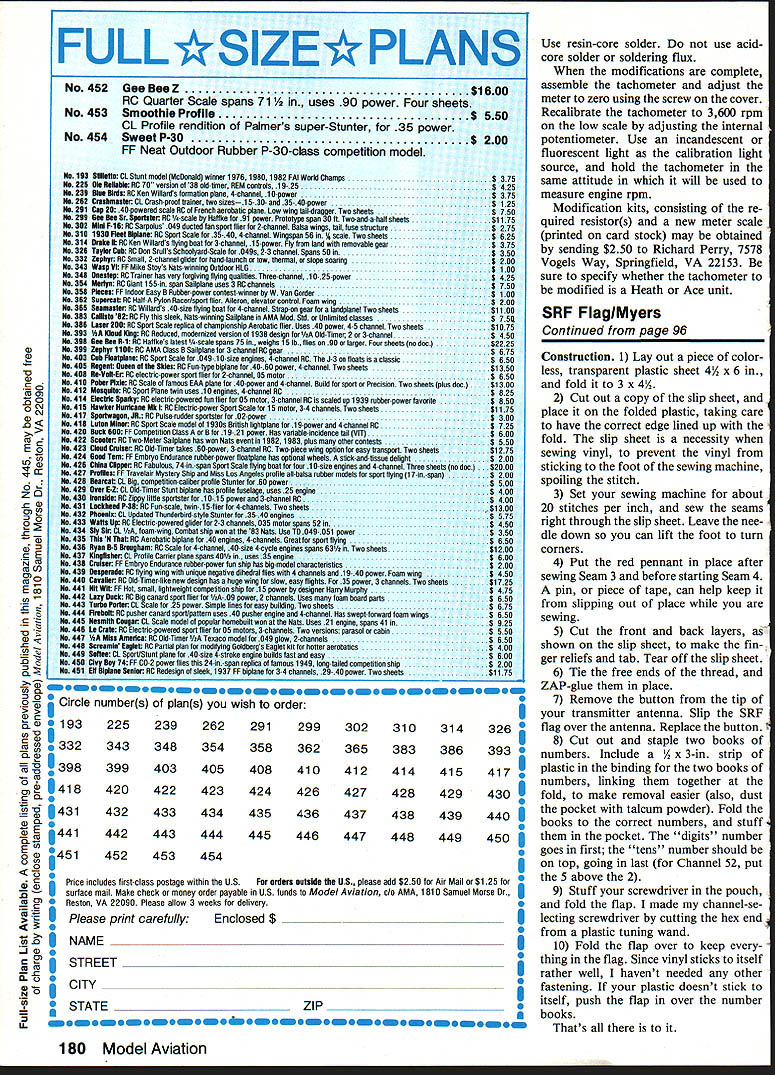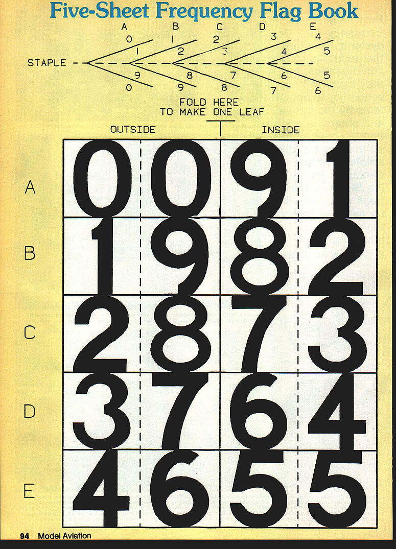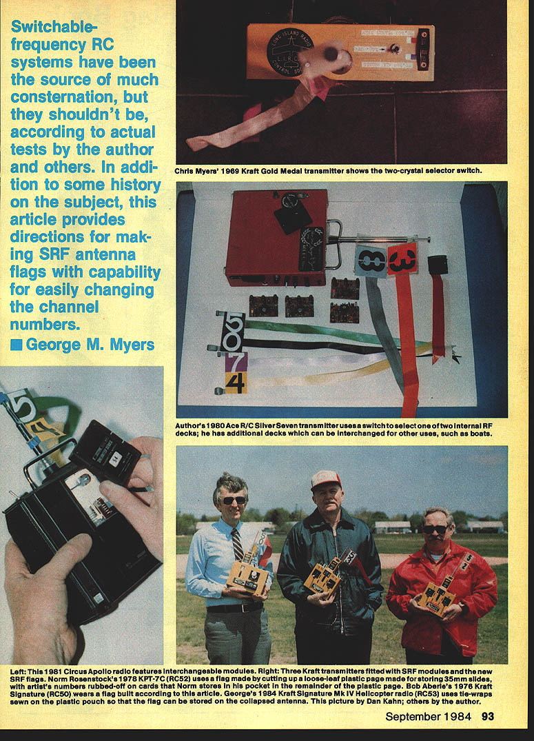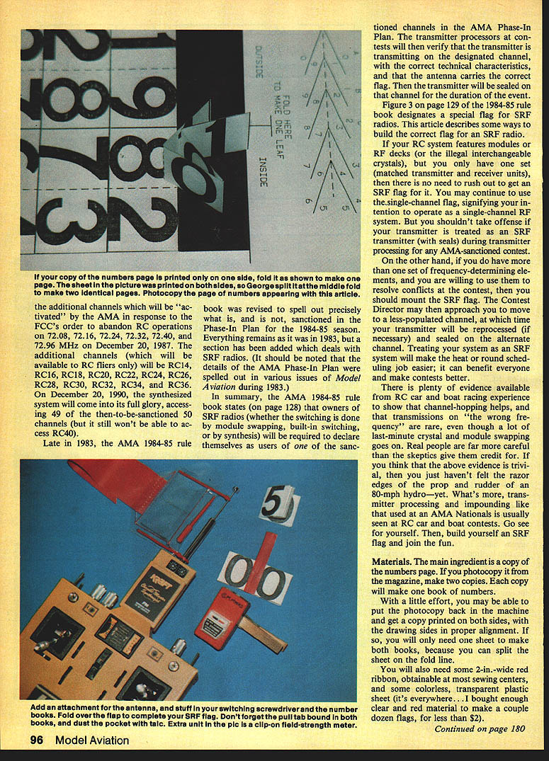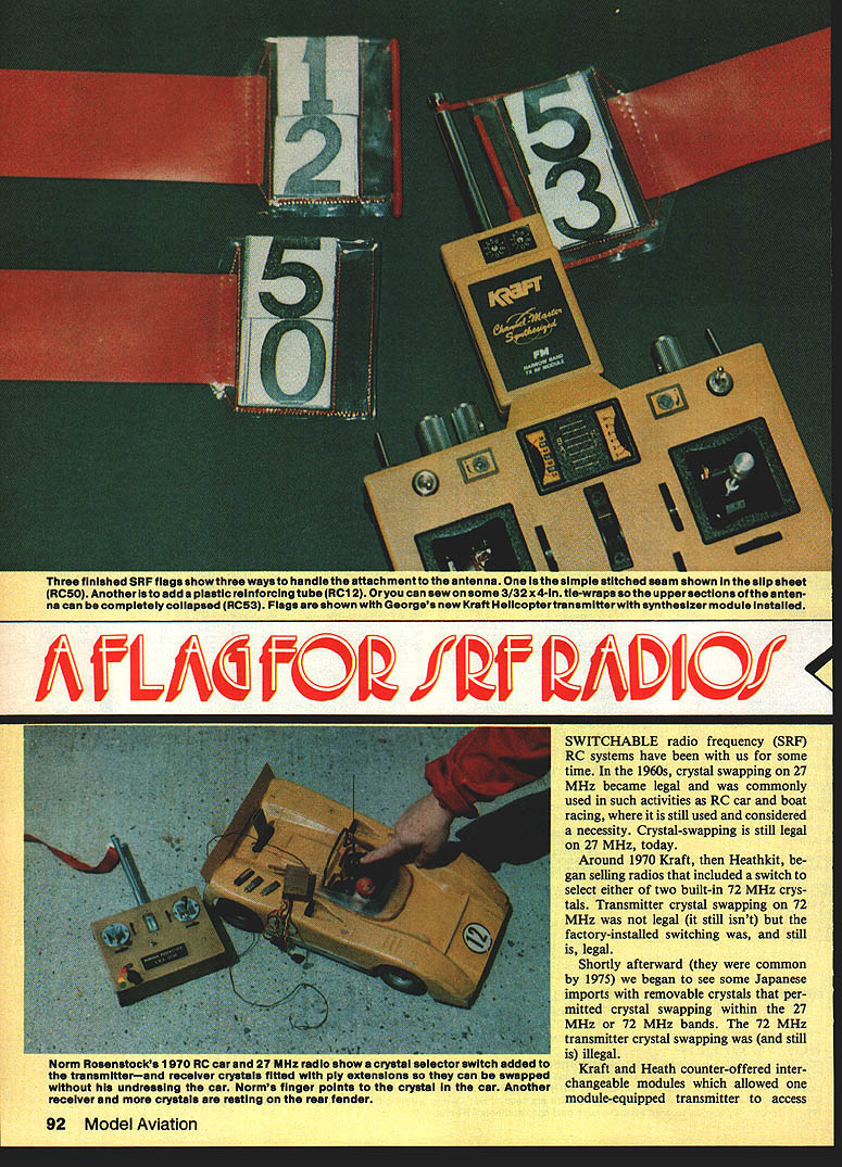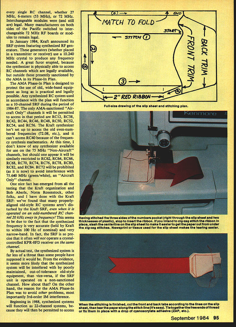 Three itnisnea SKF flags snowtnree wayeto nancie ins auacnmenuo antenna une simpie smonea seam Shown lfl slip sheet RC5O Anotheristo add plastic relnforclngtube RC1 2 Oryou can sew some 3/32 x4-in tIe-wraps sothe uppersectlons anten na can completely collapsed RC53 Flags shawnwlth Georges new Kraft Hellcoptertransmltterwith syntheslzermodule Installed SWITCHABLE radio frequency SRF RC systems have us some time 1960s crystal swapping 27 MHz became legal commonly used such activities RC car boat racing still used considered necessity Crystal-swapping still legal 27 MHz today Around 1970 Kraft Heathkit gan selling radios included switch select either two built-in 72 MHz crys tals Transmitter crystal swapping 72 MHz legal still isnt factory-installed switching still legal Shortly afterward common 1975 began see some Japanese imports removable crystals per mitted crystal swapping within 27 MHz 72 MHz bands 72 MHz transmitter crystal swapping still illegal Kraft Heath counter-offered inter changeable modules allowed module-equipped transmitter access 92 Model Aviation Norm Rosenstocks 1970 RC car 27MHZ radIo ahowa crystal selector switch added transmitterand receiver crystals fitted ply extensions can swapped hIs undressIng car Norms finger points crystal car Another receiver crystals restIng rear fender Switchable frequency RC systems have source much consternation shouldnt according actual tests author others addi tion some history subject article provides directions mak ing SRF antenna flags capability easily changing channel numbers George M Myers hen 198 iurGus Apollo radio features interchangeable modules Right Three Krafttransmlttersfltted SRF modules new SRF flags Norm Rosenstocks 1978 KPT7CRC52 useaa flag made bycutting ups icose-icaf plastic page madeforstoring3omm slides artists numbre rubbed-off cards Norm stores pocket remainder piastic page Bob Abodes 1976 Kraft Signature RC5O weare hag built according article Georges 1984 Kraft Signature Mk IV Helicopter radio RC53 uses tie-wraps sewn plastic pouch sothst flag can stored collapsed antenna picture Dan Kahn others author September 1984 93 inrls uyere 1 WV ran uoua risasm ransmmer snows ns iwvrysia seuwr swifun decks has additionai decks can interchanged other usee such boats Flag 0 Five-Sheet FrequencyBook ABCE oI24 245 STAPLE98765 o9 876 FOLD HERE TO MAKE ONE LEAF 1 OUTSIDE H H-HINSIDE H-4-4---H-94 Model Aviation C D E single RC channel whether 27 MHz 6-meters 53 MHz 72 MHz Interchangeable modules still legal manufacturers both sides Pacific switched inter changeable 72 MHz RF boards mod ules remain legal January 1984 Kraft announced its SRF system featuring synthesized RF gen erators generators whether placed transmitter receiver use 10240 MHz crystal produce frequency needed great furor erupted because synthesizer physically able access RC channels legally available outside presently sanctioned AMA its Phase-In Plan AMA Phase-In Plan designed protect use old wide-band equip ment long practical legally possible Any synthesized RC system used accordance plan will function 10-channel SRF during period 1984-87 AMA-sanctioned Air craft Only channels will permitted access period RCl2 RC38 RC42 RC44 RC46 RC48 RC5O RC52 RC54 RCS6 Kraft synthesizer isnt set up access old even-num bered frequencies 7208 etc cant access RC4O because frequen cy synthesis mathematics time dont know synthesizer available use 75 MHz Non-Aircraft channels should appear will similarly restricted RC62 RC64 RC66 RC68 RC7O RC74 RC76 RC78 RC8O RC82 RC84 RC72 will prohibited now avoid interference 75640 MHz green/white Aircraft Only channel nice fact has emerged testing Kraft organization Bob Aberle Norm Rosenstock other folks have done Kraft SRF weve found properlyaligned old-style RC systems arent dis turbed Kraft SRF operated odd-numbered RC chan nel 20 kHz away frequency seems due fact synthesized frequency very accurate held Kraft within 100 Hz nominal very narrow-band fact SRF pre cise often will operate crystalcontrolled KPR-8FD receiver same channel actual test synthesized system far less threat some people have supposed would evidence seems likely synthesized system will interfered poorly maintained out-of-tolerance old-style equipment vice-versa SRF unit operated non-sanctioned channel about other hand reason AMA Phase-In Plan avoid other problems importantly 3rd-order IM interference Beginning 1988 synthesized systems will function 22-channel systems cause will permitted access Full-sIze drawing slip sheet stitching plan September 1984 95 ao AL4TCI4 FOLD 3T4CT 2 RED RD8964 Having stitchee taree ama 0TTflO numDeU pocket right through slip sheet two thicknesses plastic stop Insert ribbon intend zig-zag stitch ribbon place stash centerline slip sheetto make easierto get paperoutfrom under zig-zag stitches Newsprint tissue used slip sheet makes tearing easter stitching finished cut front back tabs according lines slip sheet thentearthe paperaiongthe stitch iineltseasyTietogetherthefreeendsofthread fix place drop cyanoacrylate adhesive ZAP etc additional channels will ac tivated AMA response FCCs order abandon RC operations 7208 7216 7224 7232 7240 7296 MHz December 20 1987 additional channels will available RC filers will RCl4 RCl6 RCl8 RC2O RC22 RC24 RC26 RC28 RC30 RC32 RC34 RC36 December 20 1990 synthesized system will come its full glory access ing 49 then-to-be-sanctioned 50 channels still wont able ac cess RC4O Late 1983 AMA 1984-85 rule book revised spell out precisely what is sanctioned Phase-In Plan 1984-85 season Everything remains 1983 section has added deals SRF radios should noted details AMA Phase-In Plan spelled out various issues Model Aviation during 1983 summary AMA 1984-85 rule book states page 128 owners SRF radios whether switching done module swapping built-in switching synthesis will required declare themselves users sanc 96 Model Aviation tioned channels AMA Phase-In Plan transmitter processors con tests will verify transmitter transmit