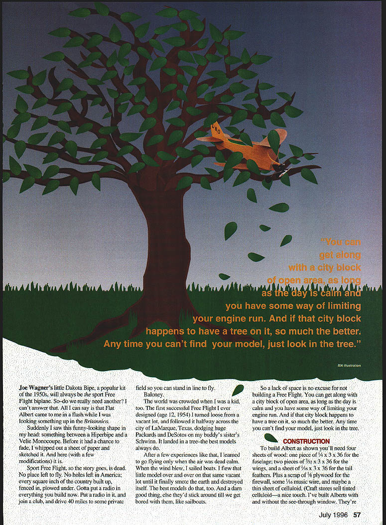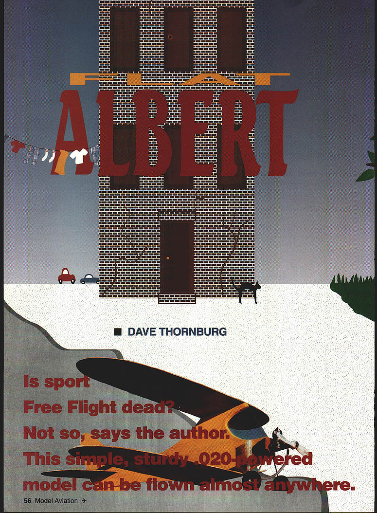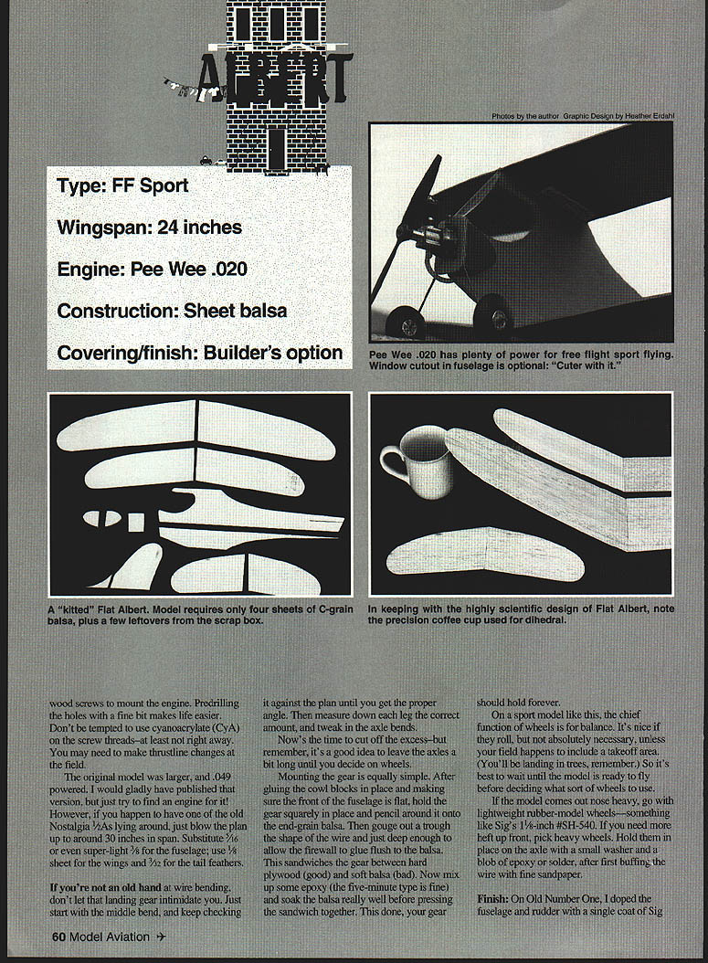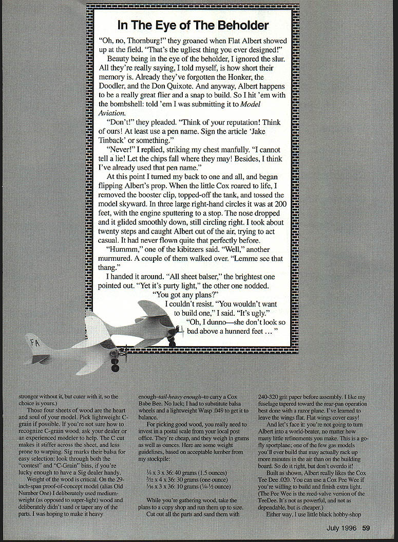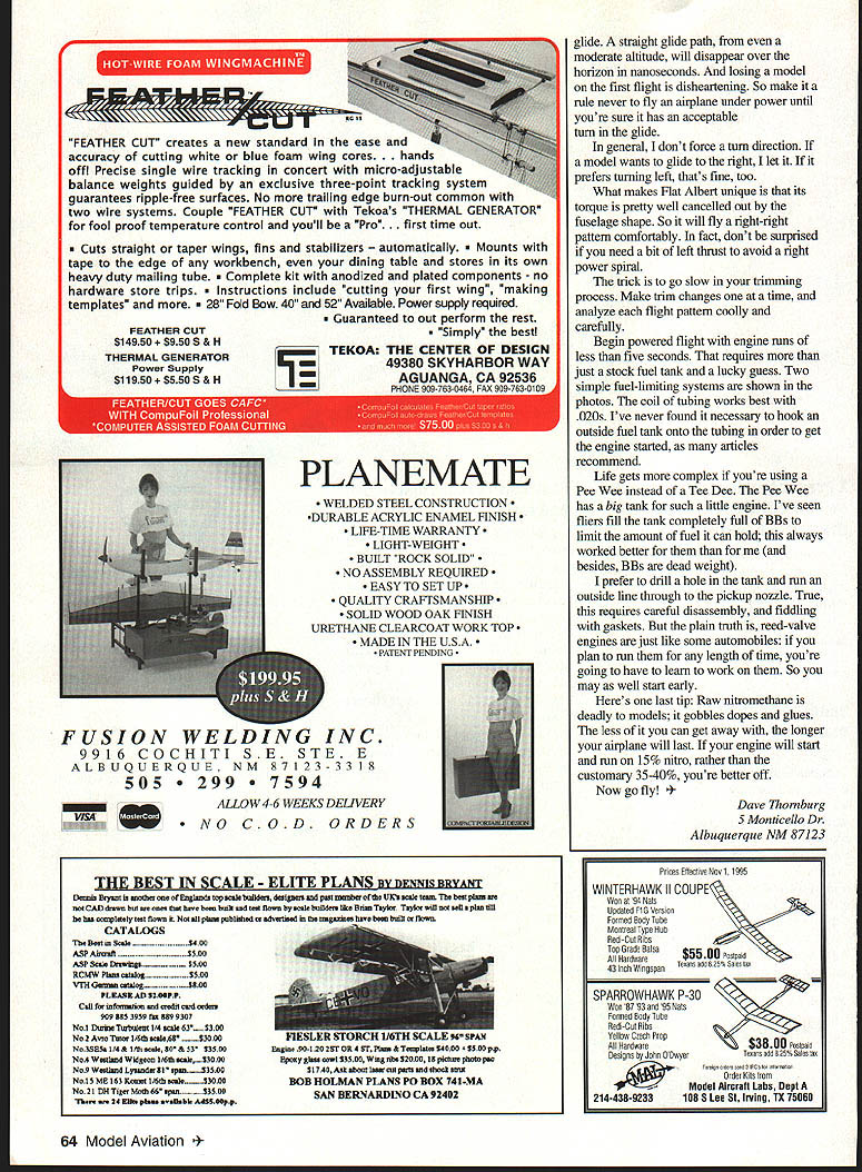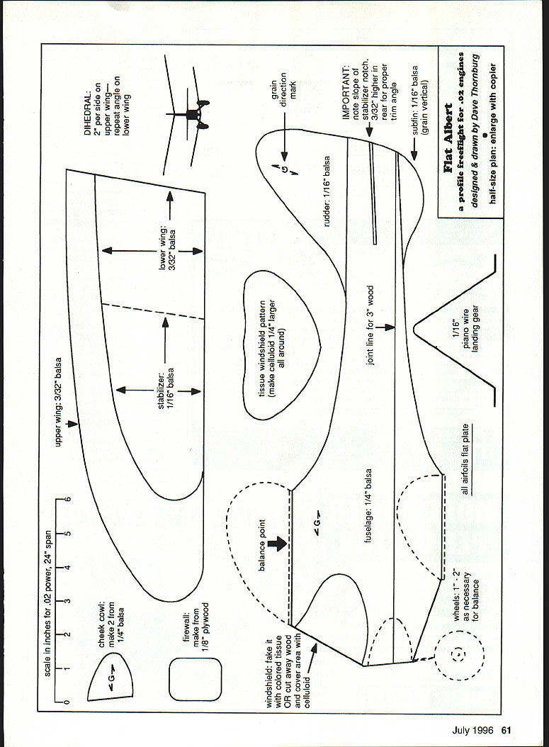 U DAVE THORNBURG q S Joe Wngners little Dakota Bipe pQpular kit 1950s will always sportFree Flight biplane So-do really need another cant answer cn say Flat Albert came flash lookingsomething up Britdnnica Suddenly saw funny-lodking shape heath something betweena Hiperbipe Velie Monocoupe Before t chance fade whipped out sheet paper sketched few modifications Sport Free Flight story goes dead No place left fly No holes left America square inch country built up fencedin plowed under Gotta put radio everything build now Put radio join cab drive 40 miles some private field can stand line fly Baloney world crowded kid too first successful Free Flight lever designed age 12 19541 turned loose vacant lot followed halfway across city Lalvlarque Texas dodging huge Packards DeSotos buddys sisters Schwinn landed treethe best models always After few experiences like learned go flying air dead calm wiiid blew sailed boats flew little model over over same vacant lot until finally smote earth destroyed itself best models too darn good thing else theyd stick around till get bored like sailboats So lack space no excuse building Free Flight can get along city block open area long theday calm have some way limiting engine run city block happeas have tree much bettur Any rime cant find model just look tree CONSTRUCON build Albert shown youll need four sheets wood piece x 3 x 36 fuselage two pieces 3A2 x 3 x 36 wings sheet 3/is x3 x 36 tail feathers Plus scrap ood firewall some /u music wire maybe thin sheet ofcelluloid Craft stores sell tinted celluloida nice touch Ive built Alberts see-through window Theyre July 1996 57 Eye Beholder Oh no Thornburg groaned Flat Albert showed up field Thats ugliest thing ever designed Beauty being eye beholder ignored slur theyre really saying told myself short memory Already theyve forgotten Honker Doodler Don Quixote anyway Albert happens really great flier snap build So hit em bombshell told em submitting Model Aviation Dont pleaded Think reputation Think least use pen name Sign article Jake Tinback something Never replied strildng chest manfully cannot tell lie Let chips fall may Besides think Ive already used pen name point turned back and began flipping Alberts prop little Cox roared life removed booster clip topped-off tank tossed model skyward three large right-hand circles 200 feet engine sputtering stop nose dropped glided smoothiy down still circling right took about twenty steps caught Albert out air trying act casual never flown quite perfectly before Hummm kibitzers said Well another murmured couple walked over Lemme see thang handed around sheet balser brightest pointed out Yet its purty light other nodded got plans couldnt resist wouldnt want build said Its ugly Oh dunnoshe dont look bad above hunnerd feet. Type FF Sport Wingspan 24 inches Engine Pee Wee 020/ Construction Sheet balsa Coverir scale inches 02 power 24 span IIIIIII 0123456 upper wing 3/32 balsa DIHEDRAL 2 per side upper wing repeat angle lower wing cheek cowl make 2 1/4 balsa firewall make 1/8 plywood windshield fake colored tissue OR cut away wood cover area celluloid balance point Jr tissue windshield pattern make celluloid 1/4 larger around / fuselage 1/4 balsa ls1-2 Ij necessary -for balance joint line 3 wood IMPORTANT note slope stabilizer notch higher rear proper trim angle 4 subfin 1/16 balsa grain vertical airfoils flat plate 1/16 piano wire landing gear Flat Albert profile freeflight 02 engines designed & drawn Dave Thornburg S half-size plan enlarge copier D -I A.5 grain direction mark / X9 ~yecWL ic Catalog #37 Si1 enWttVI inete&Spring 1996 Its Rubber Power Wonder Peck-Polymers Areographics Nowlen Aero West Wings Lee RIN Send $400 Catalog #37 New items 1996 eck-PeImers P0 Box 710399-MA PSantee CA 92072-0399 Phone 619 448-1818Fax 619 448-1833 per parts stocked Ohio location engine 4 competition engines use same crankcase __ Find out what everybodys talking about Call now order Northern Velocity Ltd800 665-9575 3656 State Road Cuyahoga Falls Ohio 44223330 9236904 FAX 330 923-4349 __________________________________MCNISA/ S & H $400 size order US DISIAMEX OH Res add 575% tax Lemon Yellow grain showed through fine masked fuselage sprayed Pactra Flat Tan wings stabagain just coat After day drying sprayed Pactra Formula-U Clear Varnish over everything extra fuel-proofing did exactly very best reasons happened liquids hand time Ive flown models like Albert totally rawno finish very long absorb castor oil exhaust eventually get too tail-heavy fly other extreme prettiest finishes done colored tissue butyrate dope Put full-strength coat clear over wood sand lightly add another coat youre laying tissue place doping down Follow up two four coats cut 50% thinner youre ready fly knowdope stinks youd rather avoid try colored LiteSpan Hobby Lobby 5614 Franldin Park Circle Brentwood TN 37027 Tel [615] 3731444 Use cement follow instructions youll come out lovely lightweight finish looks like took hours Flying To get Albert air sure balances prop point pretty close arrow shown plans cant find grass weeds toss model make first test glides close groundsay kneeling position may have warp stub trailing edges up down slightly get long smooth glide Remember warp equally theyll act ailerons inducing unwanted turn nutshell philosophy Free Flight trimming Trim glide first teach abide engine model must have some turn 62 Model Aviation RO SPARK MICROPROCESSOR ELECTRONIC flMING CONTROL EASY TO INSTALL PLUGS BETWEEN YOUR PULSE SWITCH AND IGN SYSTEM OVING PARTS TO WEAR OUT OR GET OUT OF ADJUSTMENT SPARK TIMING WITH EACH ENGINE REVOLUTIGN COMPLETELY STABLE TIMING IS ROCK SOLID AND DOES NOT JUMP AROUND RETRO FIT TO MOST ALL BRANDS OF ADD-ON IGNITION SYSTEMS WITH HALL EFFECT TRIGGER WILL NOT WORK WITH REICHMUTH OR PRO SPARK SYSTEMS ii i i IL1 hI NORVEL AME 049 MKII NORVEL AME 049 DIESEL NORVEL AME 061 MKII NORVEL AME 061 DIESEL NOR VEL AME ENGINES DIESEL HEAD- 1 \AV RP E BEAM MOUNT SOLID BRASSCOMPATIBLE WITH EIkIVE LiT