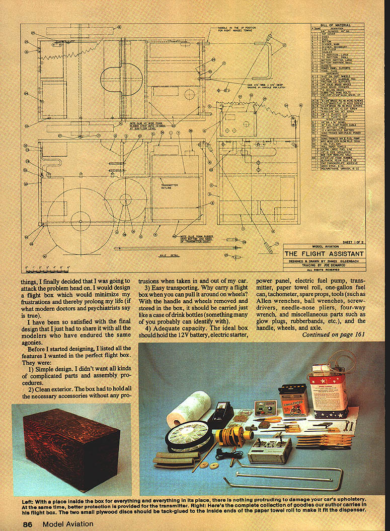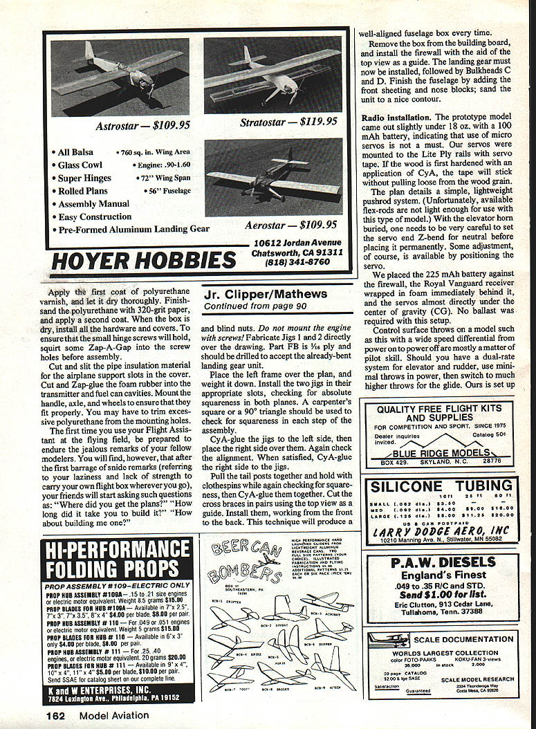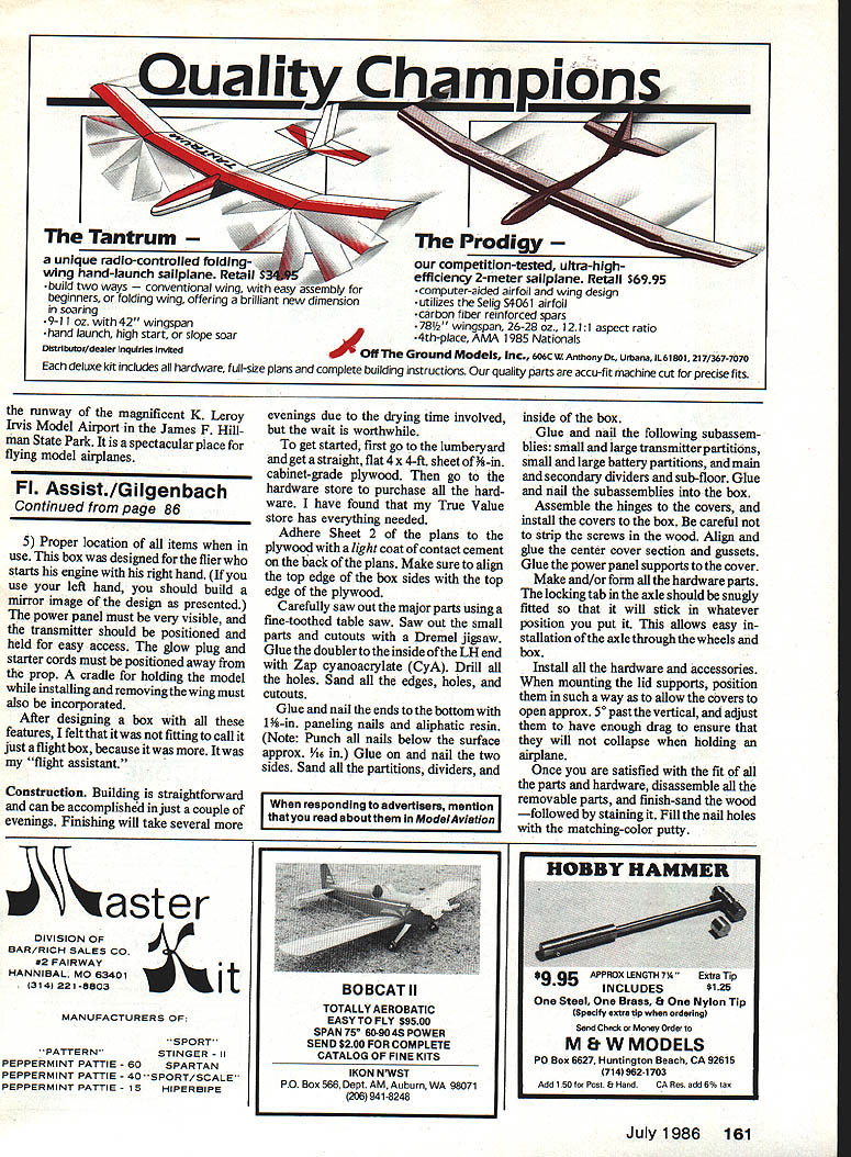 NO OCR TEXT NO OCR TEXT runway magnificent K Leroy Irvis Model Airport James F Hillman State Park spectacular place flying model airplanes Fl Assist/Gilgenbach Continued page 86 5 Proper location items use box designed flier starts engine right hand use left hand should build mirror image design presented power panel must very visible transmitter should positioned held easy access glow plug starter cords must positioned away prop cradle holding model installing removing wing must also incorporated After designing box features felt fitting call just flight box because was flight assistant Construction Building straightforward can accomplished just couple evenings Finishing will take several evenings due drying time involved wait worthwhile get started first go lumberyard get straight flat 4 x 4-ft sheet of-in cabinet-grade plywood go hardware store purchase hard ware have found True Value store has everything needed Adhere Sheet 2 plans plywood light coat contact cement back plans Make sure align top edge box sides top edge plywood Carefully saw out major parts using fine-toothed table saw Saw out small parts cutouts Dremel jigsaw Glue doubler inside LH end Zap cyanoacrylate CyA Drill holes Sand edges holes cutouts Glue nail ends bottom 1-in paneling nails aliphatic resin Note Punch nails below surface approx Yi6 Glue nall two sides Sand partitions dividers inside box Glue nail following subassem blies small large transmitter partitions small large battery partitions main secondary dividers sub-floor Glue nail subassemblies box Assemble hinges covers install covers box careful strip screws wood Align glue center cover section gussets Glue power panel supports cover Make and/or form hardware parts locking tab axle should snugly fitted will stick whatever position put allows easy stallation axle through wheels box Install hardware accessories mounting lid supports position such way allow covers open approx 50 pastthe vertical adjust have enough drag ensure will collapse holding airplane Once satisfied fit parts hardware disassemble removable parts finish-sand wood followed staining Fill nail holes matching-color putty DIVISION OF BAR/RICH SALES Co #2 FAIRWAY HANNIBAL MO 63401 314221-8803 MANUFACTURERS OF SPORT PATTERNSTINGER Ii PEPPERMINT PATTIE 60SPARTAN PEPPERMINT PATTIE 40SPORT/SCALE PEPPERMINT PATTIE 15HIPERBIPE July1986 161 QualityCh -a2 \\d. ________________The Prodigy V unique radio-controlled foldIng-our competition-tested ultra-highwing hand launch sailplane Retailefficiency 2-meter sailplane Retail S6995 build two ways conventional wing easy assembly forcomputer-aided airfoil wing design beginners folding wing offering brilliant new dimension utilizes Selig S406 airfoil soaringcarbon fiber reinforced spars 9-Il oz 42 wingspan78Y wingspan 26-28 oz. 1211 aspect ratio hand launch high start slope soar4th-place AMA 1985 Nationals Distributor/dealer inquiries invited Off Ground Models Inc 6O6CWAnthonyDr. urbane IL6iSOl217/367-7070 deluxe kit includes hardware full-size plans complete building instructions quality parts accu-f machine cut precise fits responding advertisers mention read about ModelAviation aster HOBBY HAMMER BOBCAT II TOTALLY AEROBATIC EASY TO FLY $9500 SPAN 75 60904S POWER SEND $200 FOR COMPLETE CATALOG OF FINE KITS IKON NWST PO Box 566 Dept AM Auburn WA 98071 206 941-8248 nu e4Ufl / cxtra up INCLUDES*125 Steel Brass n Tip iSpecify extra tip ordering Send Check Money Order M&WMODELS P0 Box 6627 Huntington Beach CA 92615 17141962-1703 Add 150 Post HandCA Res add 6% tax Balsa 760 sq Wing Area Engine 90-160 Glass Cowl Super Hinges Rolled Plans 72 Wing Span 56 Fuselage Assembly Manual Easy Construction Pre-Formed Aluminum Landing Gear HOYER HOBBIES Apply tb first coat polyurethane varnish let dry thoroughly Finishsand thepolyurethane 320-grit paper apply second coat box dry install hardware covers ensure small hinge screws will hold squirt some Zap-A-Gap screw holes before assembly Cut slit pipe insulation material airplane support slots cover Cut Zap-glue foam rubber transmitter fuel can cavities Mount handle axle wheels ensure fit properly may have trim exces sive polyurethane mounting holes first time use Flight Assis tant flying field prepared endure jealous remarks fellow modelers will find however after first barrage snide remarks referring laziness lack strength carry own flight box wherever go friends will start asking such questions did get plans long did take build about building Jr Clipper/Mathews Continued page 90 blind nuts mount engine screws Fabricate Jigs 1 2 directly over drawing Part FR 1/16 ply should drilled accept already-bent landing gear unit Place left frame over plan weight down Install two jigs appropriate slots checking absolute squareness both planes carpenters square 900 triangle should used check squareness step assembly CyA-glue jigs left side place right side over Again check alignment satisfied CyA-glue right side jigs Pull tail posts together hold clothespins again checking square ness CyA-glue together Cut cross braces pairs using top view guide Install working front back technique will produce c5~f EASTERS PA 7x 3 7x 35 8x 4 $400 per blade $800 per pair PlOP HUB ASSEMBLY U 110 049 051 engines electric motor equivalent WeightS grams $1500 PROP BLADES FOR HUB 8 110 lable 6x 3 $400 per blade $800 per pair PROP HUB ASSEMBLY 8 111 0 engines electric motor equivalent 20 grams$2000 PlOP BLADES FOR HUB 8 111 lable n 9 x 4 10 x 4 lix 4 $500 per blade $1000 per pair Send SSAE tor catalog sheet complete line AlAN pIRPORBANCE 0*50 LAUNdIEO GLINERS PROM LIGMTREICMT ALUMINUM BEVERAGE CANS TWO PALL SIZE PATTERNS YOUR COOICE ILLASTRATBO PABBICATIAN ANN PLYING ISSTNACTIONS NRO AMOITIONAL PATTERNS $125 EACO OR SIA PACE PICK NB BCE-i ornp ~7QB well-aligned fuselage box time Remove box building board install firewall aid top view guide landing gear must now installed followed Bulkheads C D Finish fuselage adding front sheeting nose blocks sand unit nice con