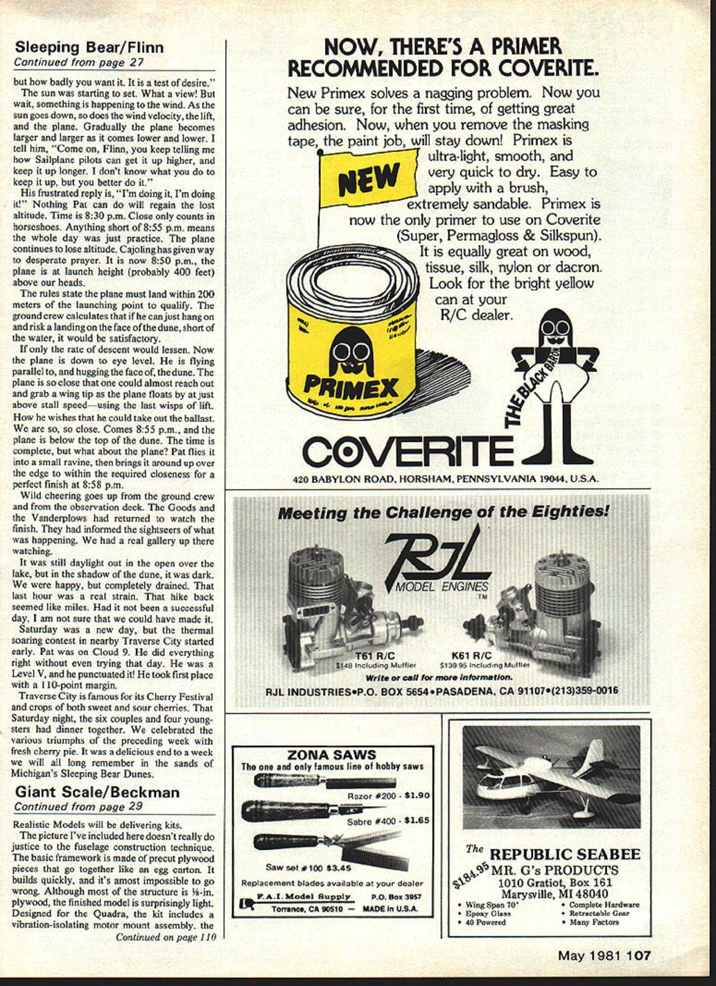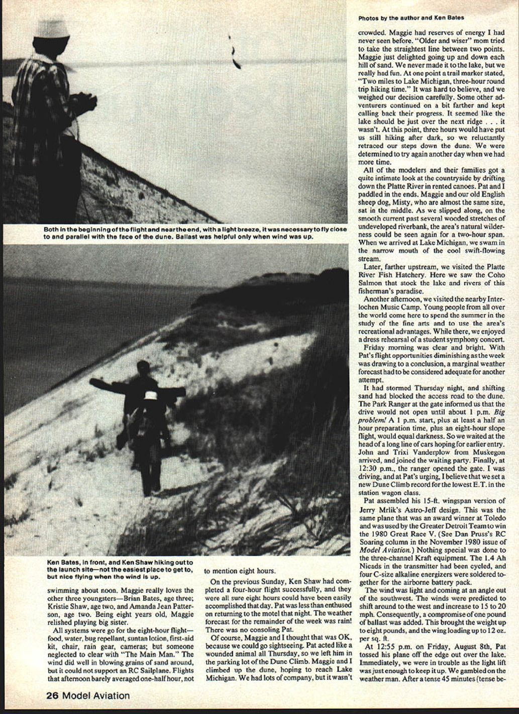 For first time tne gruelling eight hours lb-ft span Astro-Jeff turned darkening face Sleeping uear uune LUKU gan committed land has just enough speed boost up shallow ravine before doing Dune 320 ft above water EIGHT-HOUR slope flight last task needed husband Pat achieve League Silent Flight Level V gotten LSF Soaring Accomplishments Program urging 1976 tasks graduated difficulty Level through V never beyond skills flier has time As performance level accomplished voucher sent Chicago office return mail pilot receives another challenges skills progress higher level Pat working Level V tasks almost two years finding quite impos sible very very challenging planned family trip home Dearborn MI what reported best slope soaring site Midwest Sleeping Bear Dunes Lakeshore National Park park located northwest corner Michigans lower peninsula stage hoped set success drive across state enjoyable stopped spent couple days relaxing college roommates parents Durkees Fremont wandered up lake shore making lots stops Pat kept looking high cliffs suitable slope soaring As neared dune area stopped Platte River KOA weather report two modeling couples camping Ann Arbor areaKen Ruth Bates Ken Barb Shaw Wednesday supposed good Plan give try next morning Wednesday August 6th 10 am Onward motel right entrance Pierce Stocking Scenic Drive access road up dune observation point near would flying found Karen Don Patterson same motel eating supper cleared Plan systems go next morning flat-landers met dunes first time us awe somely dramatic Several times way distance past continental glaciers spread over area blanketing millions tons ice vast sheets glaciers made unmade melted ancestors Great Lakes formed prevailing west wind sweeps unobstructed across Lake Michigan building up speed force crosses miles open water Striking steep shoreline bluffs high overlooks rise 320 feet 98 meters above Lake Michigan creates tremendous slope lift As walked along edge steep bluff wind blowing stinging sand thrown faces daughter Maggie thought playing sand would just fine relieved enduring whole hoped-for eighthour flight other moms took May1981 25 swimming about noon Maggie really loves other three youngstersBrian Bates age three Kristie Shaw age two Amanda Jean Patter son age two Being eight years old Maggie relished playing big sister systems go eight-hour flight food water bug repellant suntan lotion first-aid kit chair rain gear cameras someone neglected clear Main Man wind did well blowing grains sand around could support RC Sailplane Flights afternoon barely averaged one-half hour mention eight hours previous Sunday Ken Shaw com pleted four-hour flight successfully sure eight hours could have easily accomplished day Pat less enthused returning motel night weather forecast remainder week rain no consoling Pat course Maggie thought OK because could go sightseeing Pat acted like wounded animal Thursday left him parking lot Dune Climb Maggie climbed up dune hoping reach Lake Michigan lots company wasnt Photos author Ken Bates crowded Maggie reserves energy never seen before Older wiser mom tried take straightest line between two points Maggie just delighted going up down hill sand never made lake really fun point trail marker stated Two miles Lake Michigan three-hour round trip hiking time hard believe weighed decision carefully Some other ad venturers continued bit farther kept calling back progress seemed like lake should just over next ridge snt point three hours would have put us still hiking after dark reluctantly retraced steps down dune determined try again another day time modelers families got quite intimate look countryside drifting down Platte River rented canoes Pat paddled ends Maggie old English sheep dog Misty almost same size sat middle As slipped along smooth current past several wooded stretches undeveloped riverbank areas natural wilder ness could seen again two-hour span arrived Lake Michigan swam narrow mouth cool swift-flowing stream Later farther upstream visited Platte River Fish Hatchery saw Coho Salmon stock lake rivers fishermans paradise Another afternoon visited nearby Inter lochen Music Camp Young people over world come spend summer study fine arts use areas recreational advantages enjoyed dress rehearsal student symphony concert Friday morning clear bright Pats flight opportunities diminishing week drawing conclusion marginal weather forecast considered adequate another attempt stormed Thursday night shifting sand blocked access road dune Park Ranger gate informed us drive would open until about 1 pm Big problem 1 pm start plus least half hour preparation time plus eight-hour slope flight would equal darkness So waited head long line cars hoping earlier entry John Trixi Vanderplow Muskegon arrived joined waiting party Finally 1230 pm ranger opened gate driving Pats urging believe set new Dune Climb record lowest ET station wagon class Pat assembled 15-ft wingspan version Jerry Mrliks Astro-Jeff design same plane award winner Toledo used Greater Detroit Team win 1980 Great Race V See Dan Prusss RC Soaring column November 1980 issue Model Aviation Nothing special done three-channel Kraft equipment 14 Ah Nicads transmitter cycled four C-size alkaline energizers soldered gether airborne battery pack wind light coming angle out southwest winds predicted shift around west increase 15 20 mph Consequently compromise pound ballast added brought weight up eight pounds wing loading up 12 oz per sq ft 125 5 pm Friday August 8th Pat tossed plane off edge out over lake Immediately trouble light lift just enough keep up gambled weather man After tense 45 minutes tense be26 Model Aviation otn inc beginning OTTflC riigni ana nearine eno wmsn aIgnt breeze iwas necussuryio Tiny wusc parallel face dune Ballast helDful wind UD Ien sates tront Ien Snaw fliKing Out launch sitenot easiest place get nice flying wind up cause such late start attempt would possible comfortable height attained slope began work rising shifting w