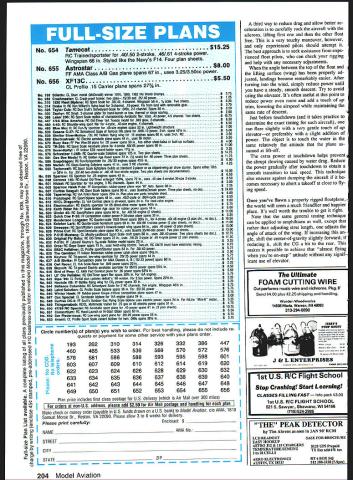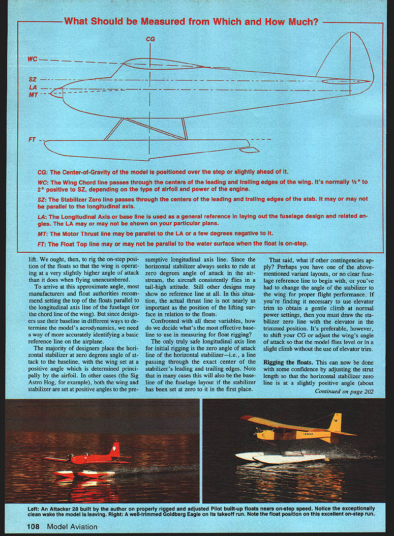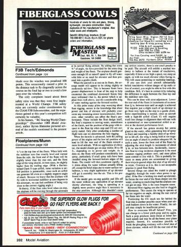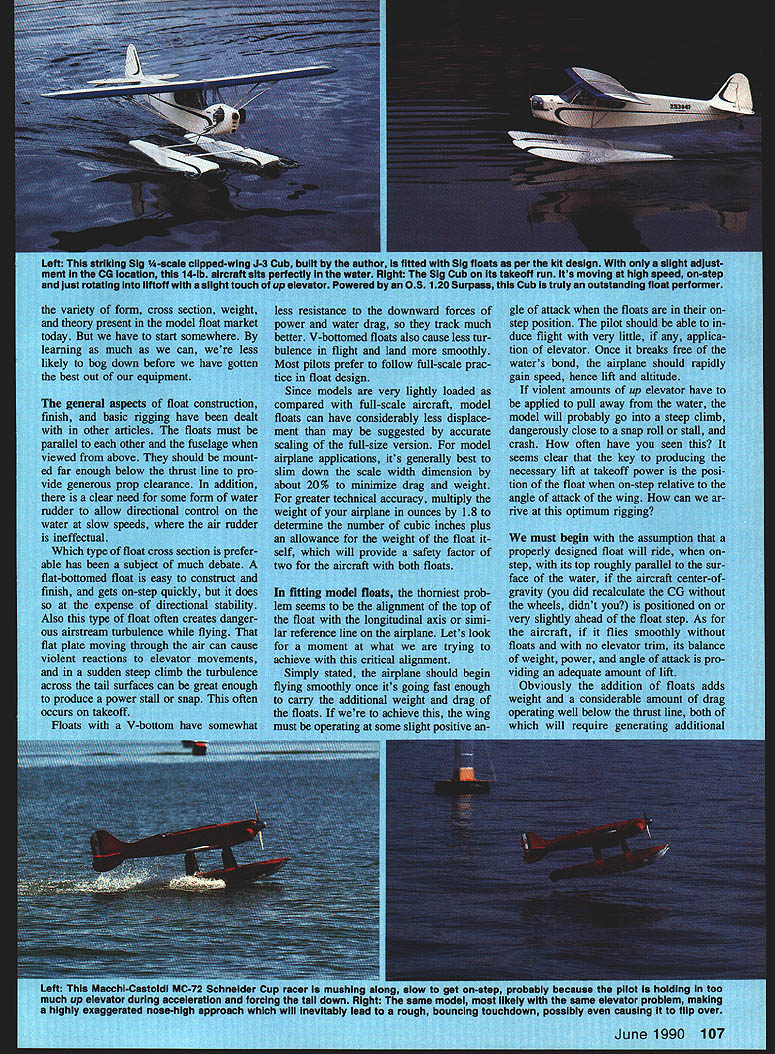 m RTICLESins toon floatj will reveir rvelo itlv diffeiarato off oint se oftenand decide models reasc muca ii strike Ui craft have standai di Mn e cran will w load-cam down rest Qac flJ NO OCR TEXT hat CG The Center-of-Gi WC The Wing Chord 2 positive SZ Stabilizer parallel Longitu4 LA may MT The Motor Thri FT The Float Top un ought ne floats ry slightly higi flying appro ers float ig top th idinal axis line o line winz baseline models aerocyr re accurately id ne airplar iN designers zero eline win [rfoil ot example set positive over sti nd power 0 mrs lea mneral refe cular plans few di water mu adinal axis li ser always S4 angle attac craft consistei Still ice line thrust line ie position floats vhats mosi measuring ly safe longit g zero zontal stabiii igh exact sding tr ases will selage layout zero Much Its normal stab may design re other cont1 o negin wi angle tha r flight t uecessarv gentle swith pr adjust model out use oats C2fl ifidence hon slightly titude over winches penalized 100 points occasionally caused pilot distance task fly diagonally across course final lap two avoid low pass over winches complaint heard about safety rules first imple mented World Champs F3B safety rules currently under consideration ClAM F3B Subcommittee expe rience gained years competition will certainly valuable feature RC Soaring World Cham pionships December 1989 Model Avia tion author Byron Blakeslee pictured sev eral models mentioned present article Floatplanes/Munn Continued page 108 0 top line floats held stabilizer zero line exactly level viewed side front end floats will slightly lower rear end front edge wing should cases slightly higher trailing edge flat-bot tomed Clark-Y-type airfoil some variation air foil position permissible since such airfoil can generate lift slightly negative angle attack Because know airplane will fly its horizontal stabilizer zero degrees airstream can feel confident being very close correct rigging angle theory float rides level on-step airplane will moving through airstream its normal flying attitude adding extra 0 angle have provided extra drag weight floats airplane should gen erate enough lift takeoff speed fly off water little no need elevator pro ceed gentle climb aircraft rest its floats av erage model will appear sitting slightly moderately tail-low because floats have greater displacement front step help counteract combined downward forces must withstandthat power ap plied well above considerable drag water rushing against forward section point pilots stop worrying about float rigging secure knowledge sheer power lots elevator will probably over come remaining minor inconsistencies ever other variables can affect floats per formance include float design itself floats response moving water smoothness finish position prop re spect float tip step CG cor rectly mated Only after conducting number flight tests can determine best rigging throttle advanced both pulling power engine low tail position will tend lift rear end floats toward level attitude no application eleva tor model should get on-step within 30 50 ft depending its power weight As does floats will produce considerably less spray particularly small spray rails have installed along forward bottom edges floats model will accelerate rapidly skims along water actually lifting off except brief skips due water surface tur bulence very slight application up elevator will get smoothly air pre ferred trim model gets on-step quickly lifts off water application up elevator shortly afterward wing operating slightly positive angle necessary step position Although shouldnt cause THE SUPERIOR GLOW PLUGS FOR GO FAST FLYERS ARE BACK! Puts sting engine Unique flat-wound spiral coil element high temperature glass-to-metal seal add up faster ignition increased RPM 1/2A GloBee plugs designed exclusively 049/051 Cox engines Ask new GB-5RX Speed Plug GB-5R Racing Plug GB-5P Sport Plug local dealer today unavailable locally write call Twinn-K collect pricing delivery information FREE GloBee Catalog MAKE THE GLOBEE / INDY CONNECTION Twinn-K Inc 10296 W Washington St Indianapolis IN 46231 Telephone 317-839-6579 FAX 317-839-8928 ing Span 81 Engine 9015 2cyc Wing Area 1100 sq 1218 4cyc Machine Cut Wood Kit including wire londing gear & wing 1aining hdwe VISA & MC accepted $120 Add 500 post & handling Add 300 COD Ohio residents add 60% tax free Catalog send SASE Air Flair1513-878-7487 PQ Box 2075 Foirborn Ohio 45324 serious worries small penalty paid aircraft will exhibit marked ten dency balloon instant touchdown especially done too high speed too steep angle too much elevator flaring will cause porpoising multiskip landings can slow aircraft substantially before touchdown danger tip stalls loss control might able live condition Still its best correct reducing difference angle between float top stabilizer zero line can done strut adjustment Lower rear end floats increments no % between tests until angle achieved requires just slight touch up elevator go very light step gentle climb Some experimenting needed since aircraft high-lift airfoil Clark Y will require much less change alignment will symmetrical near-symmetrical airfoil ar rive desired performance level aircraft has gotten on-step seems glued water often generating lots spray front requiring healthy dose up eleva tor lift off wing being held too nega tive angle attack produce adequate lift such case lower front end floats adjusting strut length increments about / less between tests Incidentally inaccu rate float-to-wing incidence alignment common rigging problem seen pilots seem content live probably cause pilots accustomed giving tricycle-geared ships shot up elevator rotate Common acceptable practice good float flying Several things can cause model plough sluggishly through water power ap plied flier holding too much up elevator forces rear end floats deeper water creating much drag airplane can get on-step frequent cause Reversed float rigging can also lead sluggish pe