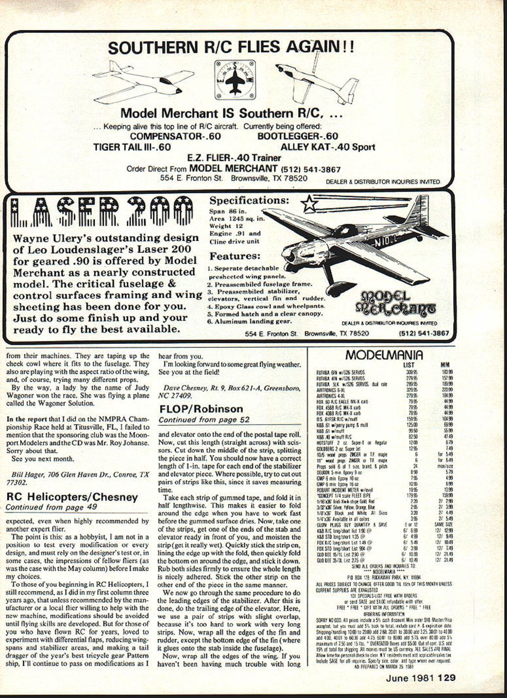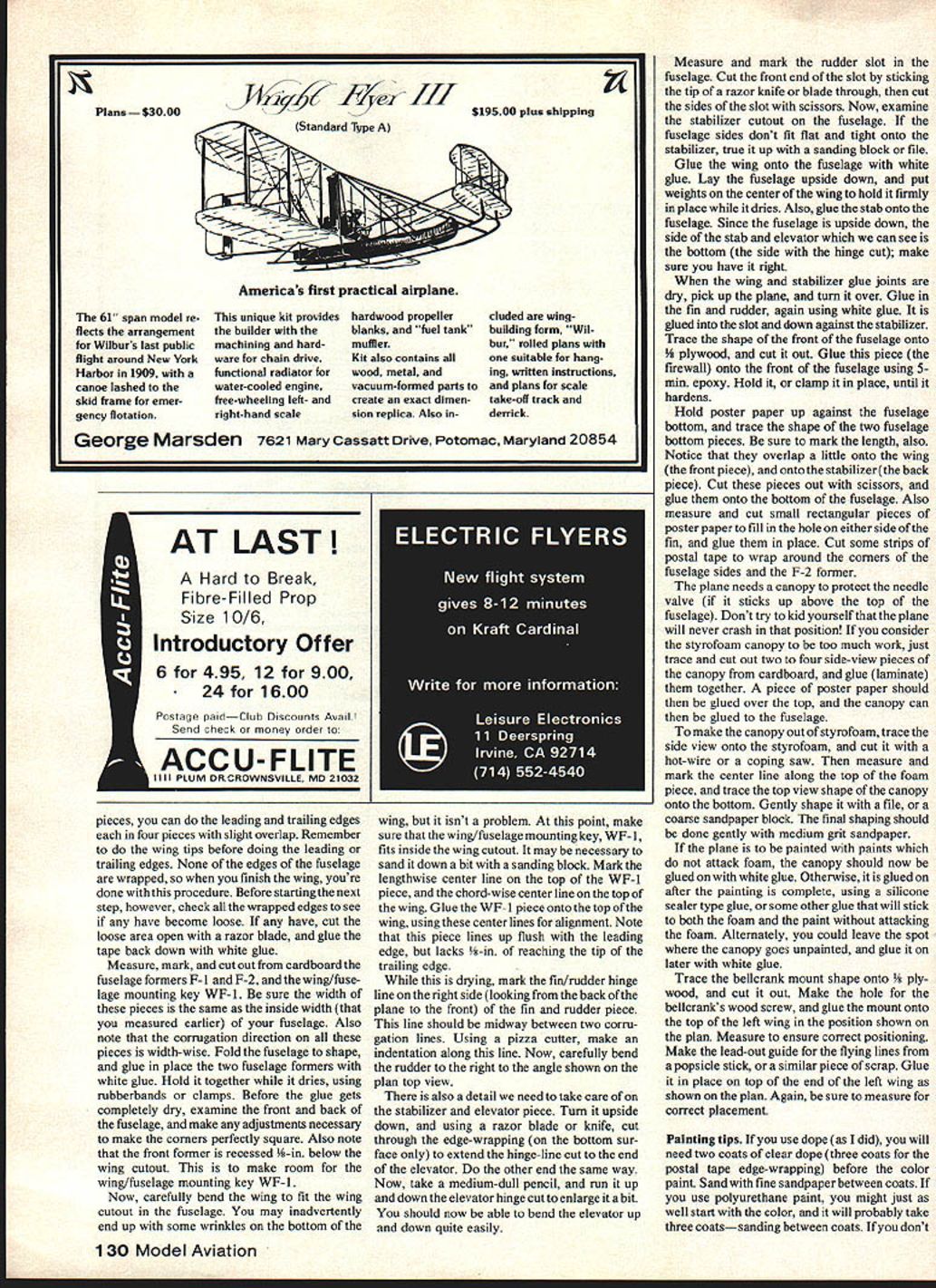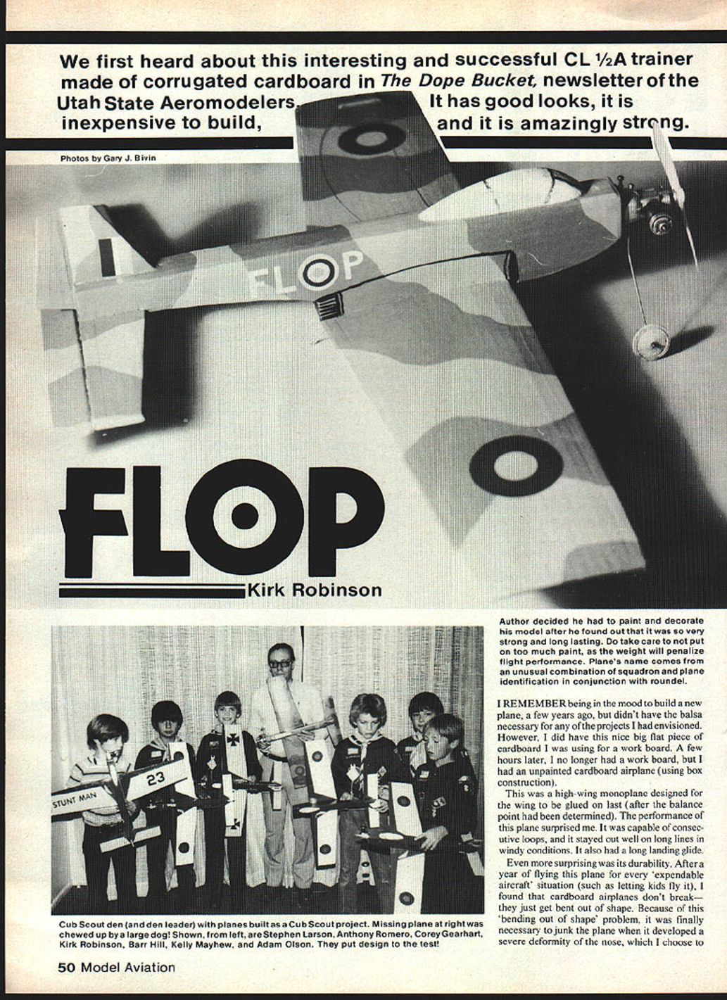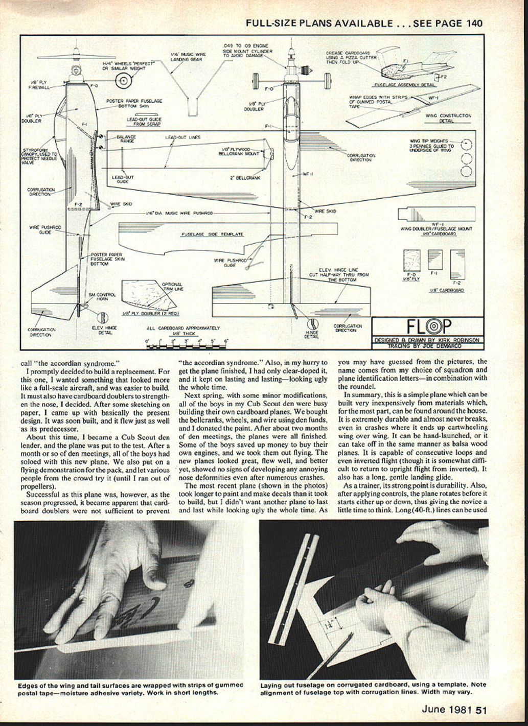 We first heard about interesting successful CL 1/2A trainer made corrugated cardboard Dope Bucket newsletter Utah State AeromodelersIt has good looks it amazingly sti Author decided paint decorate model after found out very strong long lasting take care put too much paint weight will penalize flight performance Planes name comes unusual combination squadron plane identification conjunction roundel REMEMBER being mood build new plane few years ago didnt have balsa necessary projects envisioned However did have nice big flat piece cardboard using work board few hours later no longer work board unpainted cardboard airplane using box construction high-wing monoplane designed wing glued last after balance point determined performance plane surprised capable consec utive loops stayed out well long lines windy conditions also long landing glide surprising its durability After year flying plane expendable aircraft situation such letting kids fly found cardboard airplanes dont break just get bent out shape Because bending out shape problem finally necessary junk plane developed severe deformity nose choose 50 Model Aviation Cub Scout den den leader planes builtas Cub Scout project Missing plane right chewed up bya largedog Shown left Stephen Larson Anthony Romero CoreyGearhart Kirk Robinson Barr Hill Kelly Mayhew Adam Olson put design test FULL-SIZE PLANS AVAILABLE . SEE PAGE 140 049 TO 09 ENGINE SIDE MOUNT CYLINDER AK MUSIC WIRETO AVOID DAMAGE LANDING GEAR -11-1/4 WHEELS PERFECT OR SIMILAR WEIGHT yR PLY POSTER PAPER FUGELAGEI/B I/I~5STTSM SKIN DOUBLER 1/9 PLY DOUBLERLEAS-OUT GUIDE F-IFRN SCRAP BALANCELEADRANGE 7 STYROFOAM CAROPY UGED TOILLCRANK MCLRTS PROTECT NEEDLE IGES VALVE LEAD-OUT2 BELLCRANI SUIGE CORRUGATION GRECTION__________ IF-2XWWE SISO VIE DIN MUSIC WIRE PUSHROD WIRE PUSHROS GUIDEFUSELAGE SIDE TEMPLATE f POSTER PAPER FUSELAGE SKINWIRE PUSHROD'7 __ BOTTOM OJIDE MA CONTRO /HCBRA________ ELEV HINGE CORRUGATION IL DIRECTION OPTIONAL TRIM LINE I/B PLY DOUBLER 12 REOI ALL CARDBOARD APPROXIMATELY I/B THICK r 1 CREASE CARDBOARDN USING U PZZA CUTTER THEN FOLD UP FD FUSELASE ASGEMBLY DETAIL WRAP EDOES WITH STRIPS WF-I OF GIWiNED POSTAL TAPE WING CONSTRUCTION DETAJL "CORRUGATION DIRECTION -WF-I WING TIP WEIGHTS --4.\ 3 PENNIES ALOES TO UNDERSIDE OF WING -- N WIRE SKID -F-D ELEV HINGE UNE CUT HALF-WAY THRU FROM THE BOTTOM CORRUGATION HINSEERECTION DETAIL WING DOUBLER/FUSELAGE MOUNT I/B CAWOBSARO 2 B CAR3BSARO FLP 8 DRAWN NV KIRK call accordian syndrome promptly decided build replacement wanted something looked like full-scale aircraft easier build must also have cardboard doublers strength en nose decided After some sketching paper came up basically present design soon built flew just well its predecessor About time became Cub Scout den leader plane put test After month den meetings boys soloed new plane also put flying demonstration pack let various people crowd try until ran out propellers Successful plane however season progressed became apparent card board doublers sufficient prevent accordian syndrome Also huny get plane finished clear-doped it kept lasting lastinglooking ugly whole time Next spring some minor modifications boys Cub Scout den busy building own cardboard planes bought bellcranks wheels wire using den funds donated paint After about two months den meetings planes finished Some boys saved up money buy own engines took out flying new planes looked great flew well better yet showed no signs developing annoying nose deformities after numerous crashes recent plane shown photos took longer paint make decals took build didnt want another plane last last looking ugly whole time As may have guessed pictures name comes choice squadron plane identification lettersin combination roundel summary simple plane can built very inexpensively materials part can found around house extremely durable almost never breaks crashes ends up cartwheeling wing over wing can hand-launched can take off same manner balsa wood planes capable consecutive loops inverted flight though somewhat diffi cult return upright flight inverted also has long gentle landing glide As trainer its strong point durability Also after applying controls plane rotates before starts either up down thus giving novice little time tothink Long40-ft lines canbeused June 1981 51 ages wing tail surfaces wrapped strips gummed postal tapemoisture adhesive variety Work short lengths aying u g template Note alignment fuselage top corrugation lines Width may vary prevent dizziness Its main drawbackas traineris lifting airfoil necessary wing strength really makes want climb beginners tend let get uncomfortably high initial takeoff climb Construction Start cutting out wing youll need good flat piece cardboard 28-in x 6-in size corrugations going lengthwise Measure mark wing shape cardboard using pencil cut out use razor blade razor knife cut out pieces i imperative blade very sharp beginning will dull time get through cutting Out pieces use razor blade apply pressure mainly pushing down fingernail first stroke line razor blade knife merely score surface Follow same path time after time cutting deeper time should take about five times before start cutting clear through cardboard try cut faster corrugations tend turn blade desired path Cuts angle corrugation lines harder cuts parallel perpendicular some cuts dont look good pull wing out cardboard piece dont worrynone cuts critical Hopefully youll pretty good time get fuselage Measure mark horizontal stabilizer elevator onto cardboard Again corruga tions must lengthwise Also elevator hinge-line top must exactly corruga tion line bottom will midway between two corrugation lines necessary elevator hinge work properly Cut out stabilizer elevator piece dont cut stabilizer elevator apart other Mark hinge line bottom should midway between two corrugation lines Cut halfway through cardboard along bottom hinge line Refer elevator hinge detail plans fin rudder piece marked onto cardboard cut out next might