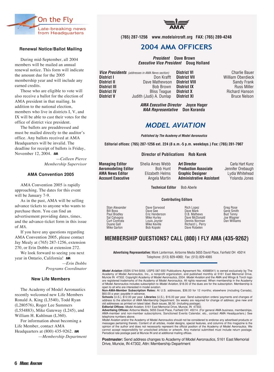 Muncie IN 47302. Copyright Academy of Model Aeronautics, 2004. Model Aviation and the AMA and Wings & Torch logo