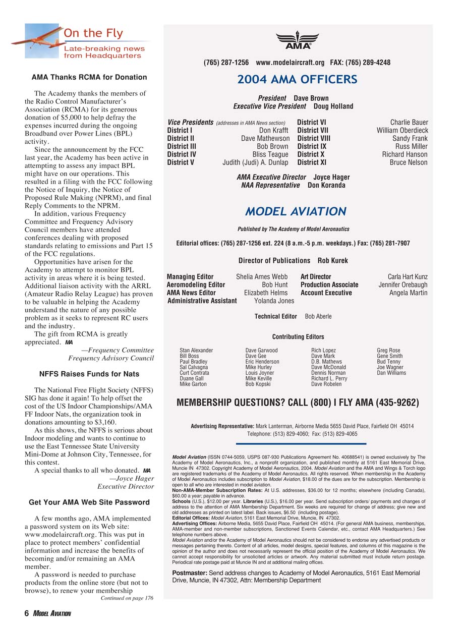 Muncie IN 47302. Copyright Academy of Model Aeronautics, 2004. Model Aviation and the AMA and Wings & Torch logo
