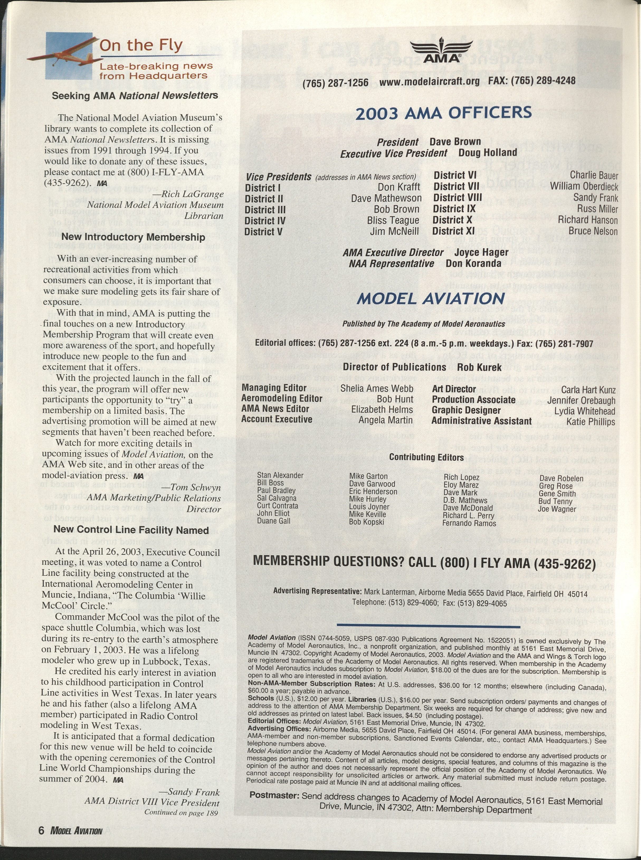 Muncie IN 47302. Copyright Academy of Model Aeronautics, 2003. Model Aviation and the AMA and Wings & Torch logo