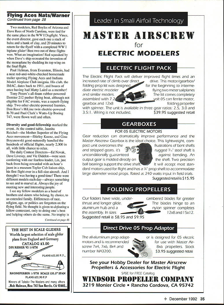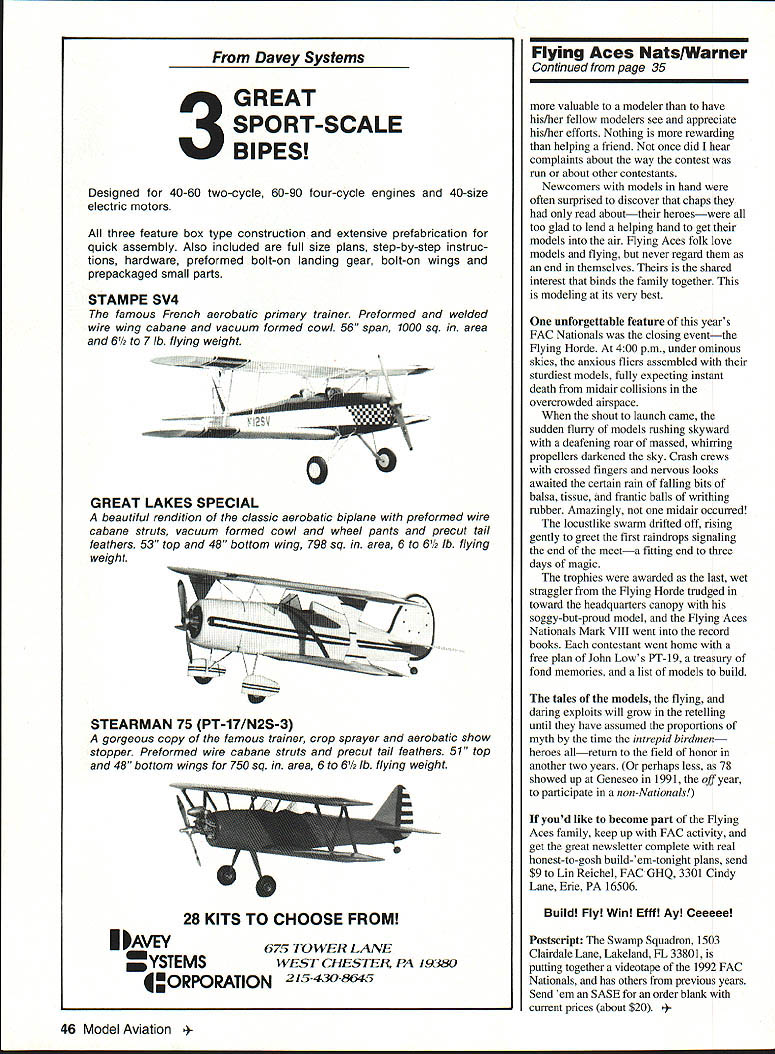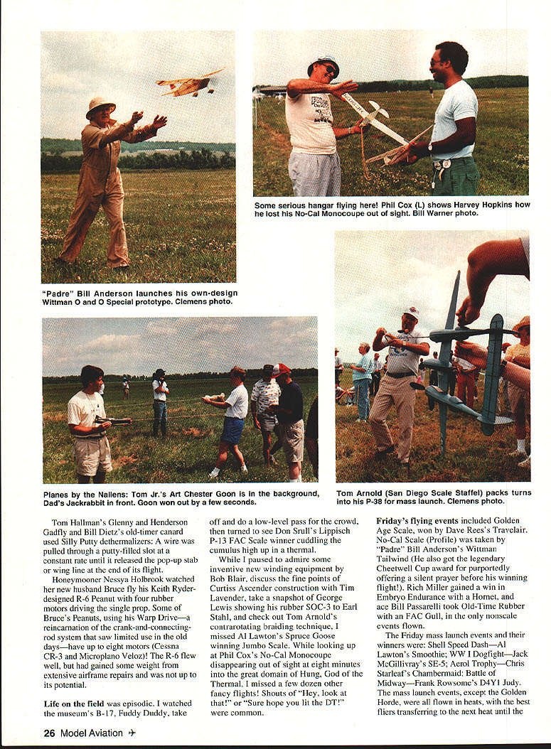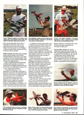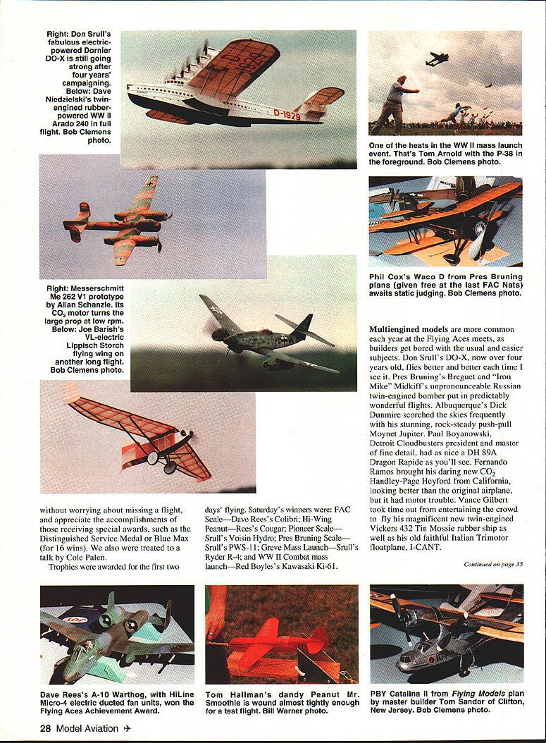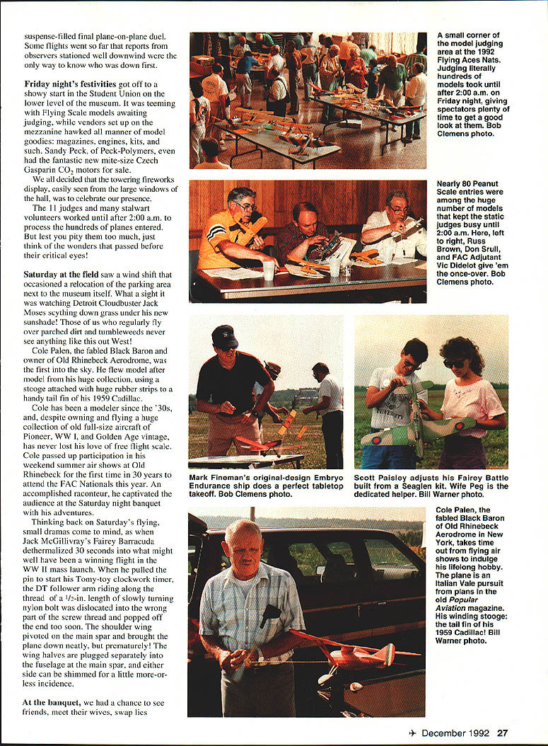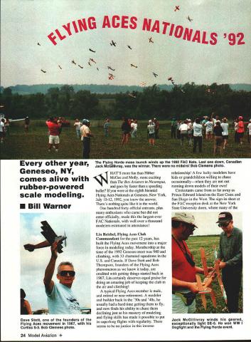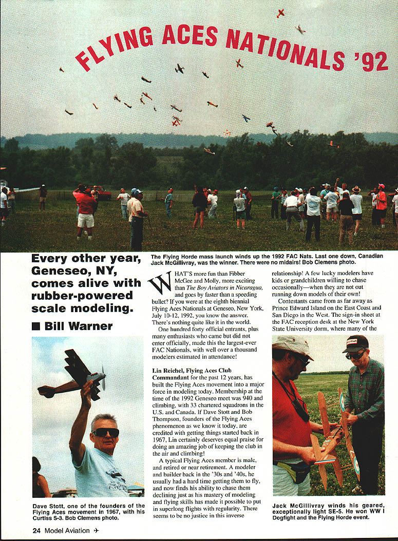 oiner year Geneseo NY comes alive rubberpowered scale modeling U Bill Warner Flying Horde mass launch winds up 1992 FAC Nats Last down Canadian Jack McGillivray winner no midairs Bob Clemens photo 44 HAT S fun Fibber McGee Molly exciting Boy Aviators Nicaragua goes faster speeding bullet eighth biennial flying Aces Nationals Geneseo New York July 10-12 1992 know answer Theres nothing quite like world hundred forty official entrants plus enthusiasts came did enter officially made largest-ever FAC Nationals well over thousand modelers estimated attendance Lin Reichel Flying Aces Club Commandant past 12 years has built Flying Aces movement major force modeling today Membership time 1992 Geneseo meet 940 climbing 33 chartered squadrons US Canada Dave Stott Bob Thompson founders Flying Aces phenomenon know today credited getting things started back 1967 Lin certainly deserves equal praise doing amazing job keeping club air climbing typical Flying Aces member male retired near retirement modeler builder back 30s 40s usually hard time getting fly now finds ability chase declining just mastery modeling flying skills has made possible put superlong flights regularity seems no justice inverse relationship few lucky modelers have kids grandchildren willing chase occasionallywhen out running down models own Contestants came far away Prince Edward Island East Coast San Diego West sign-in sheet FAC reception desk New York State University dorm 24 Model Aviation Stott founders Flying Aces movement 1967 Curtiss S-3 Bob Clemens photo Jack McGillivray winds geared exceptionally light SE-5 won WW Dogfight Flying Horde event fliers stayed looked like Whos Modeling Informal show-and-tell hangar flying went far night fatigue long drive Michigan Texas forgotten euphoria seeing old friends new models Friday morning early birds seemingly limitless grassy grounds National Warplane Museum edge town began boring holes sky before breakfast no time line cars extended almost half mile down approach road vehicle stuffed interesting finely crafted models easy imagine bad died gone heaven rare see flight under minute test guys best As three-ring circus impossible see small part action time started down flight line idea sauntering over see museums B-17 Catalina hours later discovered progressed few hundred feet Youd stopped chat snapped occasional picture admired some new technique gawked great flight raced out view mass launch event day went instantmuch faster real world addition having mastered craft making traditional models replete gumband Japanese tissue builder/fliers have gone far beyond realm modern technology Laminated balsa bulkheads wing tips tail outlines modern adhesives acrylic flat semigloss enamels wide use although MonoKote-type covering conspicuously absent area exotic power sources Paul Helmans ABC Robin Joe Barishs Mauboussin made good use new PowerMax-Z compressed air motors Italy Terry Pittmans sub-Peanut Farman Carte Postale flew beautifully its minuscule 6-cu-mm-displacement Gasparin CO2 motor mini-electric ductedfan units such ones found Dennis Normans A7 Corsair MiG-15s Don Srull Ferrell Papic Jack Noll Flying Aces Achievement Awardwinning Warthog HiLines Dave Rees wave future Allan Schanzle s new C02-powered 262 Vl star performer recourse jets found prototype prop snoot original experimental aircraft needed both turbines went kaput its first flight Allan flies em light slow engine turning large prop amazingly leisurely pace Geared rubber models certainly making mark days Perhaps accomplished builder/flier area Canadian Jack McGillivray won Thompson mass launch Cessna CR-3 FAC Peanut Isaacs Fury WV Dogfight Peanutall geared models cant argue success Jacks models beautifully made superlight Sean Theiss Savola-Marchetti Tom Haliman launching two-minute SR-70 originally flown indoors Model Glenny rubber-powered Henderson uses Brown Campus CO2 motor Gadfly Bill Warner photo 4- December 1992 25 Vance Gilbert displays Vickers 432 rubber ship original metal plane called Tin Mossie Bob Clemens photo Terry Pittman checks out rubber Earl Stahl Skyfarer finished red Pactra airbrushed white tissue Texan Iron Mike Midkiff Cactus Squadron T-shirt prepares battle Hansa Brandenburg W-29 Ferrell Papic MiG-15 several entries using electric-powered ducted fan units Bill Warner photo Tim Lavender tests racy nonscale original-design Embryo Endurance model Bill Warner photo Tom Hailmans Glenny Henderson Gadfly Bill Dietzs old-timer canard used Silly Putty dethermalizers wire pulled through putty-filled slot constant rate until released pop-up stab wing line end its flight Honeymooner Nessya Holbrook watched new husband Bruce fly Keith Ryderdesigned R-6 Peanut four rubber motors driving single prop Some Bruces Peanuts using Warp Drivea reincarnation crank-and-connectingrod system saw limited use old dayshave up eight motors Cessna CR-3 Microplano Veloz R-6 flew well gained some weight extensive airframe repairs up its potential Life field episodic watched museums B-17 Fuddy Duddy take off low-level pass crowd turned see Don Srulls Lippisch P-13 FAC Scale winner cuddling cumulus high up thermal paused admire some inventive new winding equipment Bob Blair discuss fine points Curtiss Ascender construction Tim Lavender take snapshot George Lewis showing rubber SOC-3 Earl Stahl check out Tom Arnolds contrarotating braiding technique missed Al Lawtons Spruce Goose winning Jumbo Scale looking up Phil Coxs No-Cal Monocoupe disappearing out sight eight minutes great domain Hung God Thermal missed few dozen other fancy flights Shouts Hey look Sure hope lit DT common Fridays flying events included Golden Age Scale won Dave Reess Travelair No-Cal Scale Profile taken Padre Bill Andersons Wittman Tailwind also got legendary Cheetwell Cup award purportedly offering silent prayer before winning flight Rich Miller gained win Embryo Endurance Hornet ace Bill Passarelli took Old-Time Rubber FAC Gull nonscale events flown Friday mass laun