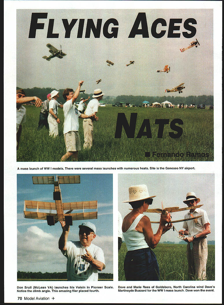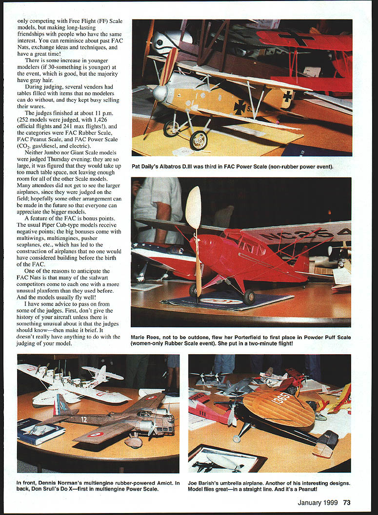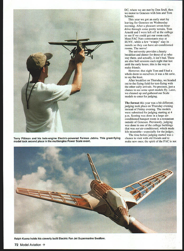 Don Srull McLean VA launches Voisin Pioneer Scale Dave Marie Rees Goldsboro North Carolina wind Daves Notice climb angle amazing flier placed fourth Martinsyde Buzzard WW mass launch Dave won event 70 Model Aviation launch WW models several mass launches numerous heats Site Geneseo NY airport Mecca According American Heritage Dictionary mecca place regarded goal its Flying Aces Club FAC Nationals Nats wondrous event held two years year took place July 16-19 first FAC Nats 1978 Willow Grove Naval Air Station Pennsylvania idea certain active clubs take responsibility finding suitable location contest other year has held Dayton Ohio site Air Force Museum Utica Michigan flying grounds old Ford test track twice Willow Grove site After Utica Geneseo New York has part become permanent site prestigious event Geneseo nifty college town home State University New York SUNY Flying done all-grass Geneseo airport once home National Warplane Museum what made trip back interesting array World War II aircraft display However museum moved its facilities Elmira New York after dispute owner land 163 contestants 11th FAC Nats no other contest has models modeler brought six aircraft would 978 models some bring some bring less models Scale since events old-time Jimmie Allen Embryo number airplanes staggering no matter look Tom Arnold have traveled West Coast together past 10 years FAC Nats fly Washington Photos Author Graphic nesign Jill Ann cavanaugh January1999 71 Terry Pittman Farman Sport full-scale example being restored Silver Hill Maryland facility Smithsonian Pres Bruning Royal Oak Ml gets set wind Ju 88 A-4 Englands Derek Knights electric-powered B-17 Uses own motors sells model took fourth multiengine Don Srull readies Short biplane flight took third place Jumbo Scale Don has won approximately 150 trophies past 20 years FAC Nats DC met Don Srull motor Geneseo him Tom Schmitt year got early start leaving Geneseo Wednesday morning After pleasant seven-hour drive through some pretty terrain Tom Arnold left off college see could get room early Most FAC Nats contestants stay SUNY few wimps stay motels can have air-conditioned rooms nerve university provides hearty breakfast dinner us stay actually isnt bad also bull sessions night last until early hours way make friends However night Tom whole dorm ourselves bit eerie say least After breakfast Thursday headed out flying field test-flying other early arrivals No pressure just chance see some sport models fly Later cleaned up gathered Scale models enter judging format year bit different judging took place Thursday evening instead Friday evening models submitted judging starting 4 pm Scoring done large airconditioned banquet room restaurant outside Geneseo Previously judging done college buildings air-conditioned made life miserableespecially judges time before judging started chance visit old friends make new ones spirit FAC 72 Model Aviation y Pittman twin-engine Electric-powered Farman Jabiru great-flying model teak second place multiengine Power Scale event Ralph Kuenz holds cleverly built Electric Fan Jet Supermarine Swallow competing Free Flight FF Scale models making long-lasting friendships people have same interest can reminisce about past FAC Nats exchange ideas techniques have great time some increase younger modelers 30-something younger event good majority have gray hair During judging several vendors tables filled items no modelers can kept busy selling wares judges finished about 11 pm 252 models judged 1426 official flights 241 max flights categories FAC Rubber Scale FAG Peanut Scale FAG Power Scale GO2 gas/diesel electric Neither Jumbo nor Giant Scale models judged Thursday evening large figured would take up too much table space leaving enough room other Scale models attendees did get see larger airplanes since judged field hopefully some other arrangement can made future everyone can appreciate bigger models feature FAG bonus points usual Piper Cub-type models receive negative points big bonuses come multiwings multiengines pusher seaplanes etc has led constmction airplanes no would have considered building before birth FAG reasons anticipate FAG Nats stalwart competitors come unusual planform used before models usually fly well have some advice pass some judges First dont give history aircraft unless something unusual about judges should knowthen make brief doesnt really have anything judging model January1999 73 Pat Dailys Albatros Dlll third FAC Power Scale non-rubber power event Marie Rees outdone flew Porterfield first place Powder Puff Scale women-only Rubber Scale event put two-minute flight front Dennis Normans multiengine rubber-powered Amiot Joe Barishs umbrella airplane Another interesting designs back Don Srulls Xfirst multiengine Power Scale Model flies greatin straight line its Peanut Second expend great deal effort placing details model make list attach three-view color-and-markings submit color photograph painting aircraft modelednot someone elses would surprised contestants submit color photo Keep documentation order model will judged Anything can make judges job easier will go unnoticed After caloric breakfast Friday morning everyone headed out flying field weather terrific enough cloud cover keep getting too hot good portion field mowed grass least foot talllike mothers arms errant models Several mass-launch events flown heatsa favorite spectators Some mass-launch events have what called 15% rubber rule model weighed regardless its weight given 15% weight rubber rule models fly well far create long chases contestants have back time next heat creates problem some old-timersespecially factor heat humidity 15% rule has made fewer longdistance flights possible didnt find anyone liked contestants forced build Indoor-type model nearly ghost model sparse detail actuality weight rubber added models weight works out about 13% Editors two other model magazines event its first time ever seen either attend fun seeing go end field ot