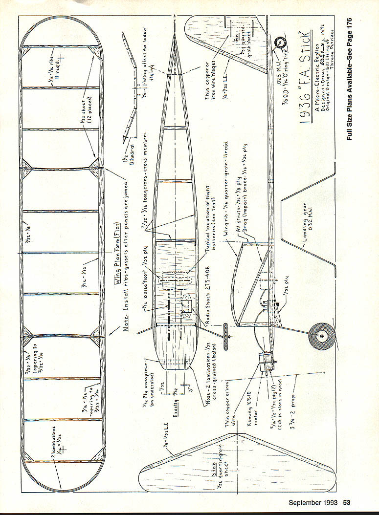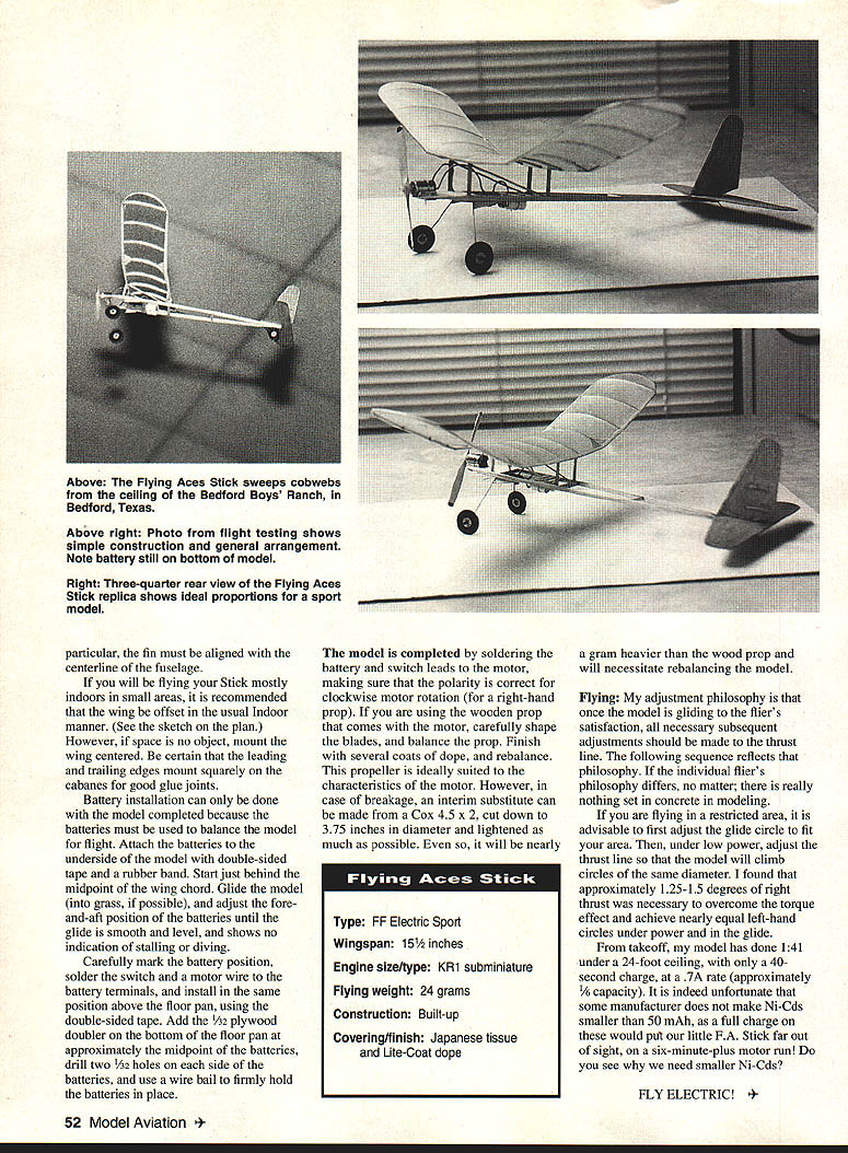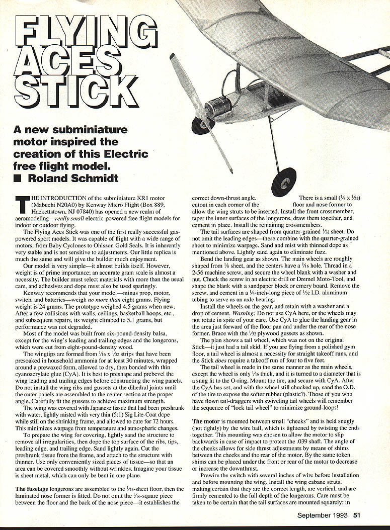 A new subminiature motor inspired creation Electric free flight model U Roland Schmidt HE INTRODUCTION subminiature KRl motor Mabuchi N20A0 Kenway Micro Flight Box 889 Hackettstown NJ 07840 has opened new realm aeromodelingreally small electric-powered free flight models indoor outdoor flying Flying Aces Stick first really successful gaspowered sport models capable flight wide range motors Baby Cyclones Ohlsson Gold Seals inherently very stable sensitive adjustments little replica much same will give builder much enjoyment model very simpleit almost builds itself However weight prime importance accurate gram scale almost necessity builder must select materials usual care adhesives dope must also used sparingly Kenway recommends modelminus prop motor switch batteriesweigh no eight grams Flying weight 24 grams prototype weighed 45 grams new After few collisions walls ceilings basketball hoops etc subsequent repairs its weight climbed 51 grams performance degraded Most model built six-pound-density balsa except wings leading trailing edges longerons cut eight-pound-density wood wingtips formed A6 x 1/32 strips have presoaked household ammonia least 30 minutes wrapped around prewaxed form allowed dry bonded thin cyanoacrylate glue CyA best preshape prebevel wing leading trailing edges before constructing wing panels install wing ribs gussets dihedral joints until outer panels assembled center section proper angle Carefully fit gussets achieve maximum strength wing covered Japanese tissue preshrunk water lightly misted very thin 51 Sig Lite-Coat dope still shrinking frame allowed cure 72 hours minimizes warpage temperature atmospheric changes prepare wing covering lightly sand structure remove irregularities dope top surface ribs tips leading edge trailing edge Sand lightly again Cut preshrunk tissue frame attach structure thinner Use conveniently sized pieces tissueso area can covered smoothly wrinkles Imagine tissue sheet metal can bent plane fuselage longerons assembled /is-sheet floor laminated nose former fitted omit A6-square piece between floor back nose pieceit establishes correct down-thrust angleThere small 1/s x 1/32 cutout corner floor nose former allow wing struts inserted Install front crossmember taper inner surfaces longerons draw together cement place Install remaining crossmembers tail surfaces shaped quarter-grained 1/32 sheet omit leading edgesthese combine quarter-grained sheet minimize warpage Sand mist thinned dope mentioned above Lightly sand again eliminate fuzz Bend landing gear shown main wheels roughly shaped 1/ sheet centers have 1A6 hole Thread 2-56 machine screw secure wheel blank washer nut Chuck screw electric drill Dremel Moto-Tool shape blank sandpaper block emery board Remove screw cement -inch-long piece 1/32 ID aluminum tubing serve axle bearing Install wheels gear retain washer drop cement Warning use CyA wheels may rotate spite care Use CyA glue landing gear area just forward floor pan under rear nose former Brace 1A2 plywood gussets shown plan shows tail wheel original Stickit just tail skid flying polished gym floor tail wheel almost necessity straight takeoff runs Stick does require takeoff run four five feet tail wheel made same manner main wheels except wheel 1As thick turned diameter snug fit 0-ring Mount tire secure CyA After CyA has set wheel still chucked up sand OD tire expose softer rubber plastic have flown tail-draggers swiveling tail wheels will remember sequence lock tail wheel mimmize ground-loops motor mounted between small cheeks held snugly tightly wire bail tightened twisting ends together mounting chosen allow motor slip backwards case impact protect 039 shaft angle cheeks allows side thrust adjustments means shims between cheeks rear motor same token shims can placed under front rear motor decrease increase downthrust Prewire switch several inches wire before installation before mounting wing Install wing cabane struts making certain correct length vertical firmly cemented full depth longerons Care must taken certain tail surfaces mounted squarely September 1993 51 Above right Photo flight testing shows simple construction general arrangement Note battery still bottom model Right Three-quarter rear view Flying Aces Stick replica shows ideal proportions sport model particular fin must aligned centerline fuselage will flying Stick mostly indoors small areas recommended wing offset usual Indoor manner See sketch plan However space no object mount wing centered certain leading trailing edges mount squarely cabanes good glue joints Battery installation can done model completed because batteries must used balance model flight Attach batteries underside model double-sided tape rubber band Start just behind midpoint wing chord Glide model grass possible adjust foreand-aft position batteries until glide smooth level shows no indication stalling diving Carefully mark battery position solder switch motor wire battery terminals install same position above floor pan using double-sided tape Add A2 plywood doubler bottom floor pan approximately midpoint batteries drill two A2 holes side batteries use wire bail firmly hold batteries place model completed soldering battery switch leads motor making sure polarity correct clockwise motor rotation right-hand prop using wooden prop comes motor carefully shape blades balance prop Finish several coats dope rebalance propeller ideally suited characteristics motor However case breakage interim substitute can made Cox 45 x 2 cut down 375 inches diameter lightened much possible will nearly gram heavier wood prop will necessitate rebalancing model Flying adjustment philosophy once model gliding fliers satisfaction necessary subsequent adjustments should made thrust line following sequence reflects philosophy individual fliers philosophy differs no matter really nothing set concrete modeling flying restricted area advisable first adjust glide circle fit area under low power adjust thrust line model will climb 
