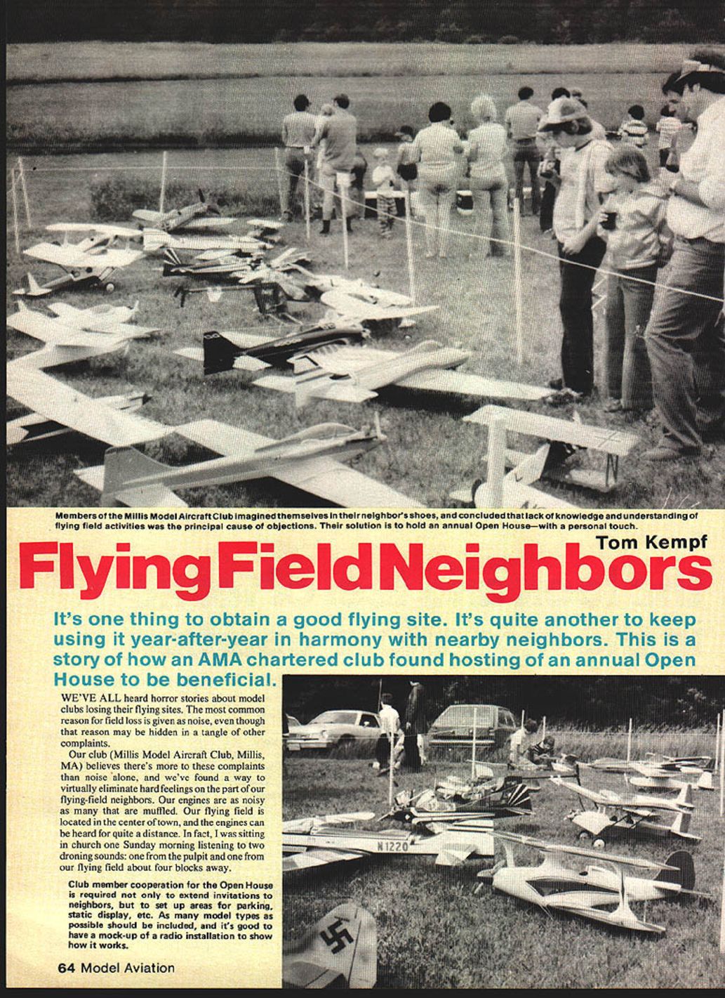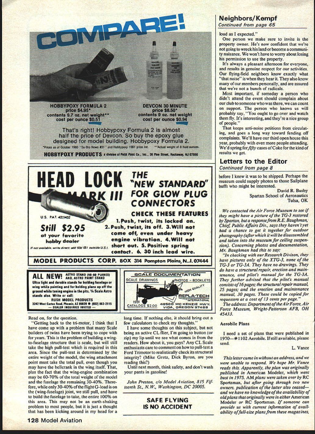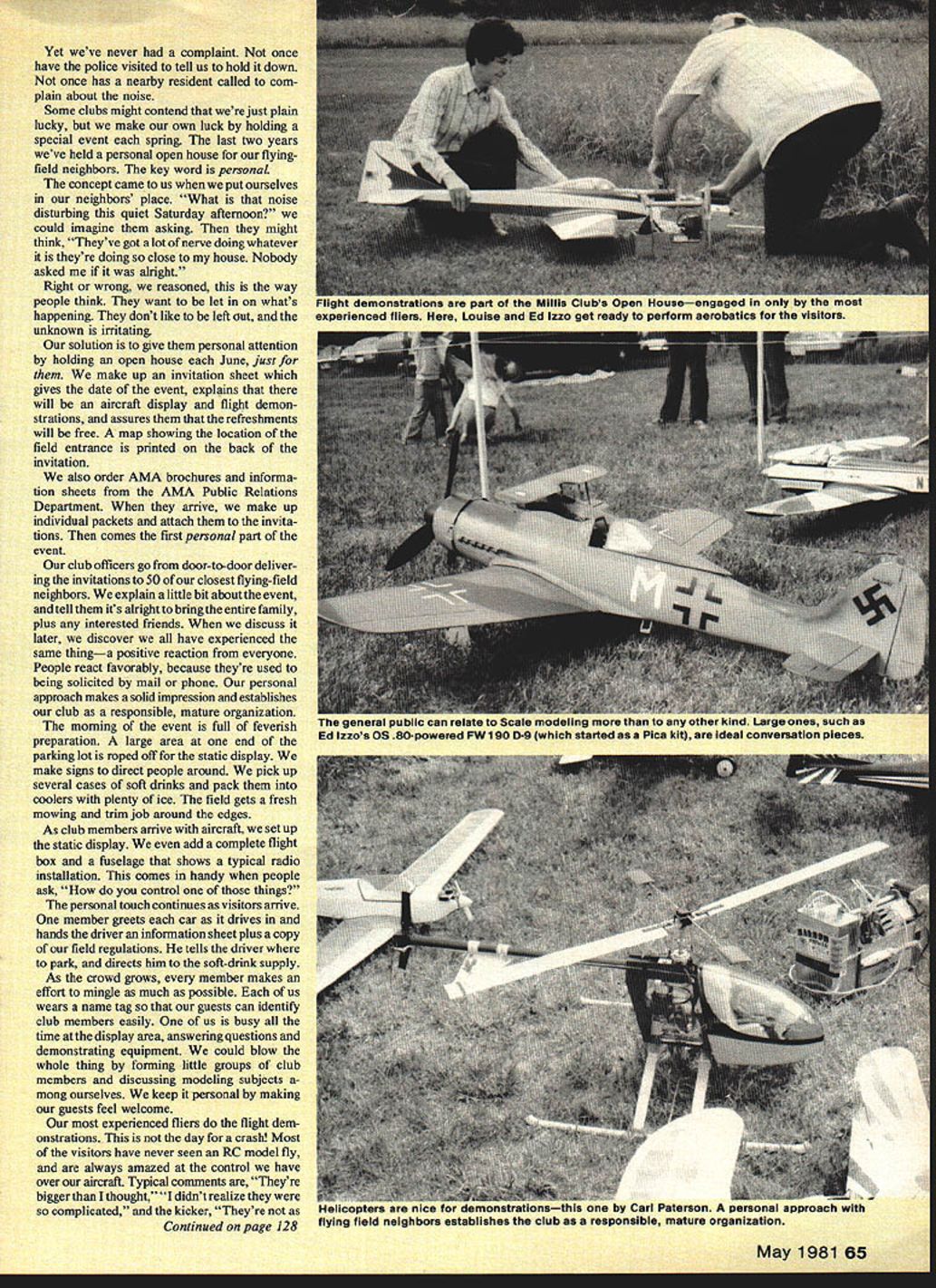 embers Millis Model AircraftClub lmaglneatnemseuves intheir nelghbor anuea enu unIIuuuuInrntUCKOf knowiougeano unguralail ying field activities principal cause objections solution hold annual Open Housewith personal touch om Kempf Flying Field Neighliors Its thing obtain good flying site Its quite another keep using year-after-year harmony nearby neighbors story AMA chartered club found hosting annual Open House beneficial WEVE ALL heard horror stories about model clubs losing flying sites common reason field loss given noise though reason may hidden tangle other complaints club Millis Model Aircraft Club Millis MA believes theres complaints noise alone weve found way virtually eliminate hard feelings part flying-field neighbors engines noisy muffled flying field located center town engines can heard quite distance fact sitting church Sunday morning listening two droning sounds pulpit flying field about four blocks away Club member cooperation Open Mouse required extend invitations neighbors set up areas parking static display etc As model types possible should included its good have mock-up radio installation show works Yet weve never complaint once have police visited tell us hold down once has nearby resident called com plain about noise Some clubs might contend just plain lucky make own luck holding special event spring last two years weve held personal open house flyingfield neighbors key word personal concept came us put ourselves neighbors place What noise disturbing quiet Saturday afternoon could imagine asking might think Theyve got lot nerve doing whatever theyre doing close house Nobody asked alright Right wrong reasoned way people think want let whats happening dont like left out unknown irritating solution give personal attention holding open house June just make up invitation sheet gives date event explains will aircraft display flight demon strations assures refreshments will free map showing location field entrance printed back invitation also order AMA brochures informa tion sheets AMA Public Relations Department arrive make up individual packets attach invita tions comes first personal part event club officers go door-to-door deliver ing invitations 50 closest flying-field neighbors explain little bit about event tell its alright bring entire family plus interested friends discuss later discover have experienced same thinga positive reaction everyone People react favorably because theyre used being solicited mail phone personal approach makes solid impression establishes club responsible mature organization morning event full feverish preparation large area end parking lot roped off static display make signs direct people around pick up several cases soft drinks pack coolers plenty ice field gets fresh mowing trim job around edges As club members arrive aircraft set up static display add complete flight box fuselage shows typical radio installation comes handy people ask control things personal touch continues visitors arrive member greets car drives hands driver information sheet plus copy field regulations tells driver park directs him soft-drink supply As crowd grows member makes effort mingle much possible us wears name tag guests can identify club members easily us busy time display area answering questions demonstrating equipment could blow whole thing forming little groups club members discussing modeling subjects mong ourselves keep personal making guests feel welcome experienced fliers flight dem onstrations day crash Most visitors have never seen RC model fly always amazed control have over aircraft Typical comments Theyre biggerthan Ithought Ididnt realize complicated kicker Theyre Continued page 128 aemo rations pan -U56OflgSgEonhi experienced sliers Louise ana Ea Izzo get reaay perform aerobatics visitors hicopters nice tor aemonstraone oy Carl Paterson personai approach flying field neighbors establishes ciub responsible mature organization May 1981 65 OCK THE L FOR GLOW PLUG CONNECTORS US PATCHECK THESE FEATURES 1 Push twist Its lacked u Still $2952 Push twist Its off 3WIII come ff veder heevy favritewgIu vibration 4WIII sot hobby dealer nor evathPe wntv r*ect d4 SOW SI outride U t stat S Pasotow spriag catct 3O inch lead wire MODEL PRODUCTS CORP BOX 314 PomptonPtainsNJ07444 ALL NEW 2~D 40-60 PLANESSCALE DOCUMENTATION PAINT STANDSCALE DRAWINGSPHOTOS BOOKLETS Ultra light durable stands holding fuselage RUSH MODEL PRODUCTSIINTERNATIONAL wing whil painting holding plane up off ginned tuning engine pits / Scale Astro stands also Write callJREPLATECH 1931 3242 West Cactus Road Pbmsix AZ 650290 662 H3-2115 CATALOGS $200 48600 MCKENZIE HWY DEALER INtIUINIES INVITED IVICA OREGON 87429 Read question Getting back tn-motor think have come up problem Scale builders twins have trying cope years problem building wingto-fuselage structure scale will still take high pull-test required area Since pull-test determined entire weight model wing attachment point must take total pull though may have bellcrank wing itself plus fact wing-engine combination may 60-70% total weight model fuselage remaining 30-40% fore 30-40% flight G-load wing-fuselage joint still pull have build fuselage take entire 100% area may earth-shaking problem people just thought has kicking around head long time nothing else should bring out few calculators check thoughts have some thoughts subject being active CL flier Im going button zip lip until see what comes readers about guys Any CL Scale enthusiasts care comment pull-test Ford Trimotor realistically check its structural integrity Mike Gretz Dick Byron reading Until next month think safety dont wash pants gasoline John Preston c/o Model Aviation 815 FW teenth St N W Washington DC 20005 SAFE FLYING IS NO ACCIDENT Neighbors/Kempf Continued page 65 loud expected person make sure invite property owner Hes now confident going wreck land become communi ty nuisance wont have worry about losing permission use property Its always pleasant afternoon everyon