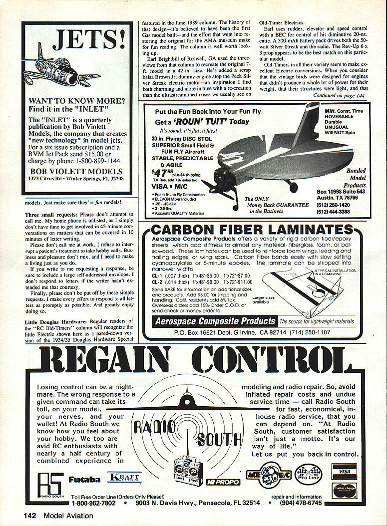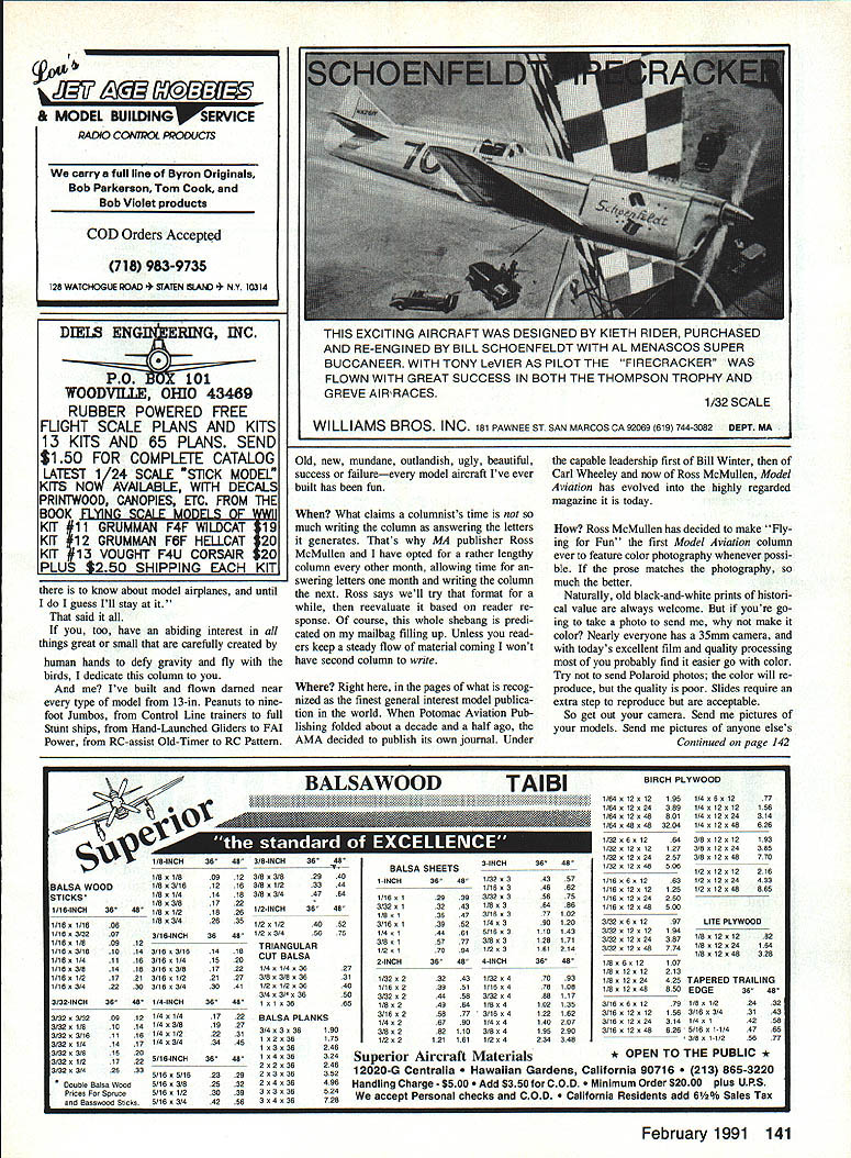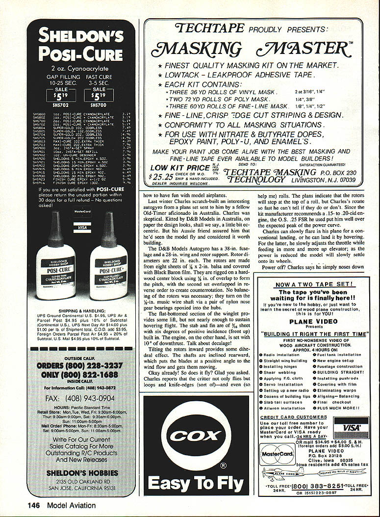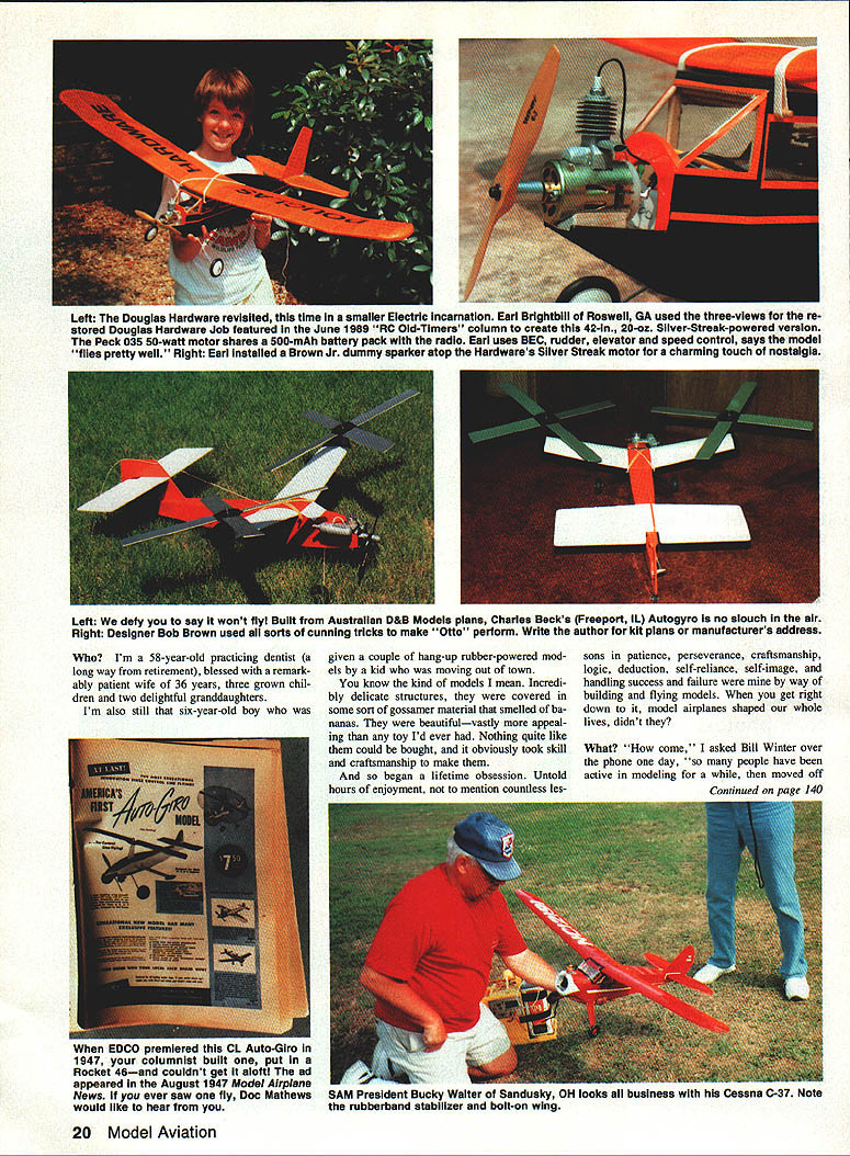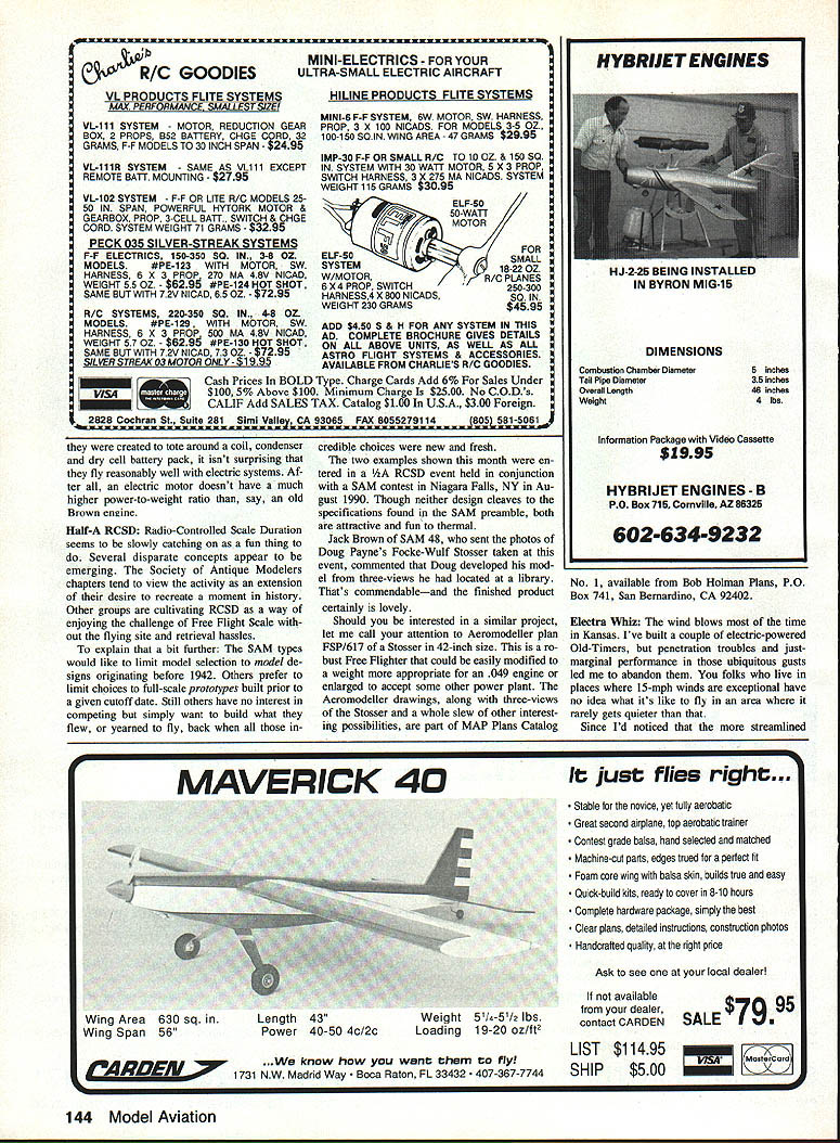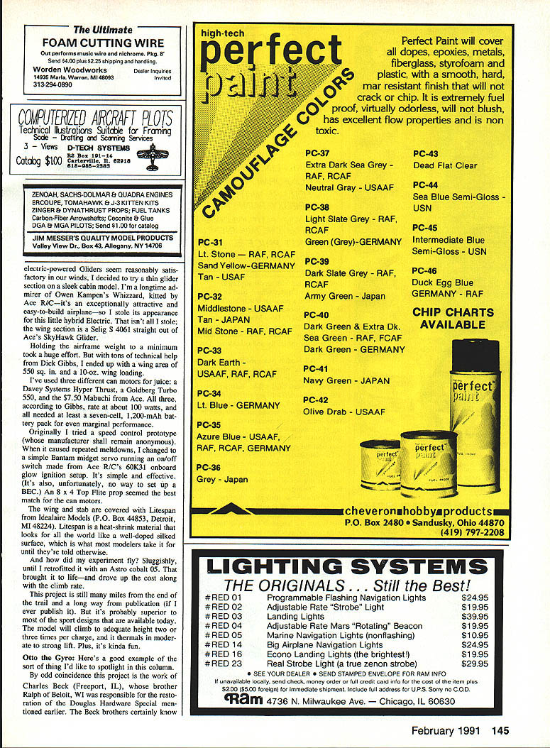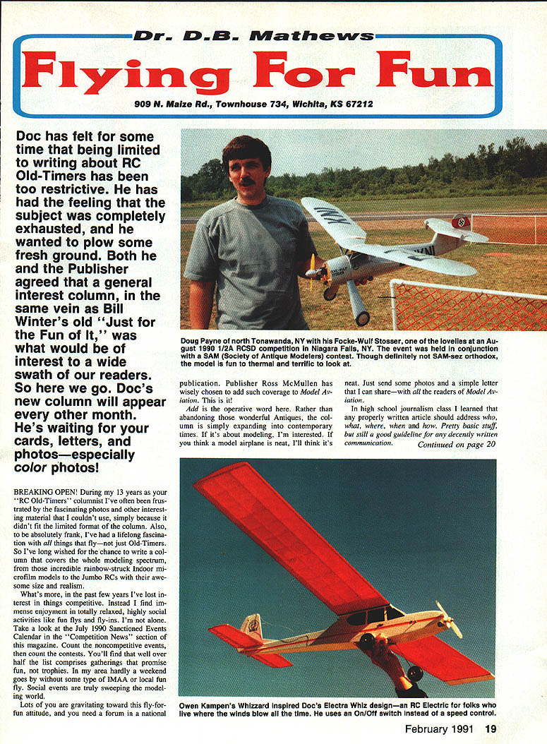 ffrlth Flying Fun 909 N Maize Rd Townhouse 734 WichIta KS 67212 Doc has felt some time being limited writing about RC Old-Timers has too restrictive has feeling subject completely exhausted wanted plow some fresh ground Both Publisher agreed general interest column same vein Bill Winters old Just Fun what would interest wide swath readers So go Docs new column will appear other month Hes waiting cards letters photosespecially color photos BREAKING OPEN During 13 years RC Old-Timers columnist Ive often frus trated fascinating photos other interest ing material couldnt use simply because didnt fit limited format column Also absolutely frank Ive lifelong fascina tion things flynot just Old-Timers So Ive long wished chance write col umn covers whole modeling spectrum incredible rainbow-struck Indoor mi crofilm models Jumbo RCs awe some size realism Whats past few years Ive lost terest things competitive Instead find im mense enjoyment totally relaxed highly social activities like fun flys fly-ins Im alone Take look July 1990 Sanctioned Events Calendar Competition News section magazine Count noncompetitive events count contests Youll find well over half list comprises gatherings promise fun trophies area hardly weekend goes some type IMAA local fun fly Social events truly sweeping model ing world Lots gravitating toward fly-forfun attitude need forum national Doug Payne north Tonawanda NY Focke-Wuif Stosser lovelies Au gust 1990 112A RCSD competition Niagara Falis NY event held conjunction SAM Society Antique Modelers contest Though definitely SAM-sez orthodox model fun thermal terrific look publication Publisher Ross McMullen has wisely chosen add such coverage Model Av iation Add operative word Rather abandoning wonderful Antiques col umn simply expanding contemporary times its about modeling Im interested think model airplane neat Ill think its neat Just send some photos simple letter can sharewith readers Model Av jation high school journalism class learned properly written article should address what Pretty basic stuff still good guideline decently written communication Continued page 20 February 1991 19 Owen Kampens Whizzard inspired Docs Electra Whiz designsn RC Electric folks live winds blow time uses On/Off switch Instead speed control Left Douglas Hardware revisited time smalier Eiectric incarnation Eari Brightbiii Rosweii GA used three-views re stored Dougias Hardware Job featured June 1989 RC Oid-Timers coiumn create 42-in 20-oz Sliver-Streak-powered version Peck 035 50-watt motor shares 500-mAh battery pack radio Eari uses BEC rudder sievator speed controi says modei flies pretty weii Right Eari instailed Brown Jr dummy sparker atop Hardwares Sliver Streak motor charming touch nostaigia Im 58-year-old practicing dentist long way retirement blessed remark ably patient wife 36 years three grown chil dren two delightful granddaughters Im also still six-year-old boy sons patience perseverance craftsmanship logic deduction self-reliance self-image handling success failure way building flying models get right down model airplanes shaped whole lives didnt 20 Model Aviation Left We defy say wont fly Built Australian D&B Models plans Charles Becks Freeport IL Autogyro no slouch air Right Designer Bob Brown used sorts cunning tricks make Otto perform Write author kit plans manufacturers address given couple hang-up rubber-powered mod els kid moving Out town know kind models mean Incredi bly delicate structures covered some sort gossamer material smelled ba nanas beautifulvastly appeal ing toy Id ever Nothing quite like could bought obviously took skill craftsmanship make began lifetime obsession Untold hours enjoyment mention countless les What come asked Bill Winter over phone day people have active modeling moved off EDCO premiered CL Auto-Giro 1947 coiumnist built put Rocket 46and couldnt get aloft ad appeared August 1947 Model Airplane News ever saw fly Doc Mathews would like hear SAM President Bucky Waiter Sandusky OH looks business Cessna C-37 Note rubberband stabilizer bolt-on wing words went lean has used least understood phrases modeling today seems time model motor loses power accusation went lean several reasons motor could slow down possibly quit properly broken-in model motor running right fuel plug properly cooled does sag heat up fuel level dropped too far needle tweaked too fan What should happen motor just slows very slightly quits firing cases motor sags down cooks three probable causes crankshaft bearings getting enough cooling fuel heat up start dragging 2 cylinder piston dont have enough clearance start binding 3 usual cause motor starts pre-igniting motor leaned makes power also makes heat makes heat plug element gets hotter ignition starts occurring soonen motor has little extra heat added because being new creating friction because weather hot because thefuel has too much nitro because glow plug retains too much heat motor can come up critical point ignition starts too soon over-advanced ignition combustion pressure presses piston down part up stroke turn generates morefriction heat again further aggravates pre-ignition problem Most model motors set up will run very close pre-ignition point because way get power Once motor goes over power peak way get back throttle back cool off Remember start lean motor get maximum power motor warms up seems slow down suffering pre-ignition slight bit pre-ignition dead lean setting may too bad because way usually get power out motor However much sagging dead lean setting giving away too much rich lean tolerance motor something should done Switching cooler running plug helps Reducing nitro fuel can make lot difference Adding little oil fuel can help some put together reasonable quantities isnt enough reducing compression ratio orden Unfortunately see lot cases pre ignition days reasons nitro expensive afrw years back people thinking nitro means power will order expensive fuel bad idea carry around can FAI type fuel 4 parts straight 