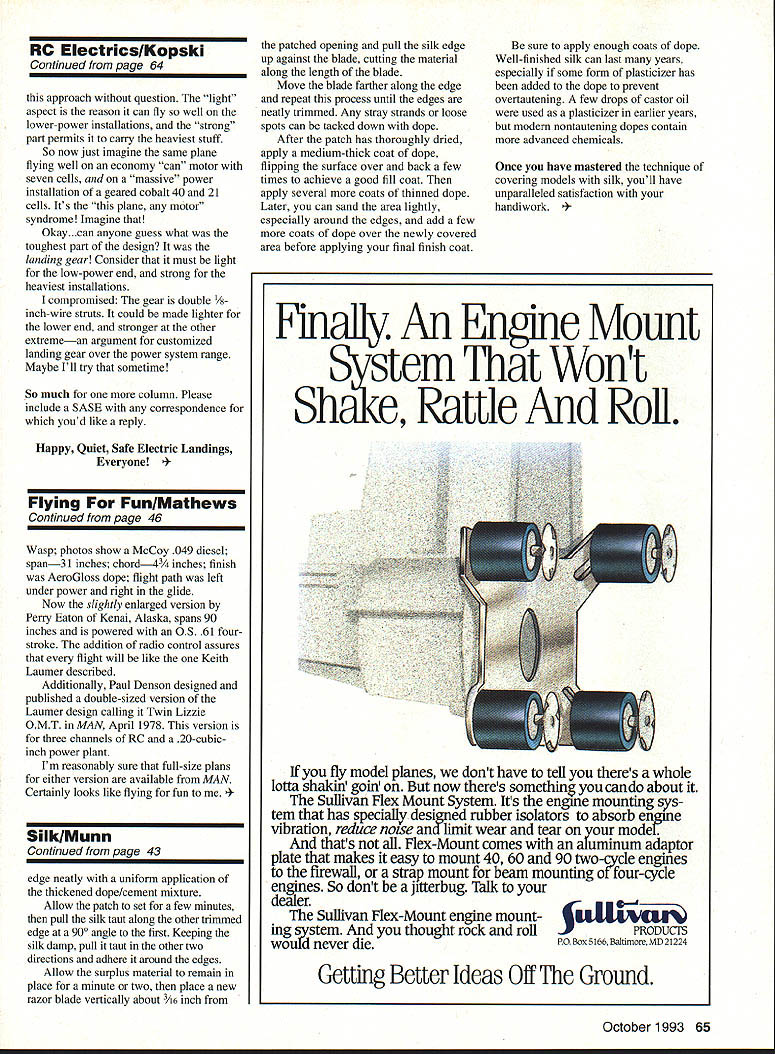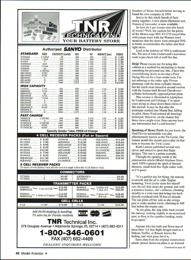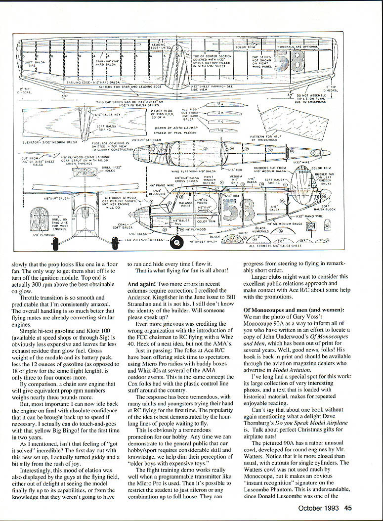 U Dr DB Mathews FOR SOME OF US big source fun model airplane hobby comes problem-solving experience certain rush accomplishment comes persistent problem conquered dont Sometimes problem own model often rush comes someone elses problem resolved seems direct proportion between duration persistence problem amount joy felt its conquest Apparently bad form columnist ever admit has mundane problems fear losing credibility something Ive fought annoying carburetion problems pair big-bore Italian engines two flying seasons Sensing frustration flying buddies have taken passes trying adjust reposition modify on fool carb trying obtain consistent idle would predictably transition midrange Often input others will solve recalcitrant problems can invaluable assistancebut have other power plants size run beautifully minimal fiddle factorbut two Set idle either would flame out throttle advanced set correct problem would die throttle retarded Incredibly frustrating Jokingly some associates have accused landing Big Bingo deadstick power-on may close truth has landed dead-stick trees tall grass wheat fields daru near everywhere within half-mile radius wherever have flown apparent ineptitude has display IMAA fly-ins Theres nothing like dispelling myths expertise before large group ones peers what term humiliation means Certainly humbling experience fervently hope problems peculiar has firsthand experience two-flyingseason frustration kind Now happy part Early May finally just gave up decided buy chain-saw engine Jim Van Loo heard make such statement advised send engines Bill Carpenter CH Ignition have Walboro carbs spark ignitions installed did wish done long before can now start big engines hand first second flip idle 44 Model Aviation 1 four-stroke-powered Twin Lizzie has excellent craftsmanship finish Appealing large size too Van Wilson photo Perry Eaton Kenal AK RC 80-inch enlargement Keith Laumers Twin Lizzie free flight design Dave Unruh photo Peter Williams Gardnerville NV Gary Voss Enid OK scratch-built 96-inch Monocoupe 90A OS 120 SurpassFieseler Storch Astro Cobalt FAI 12 x 7 power Watters cowlfolding prop 6-cell 1200-mAh battery slowly prop looks like floor fan way get shut off turn off ignition module lop end actually 300 rpm above best obtainable glow Throttle transition smooth predictable Im consistently amazed overall handling much better flying mates already converting similar engines Simple hi-test gasoline Klotz 100 available speed shops through Sig obviously less expensive leaves far less exhaust residue glow fuel Gross weight module its battery pack less 12 ounces gasoline opposed 18 glow same flight length three four ounces comparison chain saw engine will give equivalent prop rpm numbers weighs nearly three pounds important can now idle back engine final absolute confidence can brought back up speed necessary actually can touch-and-goes yellow Big Bingo first time two years As mentioned isnt feeling got solved incredible first day out new set up actually turned giddy bit silly rush joy Interestingly mood elation also displayed guys flying field either out delight seeing model finally fly up its capabilities knowledge werent going have run hide time flew what flying fun about again Two errors recent columns require correction credited Anderson Kingfisher June issue Bill Stranahan still dont know identity builder Will someone please speak up grievous crediting wrong organization introduction FCC chairman RC flying Whiz 40 Heck neat idea AMAs Just passing folks Ace R/C have offering stick time spectators using Micro Pro radios buddy boxes Whiz 40s several AMA outdoor events same concept Cox folks plastic control line stuff around country response has tremendous adults youngsters trying hand RC flying first time popularity idea best demonstrated hourlong lines people waiting fly obviously tremendous promotion hobby Any time can demonstrate general public hobby/sport requires considerable skill knowledge help dim perception older boys expensive toys flight training demo works really well programmable transmitter like Micro Pro used its possible restrict student just aileron combination up full house can progress steering flying remark ably short order Larger clubs might want consider excellent public relations approach make contact Ace R/C about some help promotions Monocoupes men women ran photo Gary Vosss Monocoupe 90A way inform have written effort locate copy John Underwoods Monocoupes Men has out print several years Well good news folks book back print should available through aviation magazine dealers advertise Model Aviation Ive long special spot work its large collection very interesting photos text loaded historical material makes repeated enjoyable reading Cant say about book again mentioning what delight Dave Thornburgs Speak Model Airplane Talk about perfect Christmas gifts airplane nuts pictured 90A has rather unusual cowl developed round engines Mr Watters Notice closed usual cutouts single cylinders Watters cowl used much Monocoupe makes obvious instant recognition signature Luscombe Phantom understandable since Donald Luscombe October 1993 45 _______- I-ELi BALSASPAR- I/B ULACOVERED WITH /32NOT SIROWN TIPSlARD BALSASNEET RORROM FILLEDON RIORT 2 TIP GEB ED V AlSO CAP STRIPS CAN RE 1/3203/32 OR ________~~ DR NOTASSEM DEE TIP ICRN PLAN I/TORI/B RALSA STRIPSciZI7i1IDUE DR SWEEPAUCK I/IA RALSA KEY OF RIBS REOD ALL _20 OF DOD/32 BARDSOFT BALSASAL GA -- FAIRINADRAWN RB KEITH LAVA4ER TRACED AT PAUL PLECAN ELEVATOR3/32AEDIOMLI/RBI/A STRINGERPATTERN FOR BALERASAFUSELAGE COVERING IS --GE WINDOBIELD VUITTED IN TOP VIEW TO CUTRIFT CONSTROCTION I0B T FROMI/B PLOWGTD RING LANDNG AULSALINEN TAREAGj17T O 3/TO GREET00DBSTRUT ON P11GB NT 301 OGLESWINOII I-/32 WIRE OVILL 1/32 GERS CDT FROMCOLOR TRIM PLATFORM I/A RALSAA RODI/IA MEDIUM BALSAj RUDDER RALSAPAINTMEDIUM TAO CROSS RBRCESWINDOW1/161/IASOFT RULSA 0 OUTLINEASKINBALSAFAIRING ALTROVUB ATWOTO-3 VAR GAGLINE SBVWN. I/RSR ANT I/GA ENGINE2BALANC