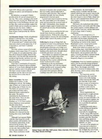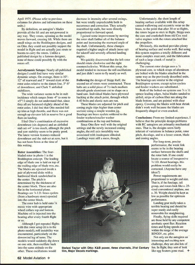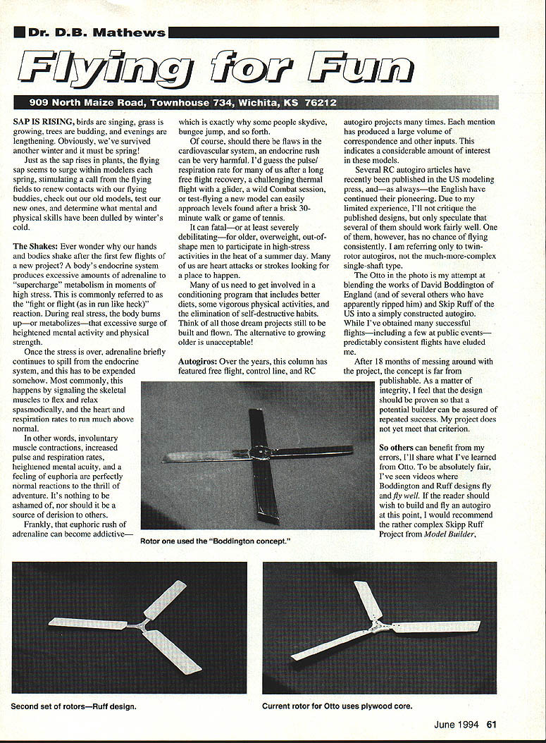 Dr DB Mathews UWcK17 2AQ L3T1Llii 1ez SAP IS RISING birds singing grass growing trees budding evenings lengthening Obviously weve survived another winter must spring Just sap rises plants flying sap seems surge within modelers spring stimulating call flying fields renew contacts flying buddies check out old models test new ones determine what mental physical skills have dulled winters cold Shakes Ever wonder hands bodies shake after first few flights new project bodys endocrine system produces excessive amounts adrenaline supercharge metabolism moments high stress commonly referred fight flight run like heck reaction During real stress body burns upor metabolizesthat excessive surge heightened mental activity physical strength Once stress over adrenaline briefly continues spill endocrine system has expended somehow Most commonly happens signaling skeletal muscles flex relax spasmodically heart respiration rates run much above normal other words involuntary muscle contractions increased pulse respiration rates heightened mental acuity feeling euphoria perfectly normal reactions thrill adventure Its nothing ashamed nor should source derision others Frankly euphoric rush adrenaline can become addictive exactly some people skydive bungee jump forth course should flaws cardiovascular system endocrine msh can very hannful Id guess pulse respiration rate us after long free flight recovery challenging thermal flight glider wild Combat session test-flying new model can easily approach levels found after brisk 30minute walk game tennis can fatalor least severely debilitatingfor older overweight out-ofshape men participate high-stress activities heat summer day us heart attacks strokes looking place happen us need get involved conditioning program includes better diets some vigorous physical activities elimination self-destructive habits Think dream projects still built flown alternative growing older unacceptable Autogiros Over years column has featured free flight control line RC autogiro projects times mention has produced large volume correspondence other inputs indicates considerable amount interest models Several RC autogiro articles have recently published US modeling press andas alwaysthe English have continued pioneering Due limited experience Ill critique published designs speculate several should work fairly well however has no chance flying consistently am referring twinrotor autogiros much-more-complex single-shaft type Otto photo attempt blending works David Boddington England several others have apparently ripped him Skip Ruff US simply constructed autogiro Ive obtained successful flightsincluding few public eventspredictably consistent flights have eluded After 18 months messing around project concept far publishable As matter integrity feel design should proven potential builder can assured repeated success project does yet meet criterion So others can benefit errors Ill share what Ive learned Otto absolutely fair Ive seen videos Boddington Ruff designs fly fly well reader should wish build fly autogiro point would recommend rather complex Skipp Ruff Project Model Builder June1994 61 Rotor used Boddington concept Second set rotorsRuff designCurrent rotor Otto uses plywood core April 1975 Please refer previous columns photos information units definition autogiros blades provide lift powered way rotate spinning model moves forward creating lift small wings Boddington designs Otto could possibly support model flight actually just struts booms carry rotors Unlike published design famous designer could possibly fly rotors off Aerodynamic Setups Nearly published designs could find have very similar dynamic setups average lOo 120 rearward 50 inward slant rotor axles relative datum line 5080 downthrust Clark Y airfoiled stabilizers wide variance seems stab incidence ranges 40 to 50 simply understand since balanced slightly ahead rotor axles did find Otto needed full up trim high throttle enough up elevator left reserve good flare landing feel Ottos combination excessive downthrust six degrees airfoiled stab set 40 too much although pitch yaw stability seem pretty good latest version features reduced downthrust stab set zero has flown time writing Rotor Assemblies four bladed rotor photo 1 Boddington concept leading edge blade laid top trailing edge blade two etc blades epoxied inside pair plywood disks hardwood block sandwiched center pitch determined thickness center block also flat horizontal plane Bearings / ID brass eyelets hardware store epoxied center block rotor hub held onto music wire appropriate wheel collars top bottom Machine oil injected bearing after fourth flight Although got repeated flights rotor setup photo model roll instability encountered particularly downwind leg turns models would suddenly dig down side oscillate back same attitude other oscillations would decrease intensity after several swings totally unpredictable both occurrence correction actually resembled tip stalls directly proportional forward speed gained some improvement moving rotor shaft farther aft balance point increasing rearward angle shaft Unfortunately changes required higher angle attack nose up takeoff severely affected landing angles quickly discovered left rotor should rotate clockwise right counterclockwise Without setup model tended increase roll oscillations just didnt seem fly nearly well Following design Skipp Ruff second set rotors constructed hubs solid piece 3/32-inch medium aircraft-grade aluminum cut shape band saw Individual blades have plywood backing attach point through 4-40 bolts elastic nuts run blades adjusted pitch coning angle tips higher center section using simple wooden jig Bearings brass eyelets soldered fender washers/smaller washer combinations top bottom Since Otto flew well original settings newly increased coning angles roll axis instability associated inadequate dihedral Landings still mess though Unfortunately short length bearing surface available setup caused wal