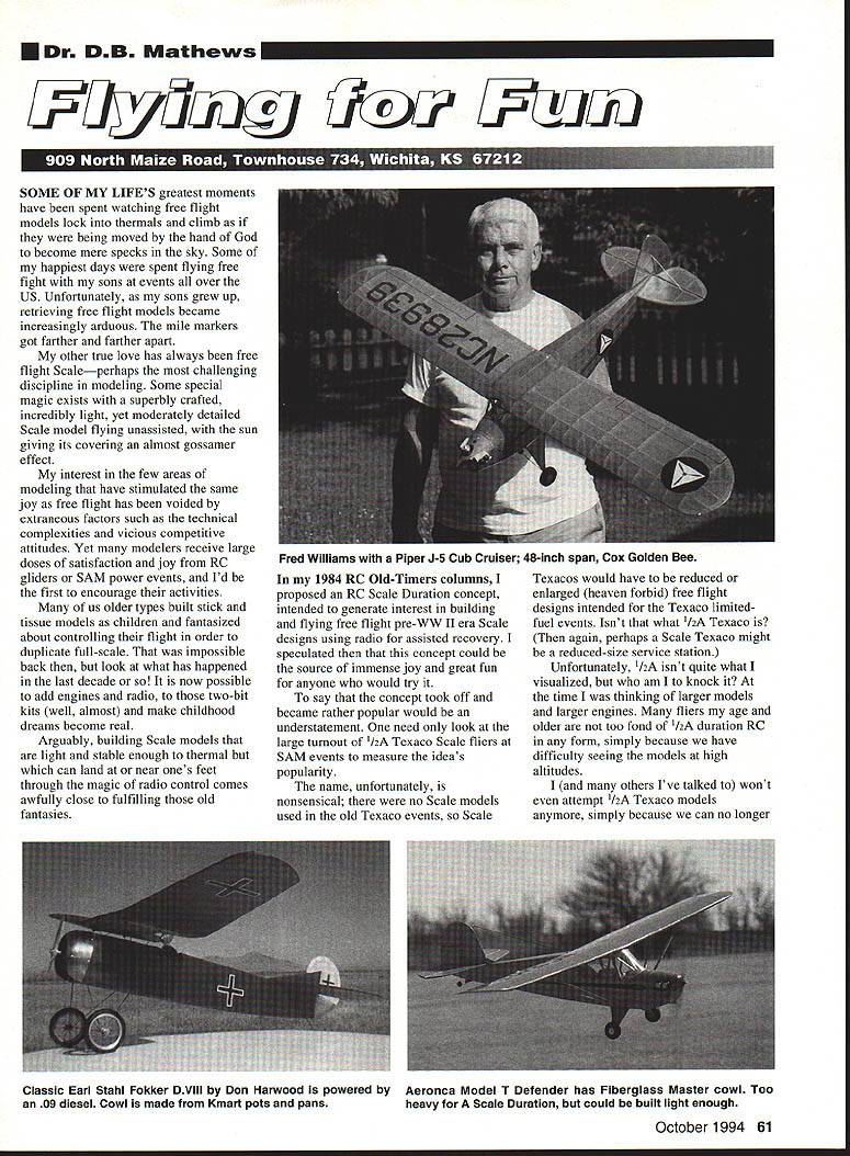 Dr DB Mat Ui 2Ic7 Zit&ziuu SOME OF MY LIFES greatest moments have spent watching free flight models lock thermals climb being moved hand God become mere specks sky Some happiest days spent flying free fight sons events over US Unfortunately sons grew up retrieving free flight models became increasingly arduous mile markers got farther farther apart other true love has always free flight Scaleperhaps challenging discipline modeling Some special magic exists superbly crafted incredibly light yet moderately detailed Scale model flying unassisted sun giving its covering almost gossamer effect interest few areas modeling have stimulated same joy free flight has voided extraneous factors such technical complexities vicious competitive attitudes Yet modelers receive large doses satisfaction joy RC gliders SAM power events Id first encourage activities us older types built stick tissue models children fantasized about controlling flight order duplicate full-scale impossible back look what has happened last decade now possible add engines radio two-bit kits well almost make childhood dreams become real Arguably building Scale models light stable enough thermal can land near ones feet through magic radio control comes awfully close fulfilling old fantasies 1984 RC Old-Timers columns proposed RC Scale Duration concept intended generate interest building flying free flight pre-WW II era Scale designs using radio assisted recovery speculated concept could source immense joy great fun anyone would try say concept took off became rather popular would understatement need look large turnout 12A Texaco Scale fliers SAM events measure ideas popularity name unfortunately nonsensical no Scale models used old Texaco events Scale Texacos would have reduced enlarged heaven forbid free flight designs intended Texaco limitedfuel events Isnt what 112A Texaco again perhaps Scale Texaco might reduced-size service station Unfortunately 112A isnt quite what visualized am Ito knock time thinking larger models larger engines fliers age older too fond 1/2A duration RC form simply because have difficulty seeing models high altitudes others Ive talked wont attempt 12A Texaco models anymore simply because can no longer October 1994 61 Fred Williams Piper J-5 Cub Cruiser 48-inch span Cox Golden Bee Classic Earl Stahl Fokker DVIII Don Harwood powered Aeronca Model T Defender has Fiberglass Master cowl Too 09 diesel Cowl made Kmart pots pans heavy Scale Duration could built light enough see frequent comments thats event younger fliers better eyesight thats duration eventits vision event issue SAM Speaks Norm Rosenstock mentions vision problems adds comment two about cantankerous nature 1/2A engines Norm Dave Platt propose Texaco RC event engines less 20 cubic inches over 049 inches course limited non-scale free flight designs prior January 1 1943 find exciting obviously others well class Texaco event flown SAM 77 Florida Winter Contest January 1994 Norman Dave have developed set parameters obviously workable developing easier-to-see-and-fly Texaco models interested should refer March-April 1994 issue SAM Speaks Norman Rosenstock 124 Granada Street Royal Palms Beach FL 33411-1307 Editors note July issue features construction article Miss America Class Texaco event Chew Im going propose some parameters RC Scale duration concept others try Ill volunteer act clearinghouse ideas experiences during formative stages concept would need limited SAM venues seems have plethora events already idea could flown non-competitively almost RC fly-in limiting duration nine minutes landing time penalty minute flights would fit inside usual 10-minute time limit found fly-ins AMA rule book details provisional power RC duration event whatever reason idea has really caught US although such events have popular Europe years Perhaps adding appeal Scale models concept might stimulate some activity context Im talking AMA-type thermaling power model event could flown fun-flys would find appealing develop Scale duration models fly strictly fun whether alone cooperation others flying group has several fellows fly RC gliders flies OldTimers strictly pleasurecompeting themselves fellows having great time Im sure Scale Duration would fit style appeals 112A Texaco 12A Scale Duration simplicity rules suggest Scale Duration limited engine type just like /2A choice would K&B 20 Sportster Inexpensive domestically manufactured easily maintained adjusted reliable well-muffled surefire parts availability Sportster seems logical choice propose limiting engine runs minute using throttle shutoff Fuel could 10% nitro provided event organizer eliminate complaints avoid major pet peeve regarding engine reworking associated unfairness fliers dont have machine shop what about allowing anyone buy anyone elses engine current catalog price sure would discourage spending great deal time engine modifications wouldnt Continued page 65 62 Model Aviation NWST Since 1977 IKON offers largest selection giant scale kits world CORBEN SUPER ACE 1/4 SCALE 80 REAR WIN SPEEDSTER 1/4 SCALE 96 WACO UPF-7 1/5 SCALE 73 Jack Elrod Velie Monocoupe made enlarging Fly Line kit 212 times OS 25 uses three channels MONOCOUPE D-145 1/4 SCALE 96 order kits call 1-800-327-7198 catalog fine kits send $4 00 6hnRu1A Arti WANTED Ignition Model Engines 1930s 1950s Elf Baby Cyclone Brown Jr Ohlsson Etc -ALSOModel Race Cars & Boats Any Parts Spark Plugs Etc Woody Bartelt 1301 W Lafayette Sturgis MI 49091 800-982-5464 616-665-9693 Flying Fun/Mathews Continued page 62 absolutely essential event would much fun watch fly models required rise off ground ROG Engine runs 60 seconds would get almost model up altitude something nature mild thermal would needed keep airborne another five minutes other words no eightminute trick motor runs 10-minute maxes Landings should within 100-foot radius takeoff within minute nine-minute maximum After second-for-second penalty would encourage flier get model down next guy could fly wou
