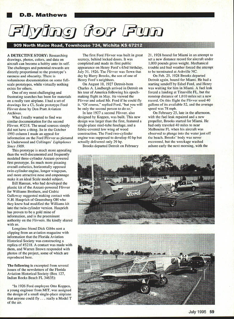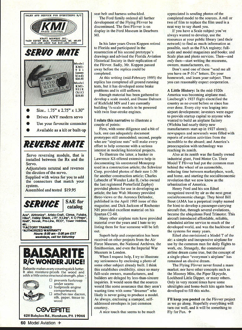 DB Mathews 7u /Jculz DETECTIVE STORY Researching drawings photos colors data aircraft can become hobby unto its self challenges potential rewards directly proportional prototypes rareness obscurity voluminous documentation some fullscale prototypes virtually nothing exists others challenging frustrating searches has materials really rare airplane set drawings CL Scale prototype Ford Flivver done Don Pratt Aviation Archives What really wanted find similar documentation second Flivver #3218 usual sources simply did have thing So October 1993 column made appeal information Ford Flivver pictured Underwood Collinges Lightplanes Since 1909 prototype much appealing well-documented frequently modeled three-cylinder Anzani-powered first prototype Its much pleasing overall esthetics horizontally opposed twin-cylinder engine longer wingspan attractive nose empennage make ideal Scale model subject Bill Hannan developed plastic kit Anzani-powered Flivver Williams Brothers Cedric Galloway suggested making contact NH Hauprich Greensburg OH knew modified Williams kit twin-cylinder version Hauprich has proven gold information preeminent authority Flivvers kindly shared us Longtime friend Dick Gibbs sent clipping aviation magazine information Florida Aviation Historical Society constructing replica #3218 contact made Warren Brown responded photos project some reproduced following excerpted several issues newsletters Florida Aviation Historical Society Box 127 Indian Rocks Beach FL 34635 1926 Ford employee Otto Koppen young engineer MIT assigned design small single-place airplane anyone could fly lly Model T air first Ford Flivver built great secrecy behind locked doors completed made its first public appearance Henry Fords 63rd birthday July 31 1926 Flivver flown day Harry Brooks son Henry Fords neighbors August 10 1927 Detroit-born Charles Lindbergh arrived Detroit tour America following epochmaking flight May viewed Flivver asked Mr Ford could fly course replied Ford will second person late 1927 second Flivver also designed Koppen built new design larger first featured single-place steel-tube fuselage fabric-covered low wing wood construction Ford two-cylinder engine supposed develop 40 hp actually delivered 29 hp Brooks departed Detroit February 21 1928 bound Miami attempt set new distance record aircraft under 1000 pounds gross weight Mechanical trouble bad weather forced attempt to be terminated Ashville NC Feb 25 1928 Brooks departed Detroit again bound Miami starting sendoff Edsel Ford Henry waiting him Miami fuel leak forced landing Tirusville FL nonstop distance 1010 miles set new record flight Flivver used 40 gallons its available 52 average speed 78 mph February 25 late afternoon fuel leak repaired new propeller Brooks started Miami traveled 40 miles near Melbourne FL aircraft observed plunge water just off beach Brooks body never recovered wreckage washed ashore early next morning July1995 59 SERVO MME Size. 175 x 275 x 130 Drives ANY modem servo 0 0 Use favourite connector Available kit built-up REVERSE M*TE Servo reversing module installed between Rx Servo Adjusts/sets netutral reverses dirction servo Supplied wires add connectors match system Assembled tested $1995 SERVICE SAE catalog Ace Airtronlcs Aristo-Craff Cirrus Futaba HItec Hobby Shack J R K-Lku K 0 Propo Krafr Novak Pro-Une RCD Tower Hobbles FACTORY TRAINED AUThORIZED WARRANTY Howu 500 am 500pm EST iwkday call tar Saturday 60 Model Aviation belt harness unbuckled Ford family ordered further development Flying Flivver discontinued first Flivver display Ford Museum Dearborn MI later years Owen Koppen retired Florida participated resurrection second prototypes drawings advised Florida Aviation Historical Society replication Flivver Sadly Mr Koppen passed away before replica could completed writing mid-February 1995 replica has completed ground running tests has developed some brake problems still unflown Enough material has gathered develop scale model Duane Dahoert Richfield MN currently building 1/4-scale models powered twin four-stroke engines relate narrative illustrate couple points First some diligence bit luck can adequately document prototypes still unmodeled second people airplane nuts will make effort help someone serious interest modeling historical projects illustrate latter banker Lawrence KS offered extensive help documenting unrestored Monoprep used construction article Schwizer Corp provided photos rare 1-30 another construction article Charles Lebrecht Wonder Lake IL owned last registered Porterfield Zephyr provided photos use developing article late Walt Mooney provided three-views Aeronca Defender published April 1995 issue magazine Dick Jackson Rochester NH provided excellent material Spartan C2-60 other airplane nuts have provided material over years hate try listing fear someone will left out Superb help cooperation has received other projects Air Force Museum National Archives Smithsonian Imperial War Museum London request help try illustrate seriousness enclosing photo some other subject already built think establishes credibility since full-scale owners manufacturers builders deluged less-than-sincere inquiries would seem sources would like some assurance arent wasting time some dreamer likely never going produce model As always enclosing stamped selfaddressed envelopes just common courtesy nice touch seems much appreciated sending photos completed model sources roll two film replace film used neat way say thank you have Scale subject youve always wanted develop use resources public library network find much information possible such FAA registry fullscale model magazines books Scale plan photo services Thenand thenstart writing museums owners manufacturers etc Dont send send have P-S ls letters homework learn subject can reasonably expect cooperation Little History mid-1920s America becoming airplane mad Lindberghs 1927 flight electrified country no event before since has ever done city leaping airport develo