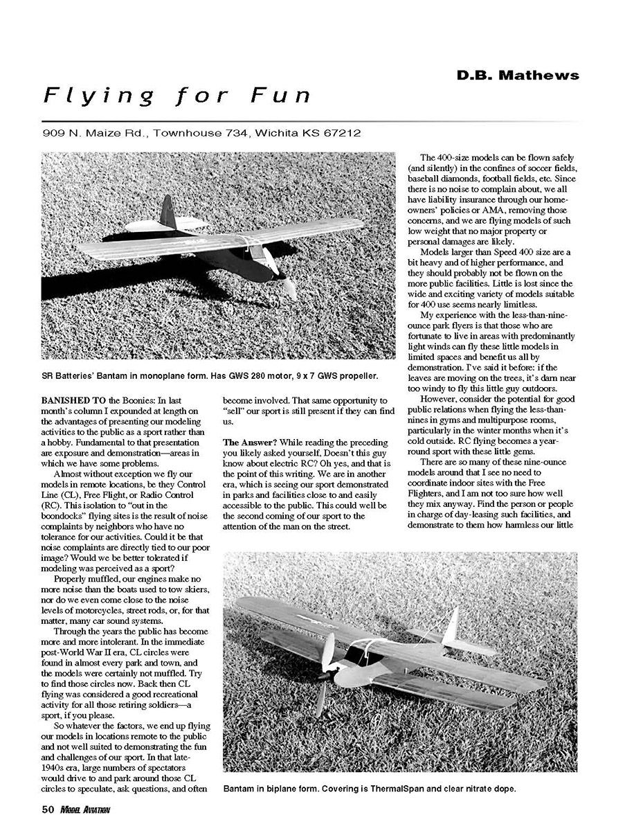 SR Batteries’ Bantam in monoplane form. Has GWS 280 motor, 9 x 7 GWS propeller.