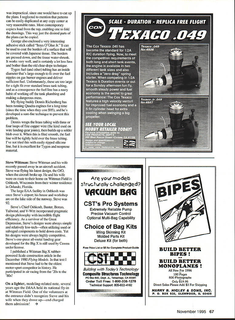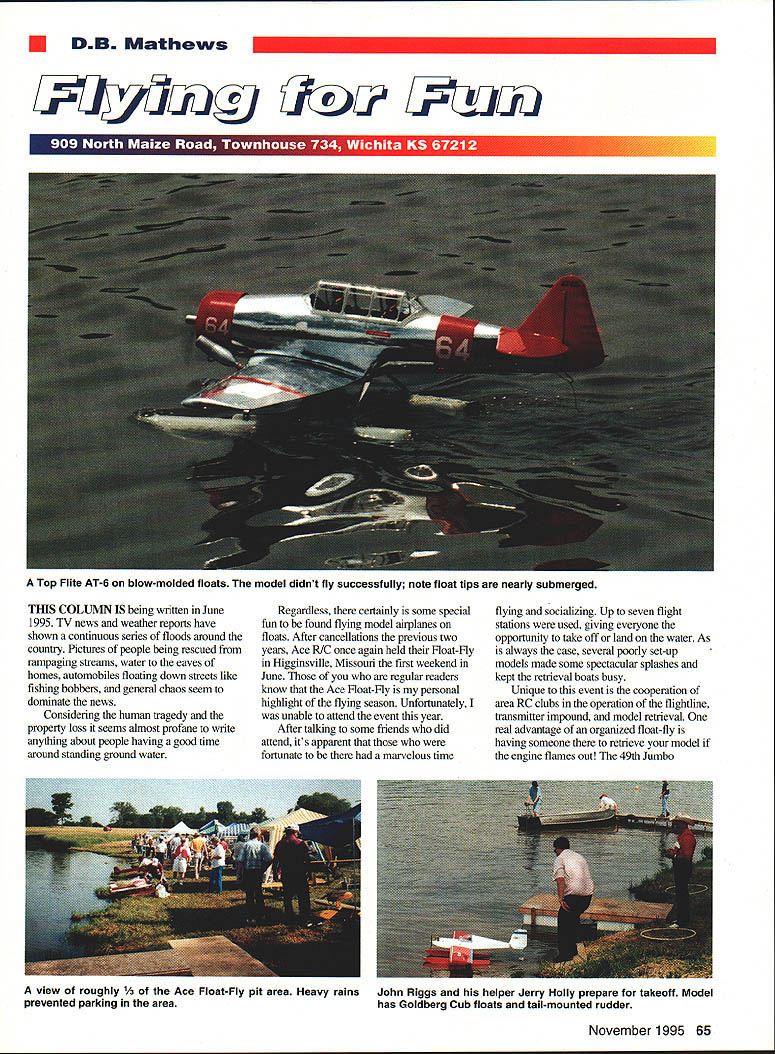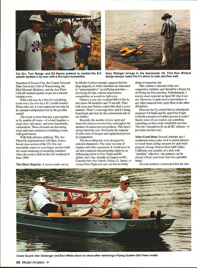 DB Mathews THIS COLUlVIN IS being written June 1995 TV news weather reports have shown continuous series floods around country Pictures people being rescued rampaging streams water eaves homes automobiles floating down streets like fishing bobbers general chaos seem dominate news Considering human tragedy property loss seems almost profane write anything about people having good time around standing ground water Regardless certainly some special fun found flying model airplanes floats After cancellations previous two years Ace R/C once again held Float-Fly Higginsville Missouri first weekend June regular readers know Ace Float-Fly personal highlight flying season Unfortunately unable attend event year After talking some friends did attend its apparent fortunate marvelous time flying socializing Up seven flight stations used giving everyone opportunity take off land water As always case several poorly set-up models made some spectacular splashes kept retrieval boats busy Unique event cooperation area RC clubs operation flightline transmitter impound model retrieval real advantage organized float-fly having someone retrieve model engine flames out 49th Jumbo November 1995 65 Top Flite AT-6 blow-molded floats model didnt fly successfully note float tips nearly submerged view roughly 1/3 Ace Float-Fly pit area Heavy rainsJohn Riggs helper Jerry Holly prepare takeoff Model prevented parking areahas Goldberg Cub floats tail-mounted rudder Squadron Kansas City Central Missouri State University Club Warrensburg Mid-Missouri Modelers Ace fliers Club worked together put smoothrunning event What well may first modeling event fly-over B-2 stealth bomber saw impressed its unusual configuration peculiar sound event just get-together fly models off waterits food laughter stage show music importantly camaraderie elements becoming more common modeling events good reason little advance publicity Ace float-fly registered over 100 fliers broad cross-section US can reasonably expect larger turnout usual smattering modeling notables event held first weekend June 1996 Model Aviation strongly suggests large majority AMA members interested noncompetitive social/flying activities just flying fun stopwatches competition awards fight over Observe one-day weekend JMAA fly-In draws 60 modelers 75 aircraft look area Pattern contest draws seven entrants Theres message its being heard loud clear commercial side hobby Recently number new sport Scale kits accessories has outweighed number contest-proven products hasnt always case Previously majority sales designs equipment proven competition best-selling kits designed national champions same true engines radio equipment would seem national championship might influencing factor Free flight RC gliders has virtually no impact RC Consider few Pattern Pylon CL Speed contest Free flight kits can find hobby shops magazine ads column directed noncompetitive modeler should forum flying Fun activities Unfortunately receive material Sport RC can use However rarely receive newsletters other material sport fliers other disciplines Does no fly control line schoolyards anymore build fly sport Free flight exception rubber power parks Surely some readers can contribute something truly delightful activities isnt intended all-RC column just turns out way Good Ideas Several columns ago mentioned using glue stick attach patterns wood cutting out parts plan-built projects George Benson Mill Valley California sent samples stick peelable adhesivethe patterns can reused Check local store peelable brand Several modelers commented idea 66 Model Aviation Orr Tom Runge Ed Harms pretend control B-2 stealth bombers fly-over Micropro transmitter Gary Metzger brings Seamaster 40 Ken Willard design always looks like its about sink flies well Silent Majority recent reader survey Coast Guard Dan Disberger Don White return shore after retrieving Flying Quaker Old-Timer model impractical since would have cut up plans neglected mention patterns can easily duplicated copy center very reasonable rates Most contemporary copiers load top enabling fold drawings way just desired parts plans can copied George also enclosed very interesting adhesive stick called Itoya OGlue Jr can used coat borders surface will covered Japanese tissue borders pressed down tissue water-shrunk works very well certainly lot less fuss bother old clear-dope technique Tygon fuel other tubing has inside diameter thats large enough fit over fuel nipples gas burner engines deliver sufficient fuel Unfortunately too large tight fit over standard brass tank tubing consequence fuel line has nasty habit working off tank plumbing making dangerous mess flying buddy Dennis Richenberg has running Quadra engines long time since time cost $95 hes developed sure-fire technique prevent problem Dennis wraps brass tubing three four loops fine copper wire kind used wire landing-gear joints builds up solder blob over filed smooth fuel line will tightly held over brass tubing Ive tried easily ripped silicone line excellent Tygon neoprene material Steve Wittinan Steve Wittman wife recently passed away aircraft accident Steve flying latest design 010 aircraft broke up wife en route home Wittman Field Oshkosh Wisconsin winter residence Orlando Florida large BAA facility Oslikosh once Steves airport house workshop lake side runway Steve 92 Steves Chief Oshkosh Buster Bonzo Tailwind V-Wifl incorporated pragmatic design philosophy incredible flight efficiency As survivor Great Depression Steves designs always simple relatively low-techoften utilizing used salvaged components hold down costs Yet designs always highly competitive Steves one-piece all-metal landing gear developed Big Xis still used Cessna under license published Wittman Big X rubberpowered Scale construction article December 1980 Flying Models text mentioned Steve oldest motor-sport competitor history participated air racing 20s 80s lighter modeling-related note several years ago IMAA held its national 