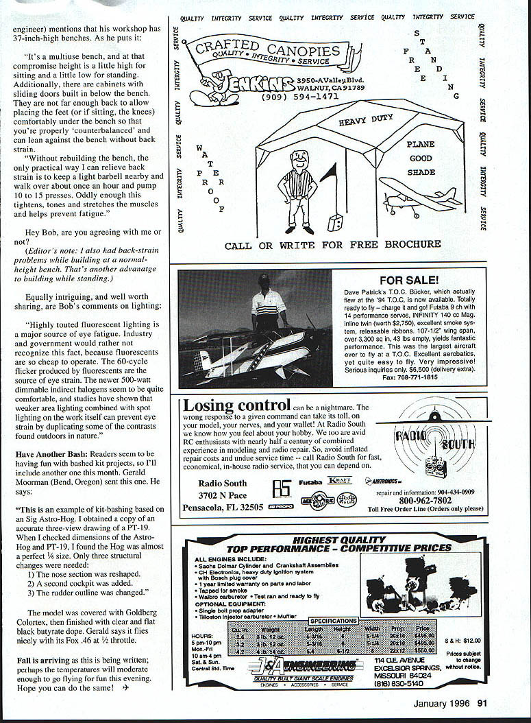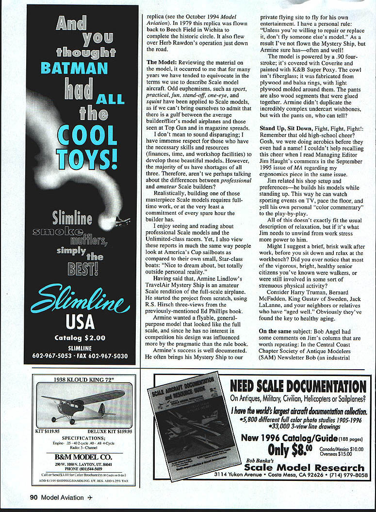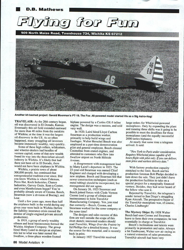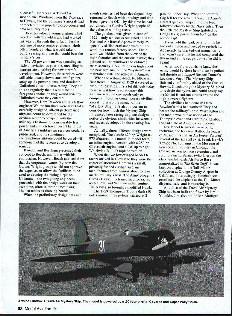 DB Mathews TRAVELAIR As 20th century began oil discovered El Dorado Kansas Eventually oil field extended eastward 40 miles outskirts Wichita time largest oil discovery US As often happened struggling oil investors became immensely wealthy very quickly Some high rollers wildcatters wheeler-dealers bundles venture capital some new wealth found its way then-infant aircraft industry Wichita Its likely oil El Dorado would have airplanes Wichita Wichita prairie town about 300000 people has continued entrepreneurial tradition ever since Did know Wichita Coleman Pizza Hut Koch Industries Chance Industries Garvey Grain Rent-a-Center Mentholatum began Youre probably already aware Cessna Beech Stearman now division Boeing Lear Until few years ago half airplanes built world during given year built Wichita before liability insurance crisis caused demise single-engined private aircraft production 1919 group newly wealthy oilmen local businessmen formed Wichita Airplane Company group hired Matty Laird design airplane led what later named Swallow three-place wooden-framed biplane powered Curtiss OX-5 inline engine design success sold very well 1920 Laird hired Lloyd Carlton Stearman production worker primarily help build wings fuselages Walter Herschel Beech also employed part-time demonstration pilot general employee Beech cleaned Cosmoline crated engines attended customers flew Swallow airport North Hillside Avenue disagreement management lead Matty Lairds departure 1923 23-year-old Stearman named Chief Engineer charged developing new airplane Beech Stearman felt newer construction techniques such metal tubing should incorporated management did agree January 26 1925 Stearman Beech joined forces Clyde Vernon Cessna group oilmen businessmen form TravelAir Manufacturing Company Yes read correctlyBeech Cessna Stearman worked same company same time designs sales success firm well outside scope short sketch interested readers should read TravelAir Wings Over Prairie Ed Phillips detailed history source material recently back print January 1927 TravelAir received large orders Whirlwind-powered monoplanes Only expanding plant running three shifts going possible meet deadlines monoplanes equally successful 2000-series biplanes nearly same time telegram arrived said New York-to-Paris under consideration Requires Whirlwind plane capable 45 hours flight pilot can deliver state price earliest delivery date factory production capacity stretched limit Beech production foreman Bob Phelps decided turn down sale just didnt have production facilities take special project marginally financed venture Besides never heard fellow sent Rejected TravelAir telegrams sender turned San Diegos struggling Ryan Aircraft prospective buyer TravelAir monoplane course Charles Lindbergh Mystery Ships 1928 Walter Beech seen Cessna Stearman leave form own companies essentially charge TravelAir Beechs inclinations talents primarily promotion sales Always bit flamboyant Walter saw air racing natural extension sales promotion TravelAir aircraft very 86 Model Aviation her kit-bashed project Gerald Moormans PT-i 9 Fox 46-powered model started life Sig Astro-Hog successful air racers TravelAir monoplane Woolaroc won Dole race Hawaii companys aircraft competed popular closed-course cross-country races Herb Rawdon young engineer hired TravelAir worked way up through ranks under tutelage senior engineers Herb often wondered what would take build racing airplane could beat militarys best US government spending little aviation possible unwilling appropriate anything new aircraft development However services still able strip down standard fighters soup-up power plants dominate Unlimited closed-course racing did regularly almost foregone conclusion would win Unlimited event entered However Herb Rawdon fellow engineer Walter Burnham sure carefully designed all-out performance airplane could developed civilian sector compete militarys bestwith considerably less power much lower cost plight Americas military air services could publicized its sometimescontemptuous attitude could curedif someone resources develop remedy Rawdon Burnham presented concept Beech met enthusiasm However Beech advised corporate owners now Curtiss-Wright group would approve expenses allow facilities used develop racing airplane Undaunted two young engineers proceeded design work own time often homes using kitchen tables drawing boards preliminary design data rough sketches developed returned Beech drawings data Beech gave OKby time convinced Curtiss-Wright people value winning races go-ahead given June 1929only ten weeks remained until National Air Races Approximately 25 specially skilled craftsmen put work remote factory space work hidden view main factories curious public painted out windows enforced strict security Speculation ran high about new airplane mystery maintained until roll-out August red-and-black R614K first flown August 1929 created absolute sensation Its bit difficult today sense just revolutionary airplane needs compare other contemporary civilian aircraft grasp impact Mystery Ship tts also important consider much Mystery Ship influenced later racing airplane designs notice obvious similarities between racers developed ensuing few years Actually three different designs completed classic 420 hp Wright R 975 featured month model form inline engined version 250 hp Chevrolair engine 240 hp Wright Whirlwind B-I l-D biplane version two low-winged Model R racers arrived Cleveland center attention small privately funded civilian airplane manufacturer Kansas about take militarys best Army brought Curtiss Hawk much modified racing Pratt Whitney radial engine Navy also brought modified Hawk 1929 Thompson Trophy dash 50 miles around three pylons started 2 pm Labor Day starters flag fell seven racers Armys aircraft quickly jumped lead followed closely Navy entry little red Mystery Ship piloted Doug Davis passed both second lap Davis held lead think cut pylon needed recircle App