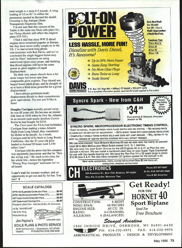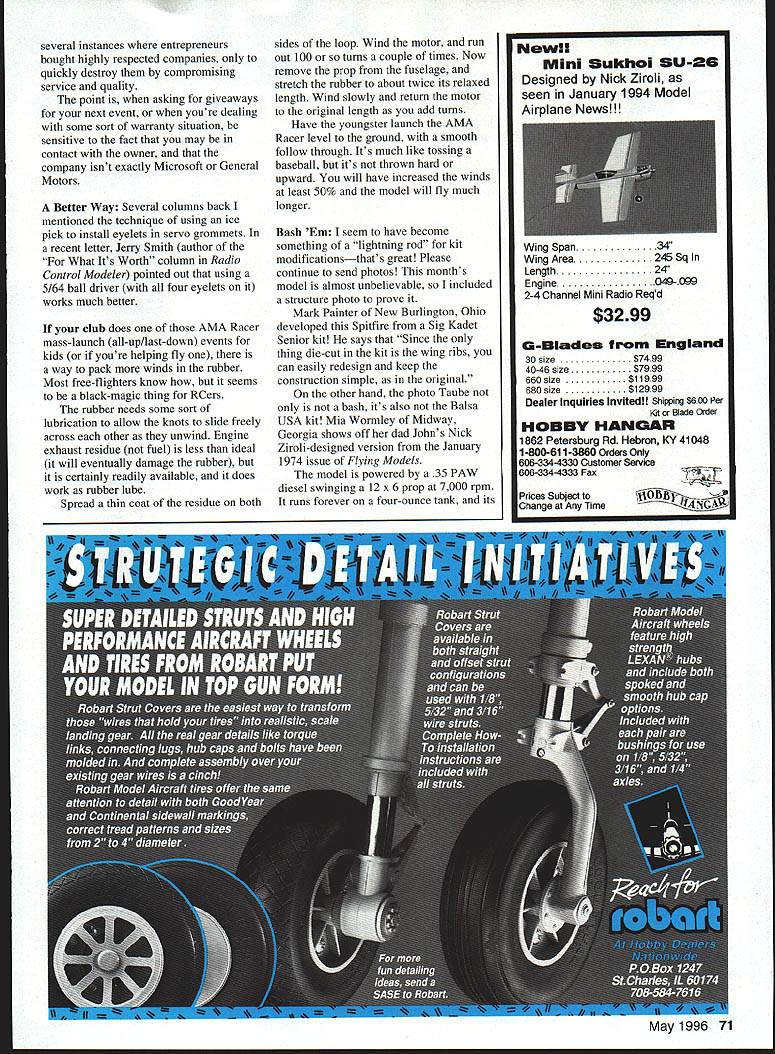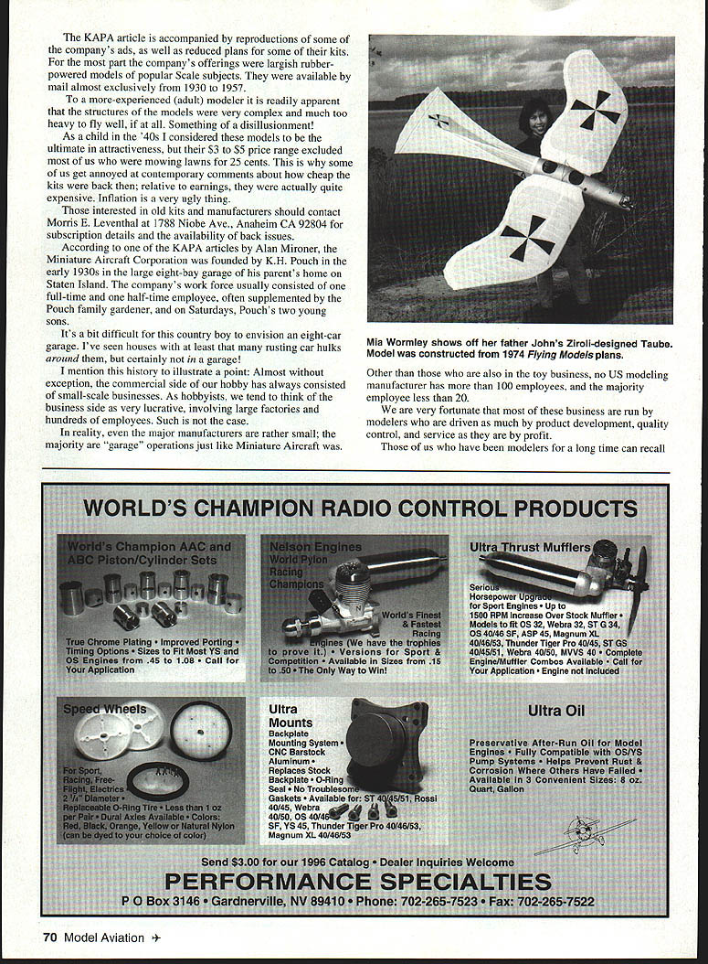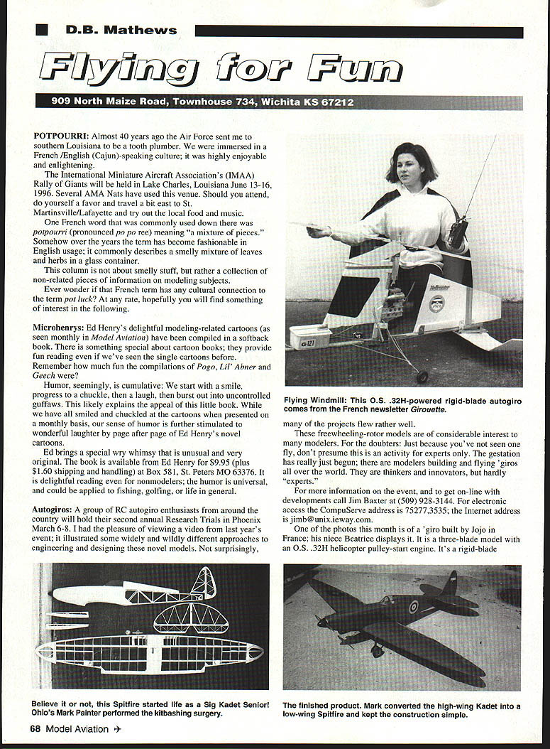 DB Mathews POTPOURRI Almost 40 years ago Air Force sent southern Louisiana tooth plumber immersed French fEnglish Cajun-speaking culture highly enjoyable enlightening International Miniature Aircraft Associations IMAA Rally Giants will held Lake Charles Louisiana June 13-16 1996 Several AMA Nats have used venue Should attend yourself favor travel bit east St Martinsville/Lafayette try out local food music French word commonly used down potpourri pronounced PO p ree meaning mixture pieces Somehow over years term has become fashionable English usage commonly describes smelly mixture leaves herbs glass container column about smelly stuff rather collection non-related pieces information modeling subjects Ever wonder French term has cultural connection term potluck rate hopefully will find something interest following Microhenrys Ed Henrys delightful modeling-related cartoons seen monthly Model Aviation have compiled softback book something special about cartoon books provide fun reading weve seen single cartoons before Remember much fun compilations Pogo Lil Abner Geech Humor seemingly cumulative start smile progress chuckle laugh burst out uncontrolled guffaws likely explains appeal little book have smiled chuckled cartoons presented monthly basis sense humor further stimulated wonderful laughter page after page Ed Henrys novel cartoons Ed brings special wry whimsy unusual very original book available Ed Henry $995 plus $160 shipping handling Box 581 St Peters MO 63376 delightful reading nonmodelers humor universal could applied fishing golfing life general Autogiros A group RC autogiro enthusiasts around country will hold second annual Research Trials Phoenix March 6-8 pleasure viewing video last years event illustrated some widely wildly different approaches engineering designing novel models surprisingly projects flew rather well freewheeling-rotor models considerable interest modelers doubters Just because youve seen fly dont presume activity experts gestation has really just begun modelers building flying giros over world thinkers innovators hardly experts information event get on-line developments call Jim Baxter 509 928-3144 electronic access CompuServe address 752773535 Internet address jimb@unixiewaycom photos month giro built Jojo France niece Beatrice displays three-blade model OS 32H helicopter pulley-start engine Its rigid-blade 68 Model Aviation ng Windmill OS 32H-powered rigid-blade autogiro comes French newsletter Girouette Believe Spitfire started life Sig Kadet Senior finished product Mark converted high-wing Kadet Ohios Mark Painter performed kitbashing surgery low-wing Spitfire kept construction simple unhinged model fore-and-aft control French newsletter Gircuette supplied Steve Tillson 4307 W Renee Drive Phoenix AZ 95027 Electrics Another aspect modeling has attracted enjoy technical challenges Electric flight Consider much subspecies has evolved over last 10 years very long ago successful flight battery-powered RC model notable Today everything tiny sport Free Flight models simple two-channel gliders very attractive Scale models successfully flown electric motors newsletters receive Charge Ahead Puget Sound Electric Model Flyers Actually publication closer technical journal traditional club newsletter issue loaded contributions readers over nation contributions range product reviews articles lots math equations fly-in announcements Frankly Charge Ahead may definitive publication have abiding interest dry power flight Contact Ben Almojuela 1941 6th Ave Seattle WA 98119 subscription information KAPA No about sorority KAPA acronym stands Kits Plans Antiquious KAPA group interests center around old model airplane kits firms designers produced publish mostinteresting newsletter thats loaded historical material well classified ads old kits plans example December 1995 issue contains highly enlightening article Alan Mironer history Miniature Aircraft Corporation Staten Island New York Old guys like recall exquisite rather-expensive kits advertised full-page ads modeling magazines D & J ELECTRONICS Y 1236 Marigold St NW Hartville OH 44632 216-877-1445 Service & Repairs Most Radio Control Systems Utilizing Calibrated Test Equipment & Spectrum Analyzers Endorsed AMA RCMA Sticker Station #105 Futaba Airtronics JR Ace HiTec Tower Cirrus World Engines & WE USE GENUINE FACTORY REPLACEMENT PARTS Complete 1991 Narrow Banding & Upgrades RCD / HITEC R/C DEALER FCC Licensed Speed Control Repairs Quality Service Fast Turn Around Shipping & Insurance Extra UPS Mail VISA / MASTERCARD & DISCOVER WELCOMED AMA #256123ARRLWBSYS May1996 69 KAPA article accompanied reproductions some companys ads well reduced plans some kits part companys offerings largish rubberpowered models popular Scale subjects available mail almost exclusively 1930 1957 more-experienced adult modeler readily apparent structures models very complex much too heavy fly well Something disillusionment As child 40s considered models ultimate attractiveness $3 $5 price range excluded us mowing lawns 25 cents some us get annoyed contemporary comments about cheap kits back relative earnings actually quite expensive Inflation very ugly thing interested old kits manufacturers should contact Morris E Leventhal 1788 Niobe Ave Anaheim CA 92804 subscription details availability back issues According KAPA articles Alan Mironer Miniature Aircraft Corporation founded KH Pouch early 1930s large eight-bay garage parents home Staten Island companys work force usually consisted full-time half-time employee often supplemented Pouch family gardener Saturdays Pouchs two young sons Its bit difficult country boy envision eight-car garage Ive seen houses least rusting car hulks around certainly garage mention history illustrate point Almost exception commercial side hobby has always consisted small-scale businesses As hobbyists tend think business side very lucrative involving large factories hundreds employees Such case reality major manufacturers ra