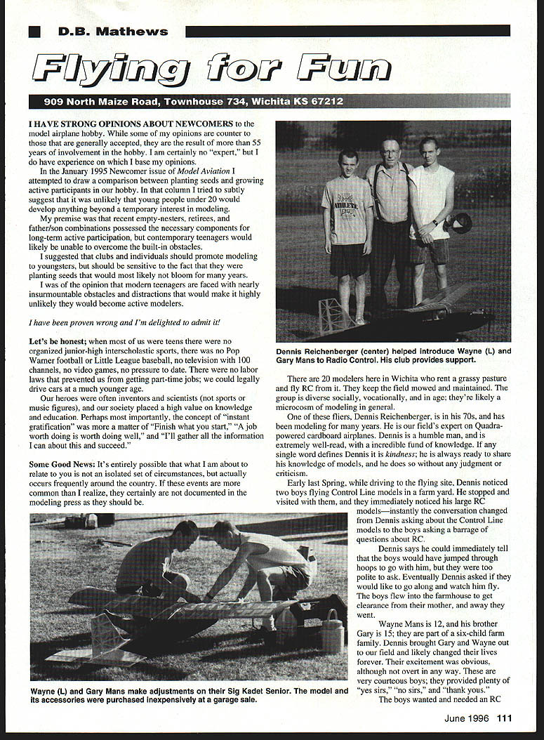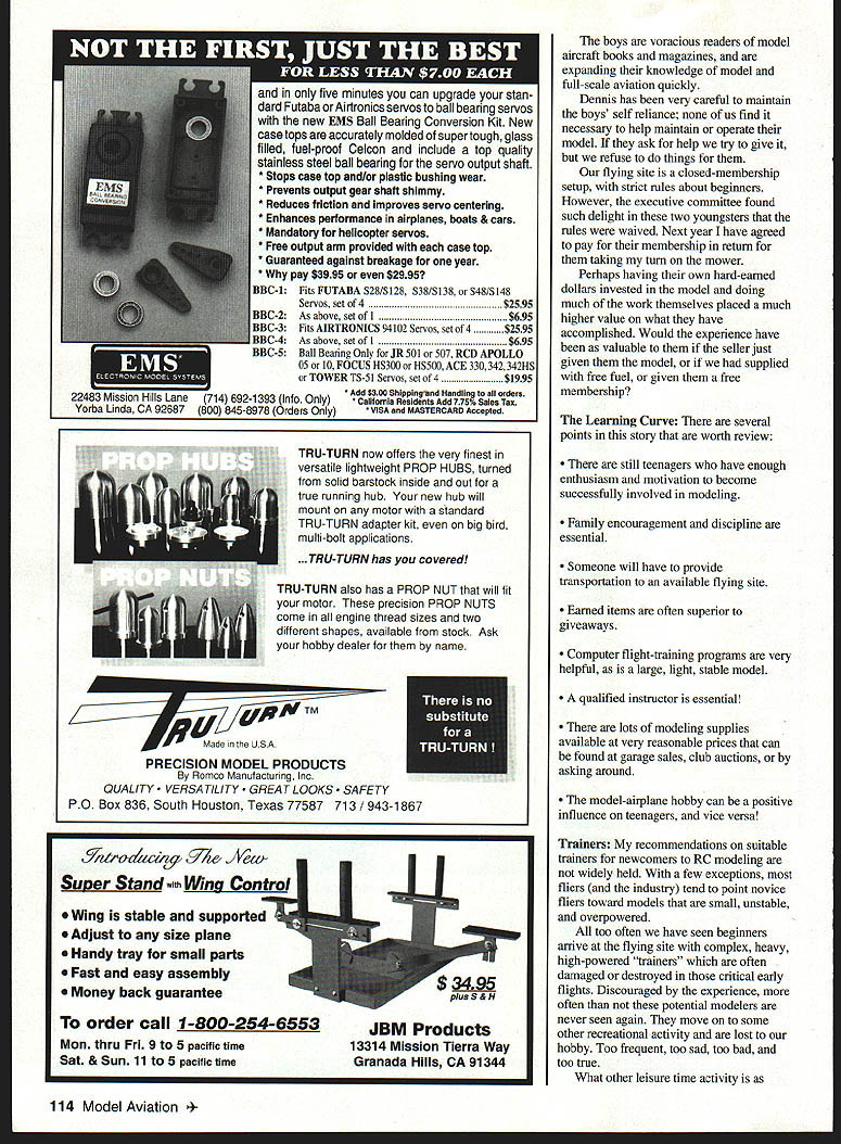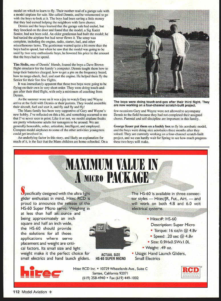 DB Mathews TelU mu HAVE STRONG OPINIONS ABOUT NEWCOMERS model airplane hobby some opinions counter generally accepted result 55 years involvement hobby am certainly no expert have experience base opinions January 1995 Newcomer issue Model Aviation attempted draw comparison between planting seeds growing active participants hobby column tried subtly suggest unlikely young people under 20 would develop anything beyond temporary interest modeling premise recent empty-nesters retirees father/son combinations possessed necessary components long-term active participation contemporary teenagers would likely unable overcome built-in obstacles suggested clubs individuals should promote modeling youngsters should sensitive fact planting seeds would likely bloom years opinion modem teenagers faced nearly insurmountable obstacles distractions would make highly unlikely would become active modelers have proven wrong Im delighted admit Lets honest us teens no organized junior-high interscholastic sports no Pop Warner football Little League baseball no television 100 channels no video games no pressure date no labor laws prevented us getting part-time jobs could legally drive cars much younger age heroes often inventors scientists sports music figures society placed high value knowledge education Perhaps importantly concept instant gratification matter Finish what start job worth doing worth doing well Ill gather information can about succeed Some Good News Its entirely possible what am about relate isolated set circumstances actually occurs frequently around country events common realize certainly documented modeling press should 20 modelers Wichita rent grassy pasture fly RC keep field mowed maintained group diverse socially vocationally age theyre likely microcosm modeling general fliers Dennis Reichenberger 70s has modeling years fields expert Quadrapowered cardboard airplanes Dennis humble man extremely well-read incredible fund knowledge single word defines Dennis kindness always ready share knowledge models does judgment criticism Early last Spring driving flying site Dennis noticed two boys flying Control Line models farm yard stopped visited immediately noticed large RC modelsinstantly conversation changed Dennis asking about Control Line models boys asking barrage questions about RC Dennis says could immediately tell boys would have jumped through hoops go him too polite ask Eventually Dennis asked would like go along watch him fly boys flew farmhouse get clearance mother away went Wayne Mans 12 brother Gary 15 part six-child farm family Dennis brought Gary Wayne out field likely changed lives forever excitement obvious although overt way very courteous boys provided plenty yes no sirs thank yous boys wanted needed RC June1996 111 Dennis Reichenberger center helped introduce Wayne L Gary Mans Radio Control club provides support Wayne L Gary Mans make adjustments Sig Kadet Senior model its accessories purchased inexpensively garage sale model learn fly mother read garage sale model airplane sale called Dennis volunteered go boys look boys saving little money earned helping neighbors farm chores Dennis boys learned garage sale ended knocked door found model Sig Kadet Senior sold An older gentleman built model taxied airplane never flown setup complete including engine radio starter fuel other miscellaneous items gentleman wanted quite bit boys spend saw model going used two very enthusiastic boys lowered price amount boys spend Tim Stolts Dennis friends loaned boys Dave Brown flight simulator familys computer Dennis taught keep batteries charged get pin frequency board range-check fuel start engine helped fly Senior first few flights immediately apparent two boys going flying own very short order doing touch-and gos after third flight minimum coaching Dennis As summer wore joy watch Gary Wayne arrive field Dennis parents would assemble aircraft fuel start fly fly fly Mans family has very supportive Gary Waynes new hobby Ive reflected bit something occurred Ive never seen print Like model airplane freaks pretty wholesome adults teenagers around generally honorable sober articulate intelligent employed Compare model airplanes some other activities youngsters could get involved An underlying factor story likely explanation much fact Mans children home-schooled few occasions Gary Wayne allowed accompany Dennis field because completed assigned chores Parental self-discipline important family George Sauer put buddy box fly aerobatic model boys doing nice aerobatics three months after soloed currently working four-channel scratch-built project can hardly wait Spring see much progress two boys will make being approximately inch square half inch wide HS-60 should provide solutions applications servo placement weight criti cal factors Its small size light weight make perfect choice small electrics hand launch gliders ACTUAL SIZE HS-60 SUPER MICRO Hitec# HS-60 Description Super Micro Torque 16 oz/in @ 48v Speed 20 sec @ 48v Size Q9HxO5Wx OL Weight 49 oz Usage Hand Launch Gliders Small Electrics k c RCD Inc 9 Wheatlands Ave Suite C Santee California 92071 619 258-4940 619 449-1002 112 Model Aviation doing touch-and-gos after third flight now working four-channel scratch-built project Specifically designed ultr -60 is available three connec Hitec/JR Fut Airt 48 60 volt five minutes can upgrade stan dard Futaba Airtronics servos ball bearing servos new EMS Ball Bearing Conversion Kit New casetops accurately molded supertough glass filled fuel-proof Celcon include top quality stainless steel ball bearing servo output shaft * Stops case top and/or plastic bushing wear * Prevents output gear shaft shimmy * Reduces friction improves servo centering * Enhances performance airplanes boats & cars * Mandatory helicopter servos * Free output arm provided case top * Guaranteed against breakage year * pay $3995 $2995 1Fits FUTABA S28/S128 S38/S138 orS48/S148 Servos set 4$2595 BBC-2As above set 1$695 RRC3Fits AIRTRONICS