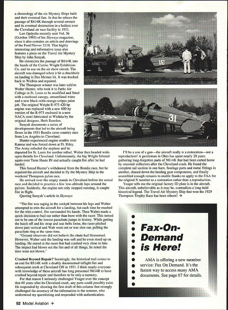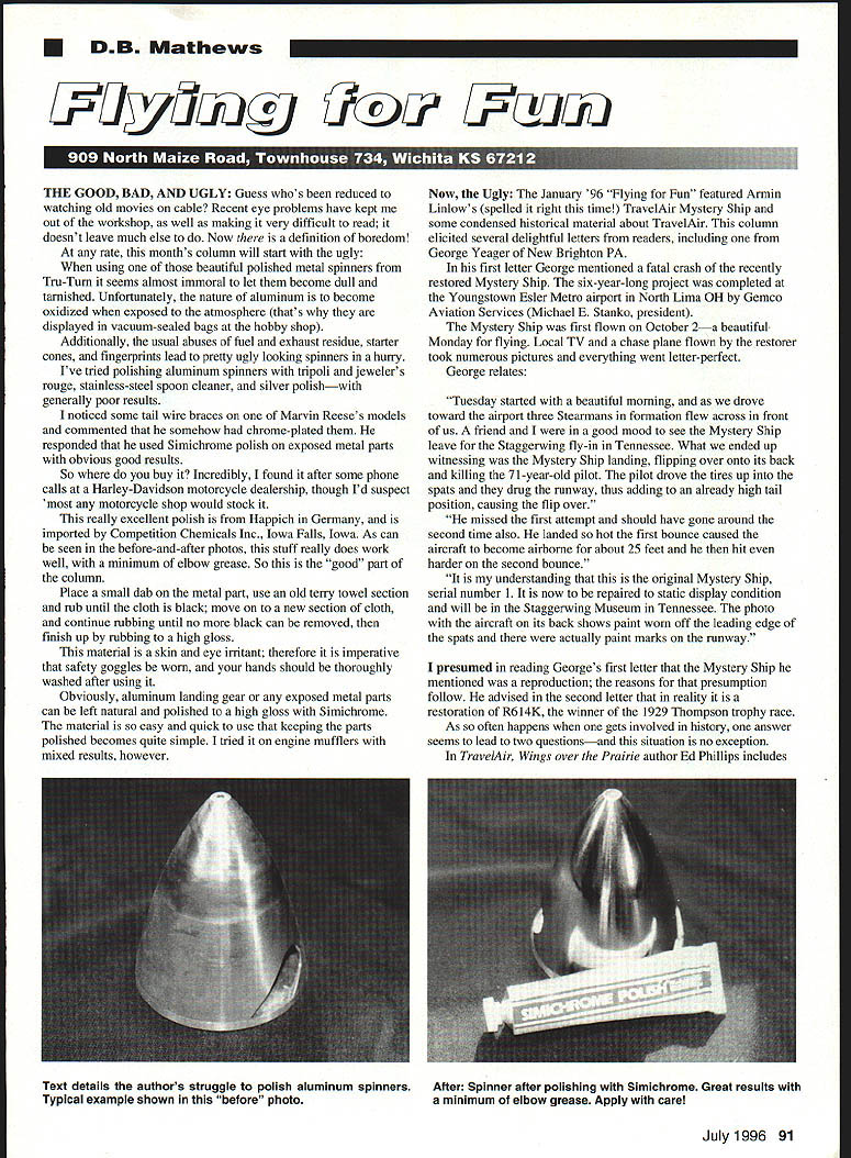 DB Mathews THE GOOD BAD AND UGLY Guess whos reduced watching old movies cable Recent eye problems have kept out workshop well making very difficult read doesnt leave much else Now definition boredom rate months column will start ugly using beautiful polished metal spinners Tm-Turn seems almost immoral let become dull tarnished Unfortunately nature aluminum become oxidized exposed atmosphere thats displayed vacuum-sealed bags hobby shop Additionally usual abuses fuel exhaust residue starter cones fingerprints lead pretty ugly looking spinners huny Ive tried polishing aluminum spinners tripoli jewelers rouge stainless-steel spoon cleaner silver polishwith generally poor results noticed some tail wire braces Marvin Reeses models commented somehow chrome-plated responded used Simichrome polish exposed metal parts obvious good results So buy Incredibly found after some phone calls Harley-Davidson motorcycle dealership though Id suspect motorcycle shop would stock really excellent polish Happich Germany imported Competition Chemicals Inc Iowa Falls Iowa As can seen before-and-after photos stuff really does work well minimum elbow grease So good part column Place small dab metal part use old terry towel section rub until cloth black move new section cloth continue rubbing until no black can removed finish up rubbing high gloss material skin eye irritant therefore imperative safety goggles worn hands should thoroughly washed after using Obviously aluminum landing gear exposed metal parts can left natural polished high gloss Simichrome material easy quick use keeping parts polished becomes quite simple tried engine mufflers mixed results however Now Ugly January 96 Flying Fun featured Armin Linlows spelled right time TravelAir Mystery Ship some condensed historical material about TravelAir column elicited several delightful letters readers including George Yeager New Brighton PA first letter George mentioned fatal crash recently restored Mystery Ship six-year-long project completed Youngstown Esler Metro airport North Lima OH Gemco Aviation Services Michael E Stanko president Mystery Ship first flown October 2a beautiful Monday flying Local TV chase plane flown restorer took numerous pictures everything went letter-perfect George relates Tuesday started beautiful morning drove toward airport three Stearmans formation flew across front us friend good mood see Mystery Ship leave Staggerwing fly-in Tennessee What ended up witnessing Mystery Ship landing flipping over onto its back killing 71-year-old pilot pilot drove tires up spats drug runway thus adding already high tail position causing flip over missed first attempt should have gone around second time also landed hot first bounce caused aircraft become airborne about 25 feet hit harder second bounce understanding original Mystery Ship serial number 1 now repaired static display condition will Staggerwing Museum Tennessee photo aircraft its back shows paint worn off leading edge spats actually paint marks runway presumed reading Georges first letter Mystery Ship mentioned reproduction reasons presumption follow advised second letter reality restoration R614K winner 1929 Thompson trophy race As often happens gets involved history answer seems lead two questionsand situation no exception TravelAir Wings over Prairie author Ed Phillips includes July 1996 91 Text details authors struggle polish aluminum spinnersAfter Spinner after polishing Simichrome Great results Typical example shown before photoa minimum elbow grease Apply care chronology six Mystery Ships built eventual fate relates passage R614K through several owners its eventual destruction bailout over Cleveland air race facility 1931 Leo Opdycke recently sent Vol 36 October 1995 Skyways magazine since also contains article drawings Ford Flivver 3218 highly interesting informative issue also features piece Travel Air Mystery Ship John Sunyak chronicles passage R614K hands Curtiss Wright Exhibition Co its use air show circuit aircraft damaged hit chuckhole landing Des Moines IA trucked back Wichita repaired Thompson winner later sold Walter Hunter took Parks Air College St Louis modified fitted enclosed canopy streamlined wires new black-with-orange-stripes paint job original Wright R-975 420 hp engine replaced new 600 hp version R-975 enclosed new NACA cowl fabricated Wichita original designer Herb Rawdon Sunyak documents series developments led aircraft being flown 1931 Bendix cross country race Los Angeles Cleveland Hunter experienced engine trouble over Kansas forced down Ft Riley Army refueled airplane departed St Louis another refuel Walter headed wideopen throttle Cleveland Unfortunately big Wright faltered again over Terre Haute IN actually caught fire after landed forced Hunters withdrawal Bendix race repaired aircraft decided fly Mystery Ship weekend Thompson pylon race arrived over empty stands Cleveland before actual race decided practice few low-altitude laps around pylons Suddenly engine stopped running caught fire flight Quoting Sunyak s article Skyways fire raging cockpit between legs Walter attempted trim aircraft landing time reached trim control fire surrounded hands Walter made quick decision bail out rather burn racer turned out lowest parachute jumps history getting hatch off strap seat belts loose racer pitched down past vertical Walt went out shot out pulling parachute ring same time Ground observers did belieVe chute blossomed However Walter said landing soft stood up landing stared racer crashed very close him impact blown out fire things noted tires blown Crashed Beyond Repair Seemingly historical trail comes end R614K doubly documented inflight fire subsequent crash Cleveland OH 1931 think nearly everyone knowledge aircraft has long presumed N614R have crashed beyond repair therefore memory reason seriously challenged Yeager over concept 60 years after its Cleveland crash parts could possibly exist responded showing first draft column strongly challenged accuracy 