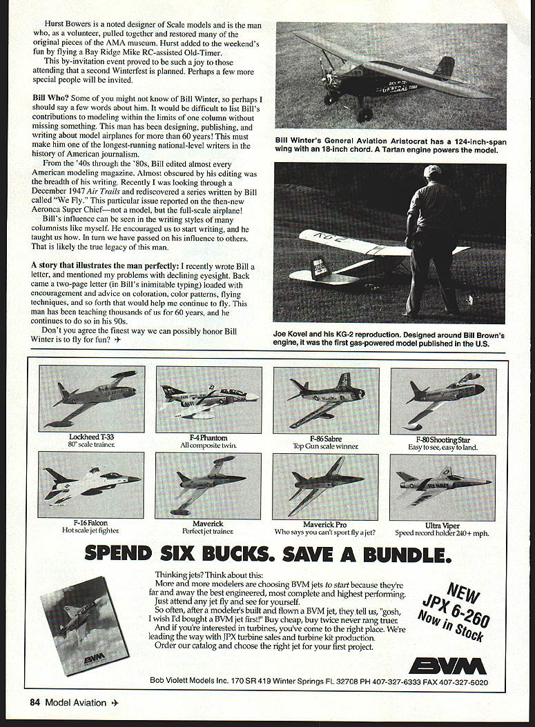 U DB Mathews ilyz7Liiy AXP 5c&ziciu THE ALTERNATIVE Aging Unacceptable Likely youve heard sentiment before consider alternative see dont agree Unfortunately aging process both unstoppable inevitable reality adds importance urgency activities such am about relate broader scale Celebration Eagles will beheld AMA headquarters July 6-7 1996 Have ever considered untimely eulogies Much preferred expression respect admiration delivered person still able appreciate As someone once said Honor living respect dead us feel need honor modelers weve admired have influenced years Honor funny sort word calls up visions someone having medal pinned chest being kissed both cheeks honored standing platform national anthem played cannons fired etc other hand perhaps more-fitting honor pioneers leaders modeling hobby would firm handshake sincere Thank fun youve provided us read word written nationally prominent modelers 20s 30s 40s studied latest model designs hours used equipment techniques developed accorded same star status usually reserved sport movie personalities period strong need honor own wayand soon alternative inevitably approaching us reason responsible AMA Celebration Eagles have done truly great service hobby second too soon Far too great ones have already left being adequately thanked Winterfest 95 John Hunton designed beautiful building formerly housed AMAs headquarters Reston Virginia lifetime modeler Bill Winter have codesigning models last few years Several models have appeared pages magazine Huntons have purchased farm about hours drive due west Washington DC farm became venue really special flying session nostalgic gathering veteran modelers last October 7-8 As tribute Bill Winters 60 years designing building writing editing model airplane material small group special friends spent beautiful weekend reminiscing about past reflecting present speculating about future nearly ideal weather weekend apparently rather typical Virginia Blue Ridge Mountains forming picturesque backdrop magical gathering Norm Rosenstock Phil Greenburg drove up Florida newer readers Norm true Ancient Modeler paraphrase excellent book traces modeling odyssey over 50 years Phil Greenberg RC editor Flying Models 50s gathered disseminated much-needed technical information times incredibly rapid technical progress Winter Greenberg seen other 41 years Don Srull Tom Schmitt DC area producers pioneering small electric power equipment VL line Don Srull considered dean contemporary Free flight Scale designers works appear major modeling magazine world RC Scale Electric power designs have also earned Don respect hobby Traveling New York Joe Kovel brought along reproduction KG-2 Kovel Charles Hampton Grant longtime editor Model Airplane News developed design around Bill Browns engine published construction article April 1935 MAN making first published gas-powered Free flight model US Kovel entered won rubber-power event 1934 Nationals Bill Winter timers During ensuing 62 years things modeling have changed friendship has remained John Worth longtime Executive Director AMA brought reproduction unusual its time revolutionary pusher Cement Mixer originally published July 1948 Air Trails simply boggled us John has flying reproduction gatherings Vintage Radio Control Society 4326 Andes Dr Fairfax VA 22030 year described reliable gentle smooth performer September 1996 83 Winterfest 95 L-R front John Worth Joe Kovel Hurst Bowers Bill Winter L-R rear Phil Greenberg Tom Schmitt Don Srull Norm Rosenstock John Hunton Hurst Bowers noted designer Scale models man volunteer pulled together restored original pieces AMA museum Hurst added weekends fun flying Bay Ridge Mike RC-assisted Old-Timer by-invitation event proved such joy attending second Winterfest planned Perhaps few special people will invited Bill Some might know Bill Winter perhaps should say few words about him would difficult list Bills contributions modeling within limits column missing something man has designing publishing writing about model airplanes 60 years must make him longest-running national-level writers history American journalism 40s through 80s Bill edited almost American modeling magazine Almost obscured editing breadth writing Recently looking through December 1947 Air Trails rediscovered series written Bill called Fly particular issue reported then-new Aeronca Super Chiefnot model full-scale airplane Bills influence can seen writing styles columnists like myself encouraged us start writing taught us turn have passed influence others likely true legacy man story illustrates man perfectly recently wrote Bill letter mentioned problems declining eyesight Back came two-page letter Bills inimitable typing loaded encouragement advice coloration color patterns flying techniques forth would help continue fly man has teaching thousands us 60 years continues 90s Dont agree finest way can possibly honor Bill Winter fly fun 4viper Speed recoin nolder 2At1 mph SPEND SIX BUCKS SAVE BUNDLE Thinking jets Think about modelers choosing BVM jets start because theyre far away best engineered complete highest performing Idi Just attend jet fly see yourself So often after modelers built flown BVM jet theytell us gosh wish d bought BVM jet first Buy cheap buy twice never rang truer youre interested turbines youve come right place leading way JPX turbine sales turbine kit production K Order catalog choose right jet first project VM Bob Violett Models Inc 170 SR 419 Winter Springs FL 32708 PH 407-327-6333 FAX 407-327-5020 84 Model Aviation Winters General Aviation Aristocrat has 124-inch-span wing 18-inch chord Tartan engine powers model Joe Kovel KG-2 reproduction Designed around Bill Browns engine first gas-powered model published US trainer F-SO Shuuunuir Easy see easy land