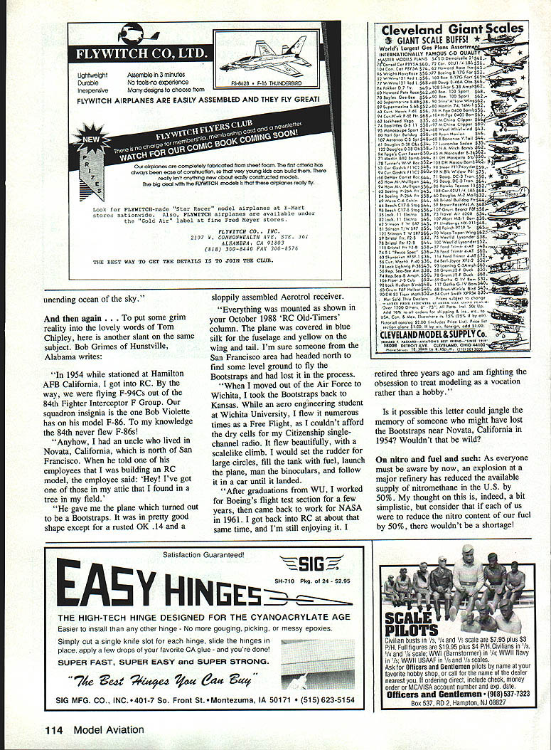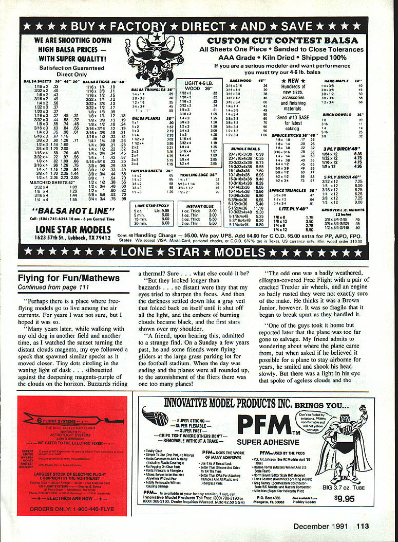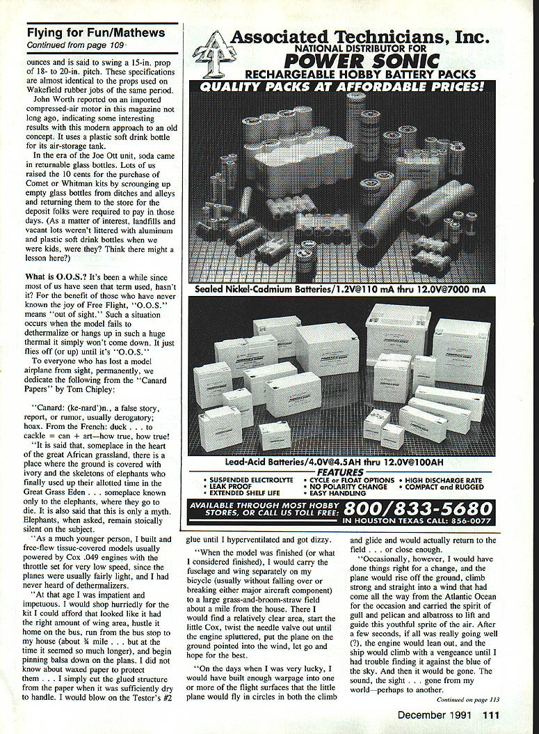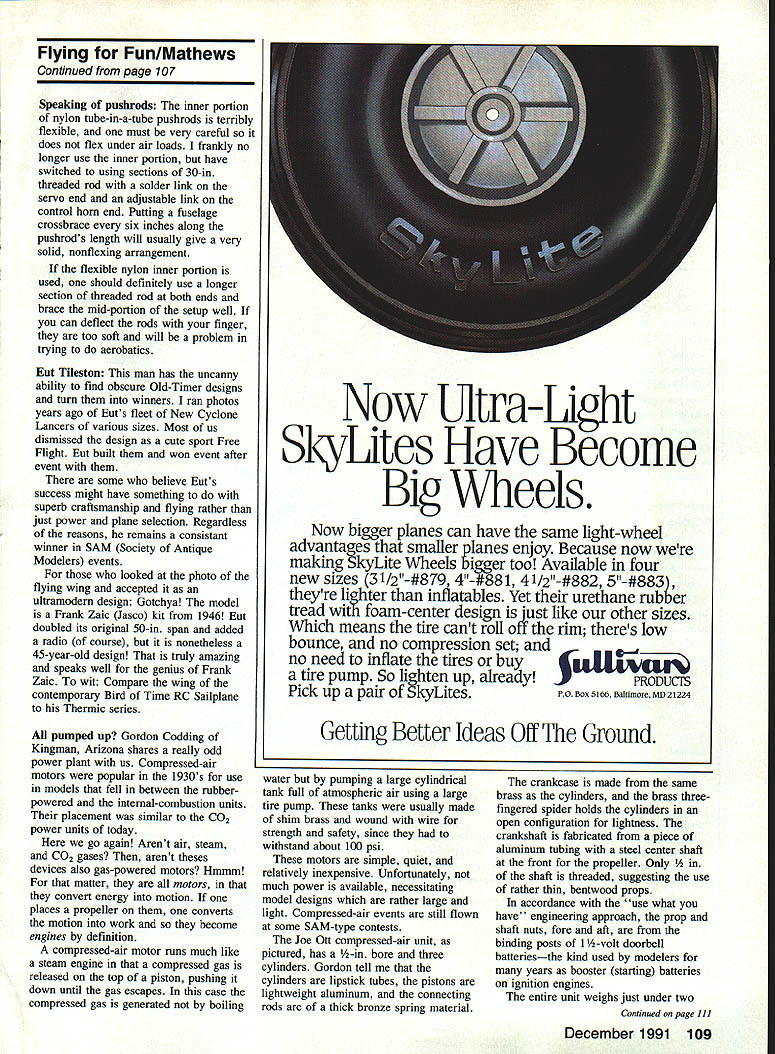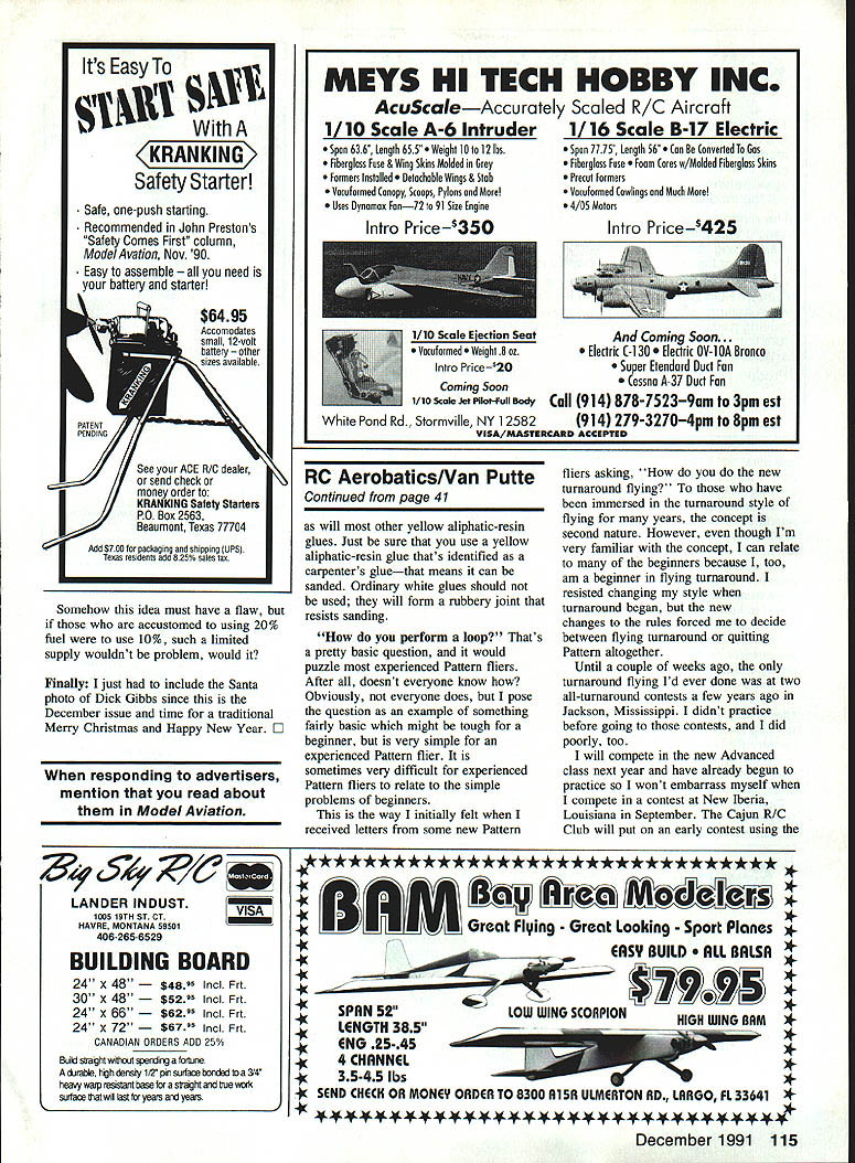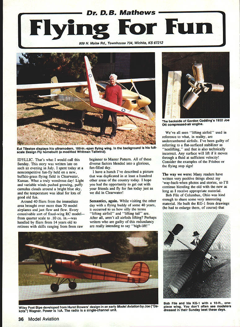 IDYLLIC Thats what would call Sunday story written late such evening July spent today noncompetitive fun-fly held new buffalo-grass flying field Clearwater Kansas What truly wondrous day Light variable winds pushed growing puffy cumulus clouds around bright blue sky temperature ideal lots good old fun Around 40 fliers immediate area brought over 70 model airplanes just flew flew conceivable sort fixed-wing RC model quarter scale 10 cu inwas handled fliers 14 years old retirees skills ranging from raw beginner Master Pattern diverse factors blended glorious fun-filled day have hunch Ive described picture duplicated least hundred other areas country today hope opportunity get out friends fly fun today just did Clearwater Semantics again visiting other day flying buddy some 40 years occurred us silly terms lifting airfoil lifting tail After arent airfoils lifting Perhaps writers guilty redundancy really intending say high-lift Weve seen lifting airfoil used reference what reality undercambered airfoils Ive guilty referring flat-surfaced stabilizer nonlifting also technically incorrect Any surface will lift moves through fluid sufficient velocity Consider examples Frisbee flying stop sign way readers have written very positive things about way-back-when photos stories Ill continue blending old new long receive appropriate material Bob File Columbus Ohio kind enough share some very interesting material built KG-i drawings enlarge course 36 Model Aviation Dr DB Mathews Flying Fun 909 N Maize Rd Townhouse 734 Wichita KS 67212 Eut Tileston displays ultramodern 100-in-span flying wing background lullscale Design Fly homebuilt modified Whitman Taliwind wiiey rosi wipe aevewpu rum kota Wagner Power radii b File KG-i 10-ft onepiece wing dont often see modelers dressed Sunday best days appeared Model Airplane News April 1935 As readers aware collaboration between Joe Kovel Charles H Grant editor MAN KG-l first gasengine design published Files version built primarily hardwood strip balsa sheet covered silk nitrate dope purchased local airport original power model Baby Cyclone 35 cu Since KG-l weighed seven pounds Baby Cyke could get model altitude about 200 ft after hand launch Picture handlaunching underpowered 10-footer Baby Cyclone subsequently replaced larger powerful Brown Junior combination carried 1936 Detroit Nationals crate cars rumble seat shown photo However Bob Files first Nationals File set national record Towline Gliders 1934 Akron Ohio Nationals design published MAN February 1935 accompanying article tied Goodyear dirigible hanger story Quoting story 51055iIT DWMa ij Bit atiiiI~ u.003 ati LSUS B III OiUIAOCiiS CAg5 Top VIW 0 LA f 5 4 Li sat. ~L 00 m o ci. tttS 0fl i CaliCiatNj TAnNIN tQ SIDE VIEW -0 ci- 055 4LAoI Ecu g. WORLDS RECORD OLIDOR OffIClat uSES U Cm IS SEC/NA iii sNO.0 JUNE INtESA PSEESEIC O PLOfl Y iOE PILE COtS 0 SCALE CINi Bob Files record-holding towline glider Universal Model Airplane News February 1935 noticed rising air currents around windward side Zep Dock model towed up altitude about 80 ft released soon over top dock climbed altitude about 500 ft took off cross-country far edge airport Thereafter soon disappeared clouds couple interesting points obvious encounter ridge lift off huge hangar dock fact back timer could follow model hot pursuit Since Files Glider relatively small 36-in wingspan obvious could have kept sight otherwise since its flight timed 23 minutes 13 seconds cant help being impressed incredible size Goodyear blimp dock photo company buildings Akron Ohio Navy dirigible docks Lakehurst New Jersey San Diego California elsewhere large rain clouds would drift through open doors rain would fall inside put size perspective dirigibles building built house Continued page 107 December 1991 37 Heres recent photo Bob Files 1935 Baby Cyclone KG-i still has See does fly Last February think Ever wonder what Santa Claus does during off season Actually its Dick Gibbs York Pennsylvania Kioud King Model Aviation Dick writes Electric Flight column Flying Models Left huge buildingthe oid Goodyear Zep Dock Compare sizes cars first floor windows tor perspective Rain clouds re ported have formed rafters photo right see Bob File L Fred Gesling way 1936 Detroit Nationals 10-ft wing Files KG-i box top car fuselage hanging out trunk 1931 Model Ford coupe Metric Remember USA its way becoming metric country step rest world What happened anyway Paris must able understand meters kmph jet engines produce thrust measured kN Sometimes English equivalent can found usually its up either translate think metric Converting can tedious youre about buy gas costs 529 French francs per liter want know thats bargain isnt way since works out around $340 gallon Ugh Spottersand other airplane nuts During week Paris Air Show supposedly restricted industry people press So come place full guys notebooks binoculars Somehow dedicated European enthusiast has figured out get through gate days crowds low airplanes seen photographed hobbyist will find way After seven decades running Paris Air Show French know flair much efficiency can expected such huge event Most things go off schedule although some gates dont open theyre supposed displays thoroughly professional long-prepared announcements sales made schedule show didnt work well wouldnt continue grow next editionnumber 40is planned June 10-20 1993 same venue International political economic developments will partly determine whats display As always however show will big bright loaded very latest aerospace world including some designs have never shown beforeD Flying Fun/Mathews Continued page 37 times larger blimps flown over football games today Good grief Can believe happened 57 years ago examining construction article Files Towline Glider astonished discover stab mounted inverted curved portion airfoil bottom Folks OldTimer designs will quickly grasp significance inversion Most us have thought inverting stab peculiar Sal Taibi Pacer 1940 didnt notice 