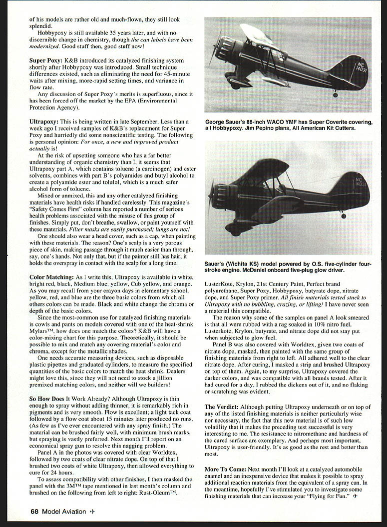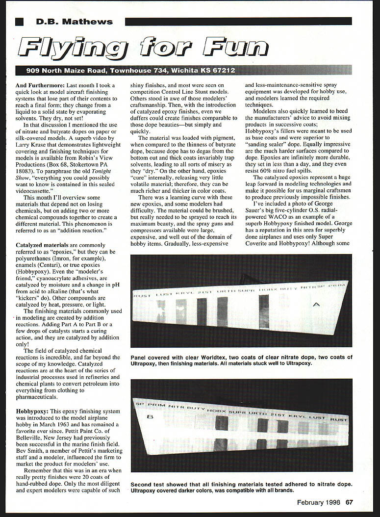 DB Mathews Furthermore Last month took quick look model aircraft finishing systems lose part contents reach final form change liquid solid state evaporating solvents dry set discussion mentioned use nitrate butyrate dopes paper silk-covered models superb video Larry Kruse demonstrates lightweight covering finishing techniques models available Robins View Productions Box 68 Stokertown PA 18083 paraphrase old Tonight Show everything could possibly want know contained sealed videocassette month Ill overview some materials depend losing chemicals adding two chemical compounds together create different material phenomenon referred addition reaction Catalyzed materials commonly referred epoxies can polyurethanes Imron example enamels Centari true epoxies Hobbypoxy modelers friend cyanoacrylate adhesives catalyzed moisture change pH acid alkaline thats what kickers Other compounds catalyzed heat pressure light finishing materials commonly used modeling created addition reactions Adding Part Part B few drops catalysts starts curing action catalyzed addition field catalyzed chemical reactions incredible far beyond scope knowledge Catalyzed reactions heart series industrial processes used refineries chemical plants convert petroleum everything clothing pharmaceuticals Hobbypoxy This epoxy finishing system introduced model airplane hobby March 1963 has remained favorite ever since Pettit Paint Co Belleville New Jersey previously successful marine finish field Bev Smith member Pettit s marketing staff modeler influenced firm market product modelers use Remember era really pretty finishes 20 coats hand-rubbed dope Only diligent expert modelers capable such shiny finishes seen competition Control Line Stunt models Others stood awe modelers craftsmanship introduction catalyzed epoxy finishes duffers could create finishes comparable dope beautiesbut simply quickly material loaded pigment compared thinness butyrate dope because dope has degas bottom out thick coats invariably trap solvents leading sorts misery dry other hand epoxies cure internally releasing very little volatile material therefore can much richer thicker color coats learning curve new epoxies some modelers difficulty material could brushed really needed sprayed reach its maximum beauty spray guns compressors available large expensive well out domain hobby items Gradually less-expensive less-maintenance-sensitive spray equipment developed hobby use modelers learued required techniques Modelers also quickly learned heed manufacturers advice avoid mixing products successive coats Hobbypoxys fillers meant used base coats superior sanding sealer dope Equally impressive much harder surfaces compared dope Epoxies infinitely durable set less day resist 60% nitro fuel spills catalyzed epoxies represent huge leap forward modeling technologies make possible us marginal craftsmen produce previously impossible finishes Ive included photo George Sauers big five-cylinder OS radialpowered WACO example superb Hobbypoxy finished model George has reputation area superbly done airplanes uses Super Coverite Hobbypoxy Although some February 1998 67 Panel covered clear Worldtex two coats clear nitrate dope two coats Ultrapoxy finishing materials materials stuck well Ultrapoxy Second test showed finishing materials tested adhered nitrate dope Ultrapoxy covered darker colors compatible brands models rather old much-flown still look splendid Hobbypoxy still available 35 years later no discernible change chemistry though can labels have modernized Good stuff good stuff now Super Poxy K&B introduced its catalyzed finishing system shortly after Hobbypoxy introduced Small technique differences existed such eliminating need 45-minute waits after mixing more-rapid setting times variance flow rate Any discussion Super Poxys merits superfluous since has forced off market EPA Environmental Protection Agency Ultrapoxy being written late September Less week ago received samples K&B s replacement Super Poxy hurriedly did some nonscientific testing following personal opinion once new improved product actually risk upsetting someone has far better understanding organic chemistry seems Ultrapoxy part contains toluene carcinogen ester solvents combines part Bs polyamides butyl alcohol create polyamide ester tolulol much safer alcohol form toluene Mixed unmixed other catalyzed finishing materials have health risks handled carelessly magazines Safety Comes First column has reported number serious health problems associated misuse group finishes Simply put dont breathe swallow paint yourself materials Filter masks easily purchased lungs should also wear head cover such cap painting materials reason Ones scalp very porous piece skin making passage through much easier through say ones hands painter still has hair holds overspray contact scalp long time Color Matching As write Ultrapoxy available white bright red black Medium blue yellow Cub yellow orange As may recall crayon days elementary school yellow red blue three basic colors others colors can made Black white change chroma depth basic colors Since most-common use catalyzed finishing materials cowls pants models covered heat-shrink MylarsTM does match colors K&B will have color-mixing chart purpose Theoretically should possible mix match covering materials color chroma except metallic shades needs accurate measuring devices such disposable plastic pipettes graduated cylinders measure specified quantities basic colors match heat shrink Dealers might love since will need stock ajillion premixed matching colors neither will builders So Does Work Already Although Ultrapoxy thin enough spray adding thinner remarkably rich pigments very smooth Flow excellent light tack coat followed flow coat about 15 minutes later produced no runs As few Ive ever encountered spray finish material can brushed fairly well minimum brush marks spraying vastly preferred Next month Ill report economical spray gun resolve nagging problem Panel photos cover