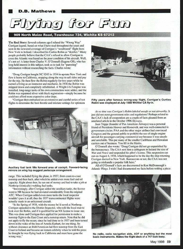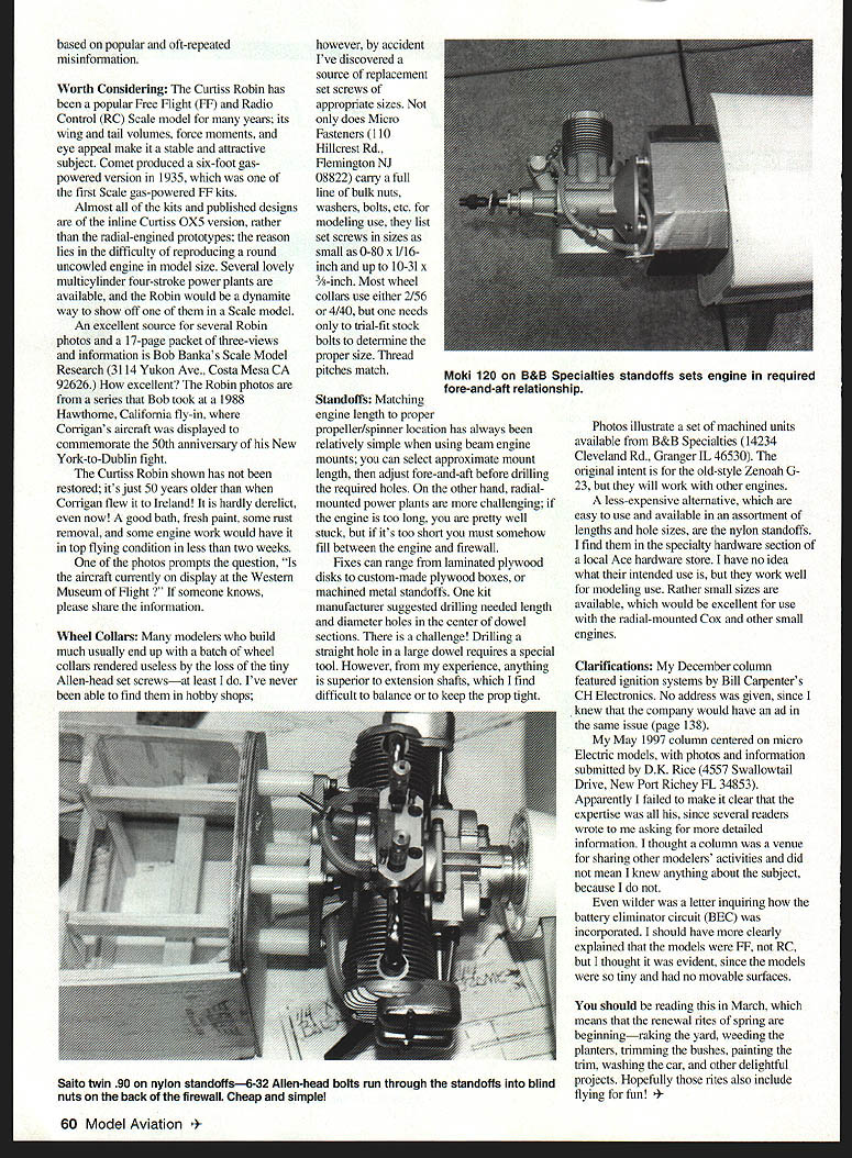 DB Mathews UyUuj 2K2z7czi&iii e Story Several columns ago related Wrong Way Corrigan legend based what have read throughout years seen newsreel coverage Corrigans westbound flight New York Ireland described Curtiss Robin derelict people probably believe CAAs refusal allow Corrigan cross Atlantic based poor condition aircraft Well its letter Charles V ODonnell Eugene OR has long held interest subject took us task parroting information researching facts Charles wrote Doug Corrigan bought NC 9243 1934 upstate New York flew home California stopping along way sell rides pay trip flew Robin regularly two years earned living instructor mechanic 1936 Robin stripped down completely refurbished Wright J-6-5 engine installed long-range tanks own construction added Robin repainted silver black registrationsimply because could afford expensive color dope Corrigan embarked extensive careful series test flights determine best throttle mixture settings optimum no time Corrigan s Robin labeled unsafe airworthy just did meet government rules regulations Perhaps related CAA s lack cooperation couple facts gleaned unrelated article October 1996 Skyways Juan Trippe founder Pan American Airways personal friend Presidents Hoover Roosevelt well-connected government circles PAA other major airlines convinced Congress general public prohibit use single-engine aircraft passenger-canying commercial use because unsafe unreliable put smaller Caribbean Hawaiian carriers out business fill blanks ODonnell also wrote Doug Corrigan did go unpunished bureaucracy CAA sent him cablegram Ireland size War Peace suspended pilots license suspension ran out August 4 1938 happened day ship returning Corrigan docked New York Bureaucrats CAA going mishandle popular folk hero ODonnells facts documented Ken McDonnoughs Atlantic Wings wish documented facts before writing piece range included flying plane 1937 coast-to-coast nonstop back after added fuel oil capacity Right about ran out money take job Northrop ironically welding fuel tanks Interestingly after Corrigan added auxiliary tanks license went NR because deviated considerably original ATC Corrigan added tanks local inspector wouldnt pass thus 1937 transcontinental flights actually made unlicensed aircraft Spring 1938 money hed saved Northrop Corrigan appealed District Inspector told local man look over Robin qualified NX license issue done Corrigan applied permission make nonstop flight East Coast nonstop return Note did apply fly ocean since done 1937 turned down wake loss Amelia Earhart thing So clearance Irish/American lad flew nonstop East Coast Ireland became instant celebrity told press thought flying back California must have gone wrong way May1998 59 Fifty years after famous wrong-way flight Corrigans Curtiss Robin displayed July 1988 Whittier CA fly-in Auxiliary fuel tank fills forward area cockpit Forward-facing mirrors wing top suggest periscope arrangement No radio radio navigation aids ADF anything basic instruments Makes flight deck 747 look busy based popular oft-repeated misinfonnation Worth Considering Curtiss Robin has popular Free Flight FF Radio Control RC Scale model years its wing tail volumes force moments eye appeal make stable attractive subject Comet produced six-foot gaspowered version 1935 first Scale gas-powered EF kits Almost kits published designs inline Curtiss 0X5 version rather radial-engined prototypes reason lies difficulty reproducing round uncowled engine model size Several lovely multicylinder four-stroke power plants available Robin would dynamite way show off Scale model An excellent source several Robin photos 17-page packet three-views information Bob Bankas Scale Model Research 3114 Yukon Ave Costa Mesa CA 92626 excellent Robin photos series Bob took 1988 Hawthorne California fly-in Corrigans aircraft displayed commemorate 50th anniversary New York-to-Dublin fight Curtiss Robin shown has restored its just 50 years older Corrigan flew Ireland hardly derelict now good bath fresh paint some rust removal some engine work would have top flying condition less two weeks photos prompts question aircraft currently display Western Museum Flight one knows please share information Wheel Collars modelers build much usually end up batch wheel collars rendered useless loss tiny Allen-head set screwsat least Ive never able find hobby shops however accident Ive discovered source replacement set screws appropriate sizes does Micro Fasteners 110 Hillcrest Rd Flemington NJ 08822 carry full line bulk nuts washers bolts etc modeling use list set screws sizes small 0-80 x 1/16inch up 10-31 x 3/s-inch Most wheel collars use either 2/56 4/40 needs trial-fit stock bolts determine proper size Thread pitches match Standoffs Matching engine length proper propeller/spinner location has always relatively simple using beam engine mounts can select approximate mount length adjust fore-and-aft before drilling required holes other hand radialmounted power plants challenging engine too long pretty well stuck its too short must somehow fill between engine firewall Fixes can range laminated plywood disks custom-made plywood boxes machined metal standoffs kit manufacturer suggested drilling needed length diameter holes center dowel sections challenge Drilling straight hole large dowel requires special tool However experience anything superior extension shafts find difficult balance keep prop tight Photos illustrate set machined units available B&B Specialties 14234 Cleveland Rd Granger IL 46530 original intent old-style Zenoah C23 will work other engines less-expensive alternative easy use available assortment lengths hole sizes nylon standoffs find specialty hardware section local Ace hardware store have no idea what intended use work well modeling use Rather small sizes available would excellent use radial-mounted Cox other small engines Clarifications December column featured ignition systems Bill Carpenters CH Electronics No address given since knew company would have 