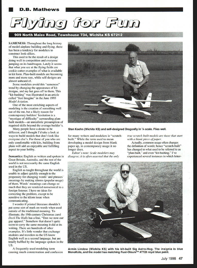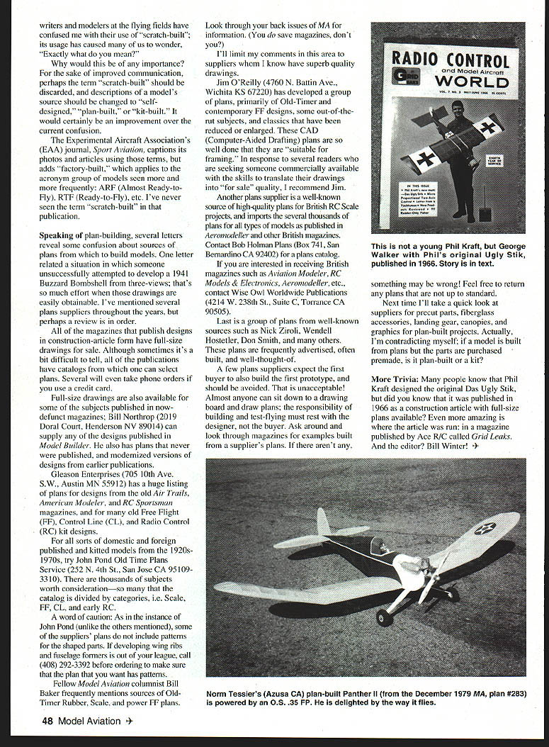 DB Mathews UL1i7 o SAMENESS Throughout long history model airplane building flying has tendency modelers construct look-alikes used result design doing well competition everyone jumping its bandwagon Lately seems what see flying fields cookie-cutter examples what available kit form Plan-built models becoming more rare self-designs almost unheard Some modelers avoid sameness trend changing appearance kit designs hat goes off kit-bashing illustrated article called Just Imagine June 1993 Model Aviation enriching aspects modeling creation something well out rut likely reason contemporary builders hesitation mystique difficulty surrounding planbuilt modelsan unrealistic presumption required skills beyond average builders people have desire different thought Id take look ways build models dont look like everyone elses comfortable kits building plans will add enjoyable fulfilling aspect hobby Semantics English written spoken Great Britain Australia rest world necessarily same English used US English taught throughout world unable adjust quickly enough propensity changing words phrases meanings making idioms popular usage Words meanings can change much rendered nonsensical foreign listener have no ideas correcting problem except sensitive idiom issue communicating wonder printed literature shouldnt put some sort mark words used outside traditional meaning illustrate 19th century Christmas carol Deck Halls has line Don now gay apparel Somehow doesnt quite seem carry same meaning did its writing hundreds other examples Its little wonder exchange students travelers US know English well second language totally baffled language spoken US frequently used modeling term causing much consternation confusion writers modelers scratch built term used mean developing model design blank paper up contemporary usage no longer does Editors note Scale modelers may disagree often asserted true scratch-built models start blank piece paper Actually common usage often changes definition words hence scratch-built has changed what used referred plan-built kit-bashing Ive experienced several instances letterJuly1998 47 Stan Koehn Wichita KS self-designed Dragonfly e Flies well Armin Lindow Wichita KS kit-built Sig Astro-Hog insignia blue MonoKate model has matching RustOleumTM #7723 royal blue paint writers modelers flying fields have confused use scratch-built its usage has caused us wonder Exactly what mean would importance sake improved communication perhaps term scratch-built should discarded descriptions models source should changed self designed plan-built kit-built would certainly improvement over current confusion Experimental Aircraft Associations EAA journal Sport Aviation captions its photos articles using terms adds factory-built applies acronym group models seen more frequently ARF Almost Ready-to Fly RTF Ready-to-Fly etc Ive never seen term scratch-built publication Speaking plan-building several letters reveal some confusion about sources plans build models letter related situation someone unsuccessfully attempted develop 1941 Buzzard Bombshell three-views thats much effort drawings easily obtainable Ive mentioned several plans suppliers throughout years perhaps review order magazines publish designs construction-article form have full-size drawings sale Although sometimes its bit difficult tell publications have catalogs can select plans Several will take phone orders use credit card Full-size drawings also available some subjects published nowdefunct magazines Bill Northrop 2019 Doral Court Henderson NV 89014 can supply designs published Model Builder also has plans never published modernized versions designs earlier publications Gleason Enterprises 705 10th Ave SW Austin MN 55912 has huge listing plans designs old Air Trails American Modeler RC Sportsman magazines old Free Flight FF Control Line CL Radio Control RC kit designs sorts domestic foreign published kitted models 1920s1970s try John Pond Old Time Plans Service 252 N 4th St San Jose CA 95 1093310 thousands subjects worth considerationso catalog divided categories ie Scale FF CL early RC word caution As instance John Pond unlike others mentioned some suppliers plans include pattems shaped parts developing wing ribs fuselage formers out league call 408 292-3392 before ordering make sure plan want has patterns Fellow Model Aviation columnist Bill Baker frequently mentions sources Old Timer Rubber Scale power FF plans Look through back issues MA information save magazines dont Ill limit comments area suppliers know have superb quality drawings Jim OReilly 4760 N Battin Ave Wichita KS 67220 has developed group plans primarily Old-Timer contemporary FF designs some out-of-therut subjects classics have reduced enlarged CAD Computer-Aided Drafting plans well done suitable framing response several readers seeking someone commercially available skills translate drawings sale quality recommend Jim Another plans supplier well-known source high-quality plans British RC Scale projects imports several thousands plans types models published Aeromodeller other British magazines Contact Bob Holman Plans Box 741 San Bernardino CA 92402 plans catalog interested receiving British magazines such Aviation Modeler RC Models & Electronics Aeromodeller etc contact Wise Owl Worldwide Publications 4214W 238th St Suite C Torrance CA 90505 Last group plans well-known sources such Nick Ziroli Wendell Hostetler Don Smith others plans frequently advertised often built well-thought-of few plans suppliers expect first buyer also build first prototype should avoided unacceptable Almost anyone can sit down drawing board draw plans responsibility building test-flying must rest designer buyer Ask around look through magazines examples built suppliers plans arent something may wrong Feel free return plans up standard Next time Ill take quick look suppliers precut parts fiberglass accessories landing gear canopies graphics plan-built projects Actually Im contradicting myself model bu