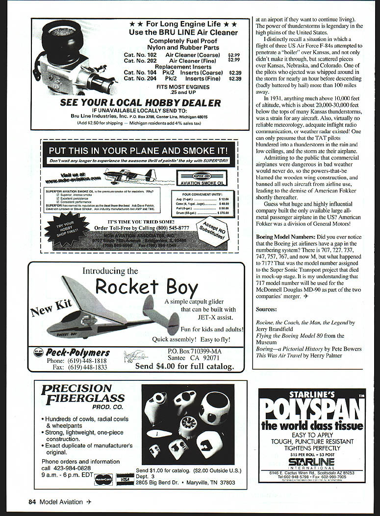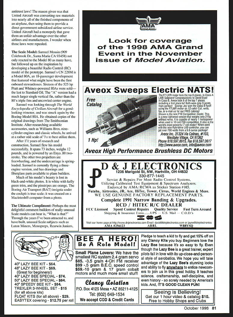 DB Mathews £U77L17 25 tziuiii Splendid Subject last several columns Ive banging drum promoting unusual modeling subjects month have rare yet extremely appealing aircraft Boeing Model 80 people familiar extent another Ford Junkers trimotors lesser extent American Fokker units Did know preceded trimotor commercial aircraft Boeing Stinson Armstrong Whitworths Argosy now ugly airplane de Havillands Hercules several other domestic foreign manufacturers three engines Id suspect answer lies what available reliable power plants time aircraft designed Aircraft designs have dictated power plant development since Wright brothers vivid example unsuccessful Dornier DoX flying boat conceived revolutionary size capable canying 100 passengers across Atlantic However obtain sufficient power fly no less 12 engines powerful design available 500 horsepower Damier Benz needed larger engines available poor thing probably wouldnt have handicapped weight drag 12 engines nacelles propellers Following line logic wouldnt suspect two engines 700 800 hp available Boeing engineers Model 80 would have designed twinengined rather three-engined airplane glance through aviation history reveals excellent aircraft failures because engine builders unable perfect new engines P-70 series fighters powered unsuccessful power plants such horizontal 12-cylinder X-shaped liquid cooled units seem saying first engine airplane youve ever visited magnificent Seattle Museum Eight might have seen Model 80 centerpiece displays very impressed appeal Model 80 modeling subject wondered Id never seen flying model aircraft Seattle 1928 Model 80 12-passenger version three 425 hp Wasp engines NC 224M entered service May 1930 Boeing Air Transport System Boeing Stearman Northrop United Airlines Pratt Whimey Hamilton Standard several other firms merged United Aircraft early 1930s until US Justice Department broke up under October1998 79 Samuel Mossins Santa Maria CA model Boeing Model 80A spans 73 inches weighs 12 pounds powered Enya 80 antitrust laws reason given United Aircraft converting raw materials nearly finished components airplane using provide direct government subsidized airline service United Aircraft monopoly gave unfair advantage over other airlines manufacturers wonder laws repealed Scale Model Samuel Mossin 909 Colebrook Dr Santa Maria CA 93458 reacted Model 80 have followed up inspiration developing beautiful Radio Control RC model prototype Samuels CN 228M Model 80A 18-passenger development featured what might have first onboard stewardesses Sixteen 525 hp Pratt Whitney-powered 8OAs sold last Standard Oil version much larger single vertical fin rather 80s triple fins uncowled center engine Samuel looking through World Encyclopedia Civilian Aircroft goodlooking trimotor struck again Boeing Model 80A obtained copies original drawings Smithsonian Institute After researching available accessories such Williams Bros ninecylinder engines classic wheels arrived rather odd scale I13 best utilize After 1 years research construction Samuel flew model successfully spans 73 inches weighs 12 pounds powered Enya 80 twostroke other two propellers freewheeling undercarriage springloaded Samuel currently flying threeengine version has drawings fiberglass parts available plans builders Much models beauty lost black-and-white photos white kelly green trim pinstripes orange Boeing Air Transport BAT insignia under cockpit true scale created Macintosh computer photo Ultimate Compliment Perhaps delightful comment builders really unusual Scale models can hear What Through years Ive attracted have built unusual Scale subjects such Luton Minors Monopreps Rearwin Juniors 0 BEE HEROf 1* Role Modoll 40 LAZY BEE KIT $64 48 LAZY BEE KIT $69 Great beginners 40 LAZY BEE SPECIAL $74 50 LAZY BEE SPECIAL $84 40 SPEEDY BEE KIT $84 TREXLER 3-WHEEL SET $15 above kits FLOAT KITS above $29 EASYTEX covering $1275 per roll Small Plane Lovers have smallest RC system 24 gram servo $85 -35 gram 4-OH FM receiver $99 -5 gram BEC speed control $59-10 gram & 17 gram cobalt motors much small stuff eew~ aa1 RO Box 4125 Mesa 521 1-4125 Tel 602 649-1534 accept COD & Credit Cards Pledge teach kid fly get 15% off Clancy Kits buy Beginners love Lazy Bee because its easy fly though Lazy Bee great trainer expert pilots fall love its up-close-and-person al style aerobatics hope will take advantage Lazy Bees stunning looks ability fly anywbnm entice newcom ers join us great hobby teaches science craftsmanship self-discipline history sorely needed Americas kids ITS GOOD CLEAN FUN Seeing Believing Get 1 hour video & catalog $10 Free Hobby Shops Clubs October 1998 81 Aveox SweeDs Electric NATS F7 LMR moo took top 8 places C ass LMR Sa ace Cong atula ons o Day d F Free Class Aveox took 6 top 7 places including first p lace tiel Both 3 noints Catalogtrom pertectle Class ff George Joy won th using F7LMFt motor 12 celIsI Call write tax e-mail us tor FREE catalogl Shown new Fl 0 Competition model new lightened version weighs 21 5g wires capable nearly 1 horsepower used 10 cell F5B competition also worlds powertal 7 cell motorl used new Hybridrive L60 controller can get over 700 watts trom 96 ounce packagel Aveox Inc 31324 Via Colinas #103 Westake Village CA 91362 Phone 8185978915 Fax 8185970617 http//wwwaveoxcom fo@aveoxcom Aveox High Performance Brushless DC Motors D & J ELECTRONICS Marigold St NW Hartville OH 44632 1236330-877-1445 hi ice & Repairs Most Radio Control Systems Utilizing Calibrated Test Equipment & Spectrum Analyzers Endors.d AMA RCMA Sticker Station #105 Futaba Airtronics JR Ace 1-liTec Tower Cirrus World Engines & WE USE GENUINE FACTORY REPLACEMENT PARTS Complete 1991 Narrow Banding & Upgrades RCD / HITEC R/C DEALER FCC Licensed Speed Control Repairs Quality Service Fast Turn Around Shipping & Insurance ExirdUPSU S Mail CODs z m Visit home page http//wwwdnjelectromcscom Email david@dnielectronicscom jayne@dnjelectronics AMA #256t23ARRLWBSYSQ U l Aircraft Parts WORLDS LARGEST MAN