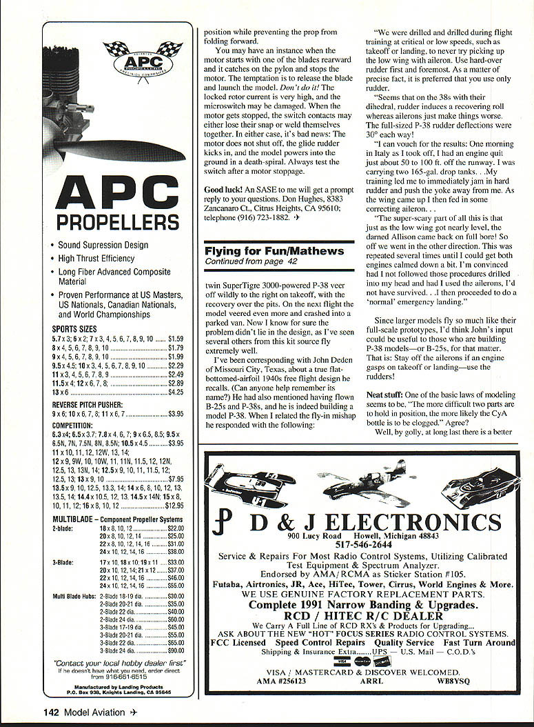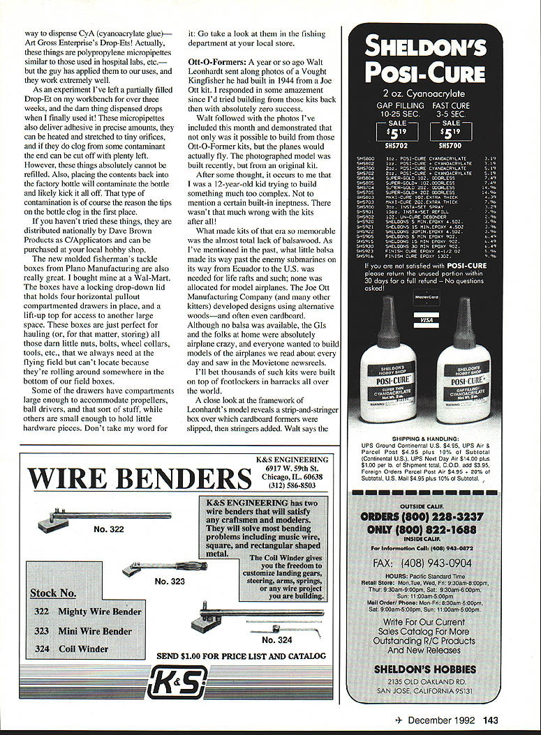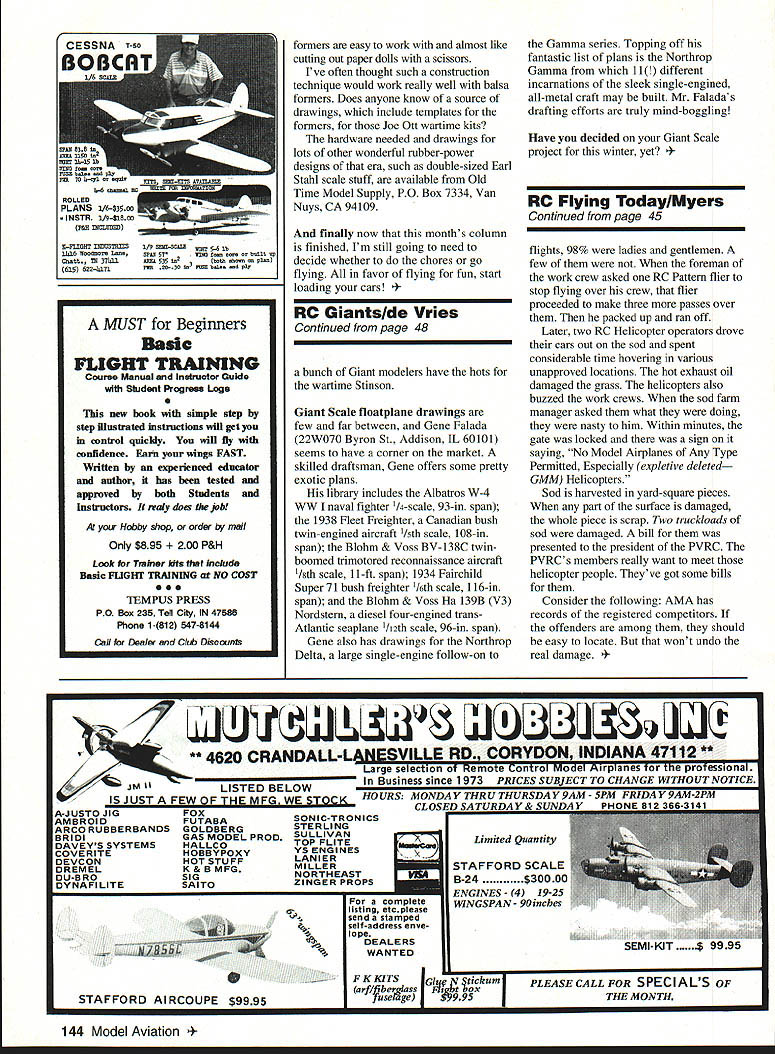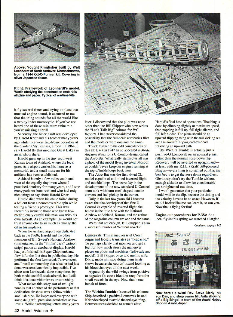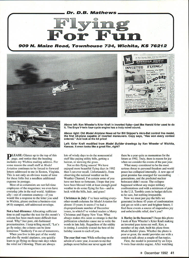 Dr DB Mathews Above right Old Model Airplane News ad Bill Skippers Akro-Bat control line model first kit-plane capable inverted maneuvers Copy says Has won contest entered look kit price Left Krier Kraft modified Model Builder drawings Ken Wheeler Wichita Kansas looks like great flier right p LEASE Glance up top page notice heading includes Wichita mailing address some reason small staff Model Aviation continues forced forward letters addressed Reston Virginia obvious waste time folks needless additional expense postage Most us columnists full-time employees magazines have everyday jobs real world Addition allyout common courtesyif would like response letter send Wichita please enclose business-size #10 stamped self-addressed envelope bad dilemma Allocating sufficient time pull together text months column has much difficult usual Just pure old-fashioned procrastination keep telling myself Lets go fly today column can done tomorrow Suddenly Im out tomorrows live part world also fly model airplanes quickly learn go flying rare days wind isnt blowing always lots windy days nonessential stuff like paying utility bills getting haircut mowing grass flying season have enjoyed beautiful flying days 1992 can ever recall Unfortunately observing national weather Weather Channel Im certain some have fortunate hope have blessed least enough good weather some flying funand heck bills hair grass Christmas July Ive writing everyother-month columns Model Aviation almost 15 years seems Ive disproportionate number December issues Ive wished readers Merry Christmas Happy New Year What always makes seem strange publication schedules cause write words late July Regardless oddity timing certainly extend best holiday season year reflecting advent new year occurs perhaps never before nor never again will year quite momentous future 1992 Truly reason joy consider events past year What considered serious threat personal freedom world peace has collapsed internally new age great promise has emerged succeeding generations predicted nuclear holocaust didnt occur collapse happened major military confrontations minimum pain US Terrible costs budget deficits sure nothing irreparable Now must just pay bills generated 45 years confrontation get new brighter future find events source stupendous joy unbelievable relief dont Harley heavens hope photo took Ken Wheelers Krier Kraft making inverted pass turns out well Ken member club built plane Model Builder plans Whether photo poor great model provides crutch talk about couple fun topics First model powered Enya V-twin four-stroke engine After watching mber 1992 41 G g 909 N Maize Road Townhouse 734 Wichita KS 76212 Above left Ken Wheelers Krier Kraft inverted flybyjust like Harold Krier used Enya V-twin four-cycle engine has truly novel sound Right Framework Leonhardts model Worth studying construction materials pine paper Typical wartime kits fly several times trying place unusual engine sound occurred thing sounds world like two-cylinder motorcycle youve heard miniature twins run youre missing thrill Secondly Krier Kraft developed Harold Krier brother years ago fixed-base operators Garden City Kansas airport 1964 saw Harold fly modified Great Lakes air show Harold grew up tiny southwest Kansas town Ashland local grass strip airport carries name memorial small museum artifacts has established Ashland few miles south west equally tiny town practiced dentistry years saw patients Ashland nice things say about Harold Krier Harold died chute failed during bailout nonrecoverable spin testing friends prototype incredibly ironic knew meticulously careful man own aircraft As example would trust anyone else much change oil airplanes Ashland airport dedicated back 1960s Harold other members Bill Sweets Nationai Airshow immortalized Smilin Jack cartoon strips put aerobatics display Harold just finished Super Chipmunk flew first time public day perfonned first Lomcevak Id ever seen recall commenting what just done aerodynamically impossible Ive since seen Lomeevaks done times both model full-scale aircraft still think done mirrors something What makes story sort twilight zone another performers dedication air show fellow smallish bipe impressed everyone some delightful precision aerobatics low levels exchanging letters years later discovered pilot other Bill Skipper now writes Lets Talk Big column RIC Reports never considered possibility full-scale aerobatics flier modeler same add further odd coincidences Back 1947 ad appeared Model Airplane News U-Control design called Akro-Bat What really stunned us photo model flying inverted Most us couldnt keep engines running top inside loops back Akro-Bat first kitted CL model capable unlimited inverted flight outside loops secret lay development now-standard U-Control stunt tank barn-roof-shaped outside corners fuel pickup center Only last few years did become aware developer first UControl kit capable inverted flight fellow little bipe National Airshow Ashland Kansas author magazine column same enough Bill Skipper also successful writer Western novels Lomcevak maneuver Czech origin loosely translates headache perhaps clarify moniker get feel much stress maneuver places pilots machines full-scale model Bill Skipper once told wife Dixie made him stop doing air shows because couldnt stand looking bloodshot eyes next week Apparently wild swings positive negative Gs cause blood seep small vessels eye Now thats bunch force Wichita Tumble columns Skip described positive Lomcevak Krier developed avoid red-eye thing Between us decided name after Harolds final base operations thing done climbing slightly maximum speed popping full up full right aileron full left rudder plane should upward flipping thing tail kicking out aircraft flipping end over end following upward path Wichita Tumble actually just positive-G Lomcevak upward plane rather normal nose-down flip Recovery will inverted upright least RJL Kraft 60-powered Bingoseverything stalled out best b