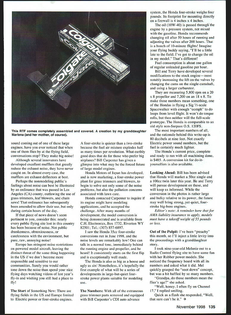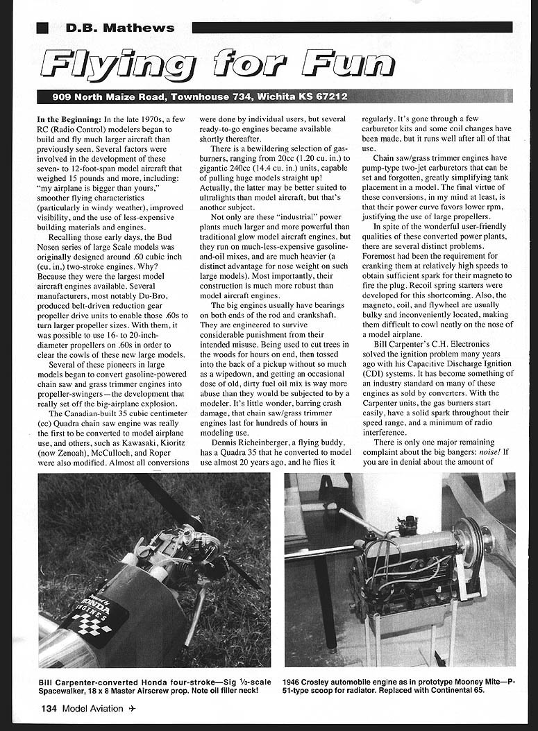 DB Mathews UyUuziy 2IC2~ Litciuzi 1 Ii Beginning late 1970s few RC Radio Control modelers began build fly much larger aircraft previously seen Several factors involved development seven- 12-foot-span model aircraft weighed 15 pounds including airplane bigger yours smoother flying characteristics particularly windy weather improved visibility use less-expensive building materials engines Recalling early days Bud Nosen series large Scale models originally designed around 60 cubic inch cu two-stroke engines Because largest model aircraft engines available Several manufacturers notably Du-Bro produced belt-driven reduction gear propeller drive units enable 60s turn larger propeller sizes possible use 16- 20-inchdiameter propellers 60s order clear cowls new large models Several pioneers large models began convert gasoline-powered chain saw grass trimmer engines propeller-swingers lopment really set off big-airplane explosion Canadian-built 35 cubic centimeter cc Quadra chain saw engine really first converted model airplane use others such Kawasaki Kioritz now Zenoah McCulloch Roper also modified Almost conversions done individual users several ready-to-go engines became available shortly thereafter bewildering selection gasburners ranging 20cc 120 cu gigantic 240cc 144 cu units capable pulling huge models straight up Actually latter may better suited ultralights model aircraft thats another subject industrial power plants much larger powerful traditional glow model aircraft engines run much-less-expensive gasolineand-oil mixes much heavier distinct advantage nose weight such large models Most importantly construction much robust model aircraft engines big engines usually have bearings both ends rod crankshaft engineered survive considerable punishment intended misuse Being used cut trees woods hours end tossed back pickup much wipedown getting occasional dose old dirty fuel oil mix way abuse would subjected modeler Its little wonder barring crash damage chain saw/grass trimmer engines last hundreds hours modeling use Dennis Richeinberger flying buddy has Quadra 35 converted model use almost 20 years ago flies regularly Its gone through few carburetor kits some coil changes have made runs well after use Chain saw/grass trimmer engines have pump-type two-jet carburetors can set forgotten greatly simplifying tank placement model final virtue conversions mind least power curve favors lower rpm justifying use large propellers spite wonderful user-friendly qualities converted power plants several distinct problems Foremost requirement cranking relatively high speeds obtain sufficient spark magneto fire plug Recoil spring starters developed shortcoming Also magneto coil flywheel usually bulky inconveniently located making difficult cowl neatly nose model airplane Bill Carpenters CH Electronics solved ignition problem years ago Capacitive Discharge Ignition CDI systems has become something industry standard engines sold converters Carpenter units gas burners start easily have solid spark throughout speed range minimum radio interference major remaining complaint about big bangers noise denial about amount 134 Model Aviation Carpenter-converted Honda four-strokeSig 1/3-scale 1946 Crosley automobile engine prototype Mooney MiteP Spacewalker 18 x 8 Master Airscrew prop Note oil filler neck 51-type scoop radiator Replaced Continental 65 sound coming out large engines have ever noticed flies flying field conversations stop make big noise Although several innovators have developed excellent mufflers greatly reduce exhaust noise have never caught almost case mufflers exhaust deflectors best Perhaps nonmodeling publics feelings about noise can best illustrated ordinance passed Los Angeles CA county outlawing use grass trimmers leaf blowers chain saws ordinance has subsequently amended allow use during certain hours day piece news doesnt seem pertinent consider nearly public flying site lost country has because noise public drunkenness obnoxiousness carelessness environment pure raw annoying noise Europe has stringent noise restrictions powered model aircraft leaving distinct threat same thing happening US dont become responsible sensitive communities Surely would rather tone down noise spend nice flying days watching videos last years fly-in wishing still place fly Start Something New flying fields US Europe limited Electric power four-stroke engines four-stroke quieter two-stroke because fuel air mixture explodes half times per revolution What earthly good does prefer big airplanes Bill Carpenter has given glimpse what may forced future large model engines Honda Motors Japan has developed now marketing four-stroke power plant grass trimmers blowers begin solve some noise problems also pollution concerns associated lawn care Honda contacted Carpenter inquire its engine might have modeling applications accepted challenge After months development model conversion being demonstrated available CH Electronics Box 1732 Riverton WY 82501 Tel 307 857-6897 saw Honda 35cc four-stroke conversions run June 1998 noise levels remarkably low can talk normal tone immediately behind running engine propeller heard consistently starts first flip exceptionally well made Honda also big house ugly sin Nonetheless its hopefully first example what will series developments large-but-quiet fourstroke power plants suitable modeling use Numbers extraneous grass trimmer parts removed equipped Bill Carpenters CDI auto advance system Honda four-stroke weighs four pounds Its footprint mounting directly firewall 4 inches x 4 inches oil lOW-40 passed through engine pressure system mixed gasoline Honda recommends changing oil after 50 hours running adjusting valves after 200 hours bunch 10-minute flights Imagine flying buddy saying Ill little late field Ive got change oil model Thats different Fuel consumption about gallon regular unleaded gasoline per hour Bill Terry have developed several modifications stock enginemost notably increasing li