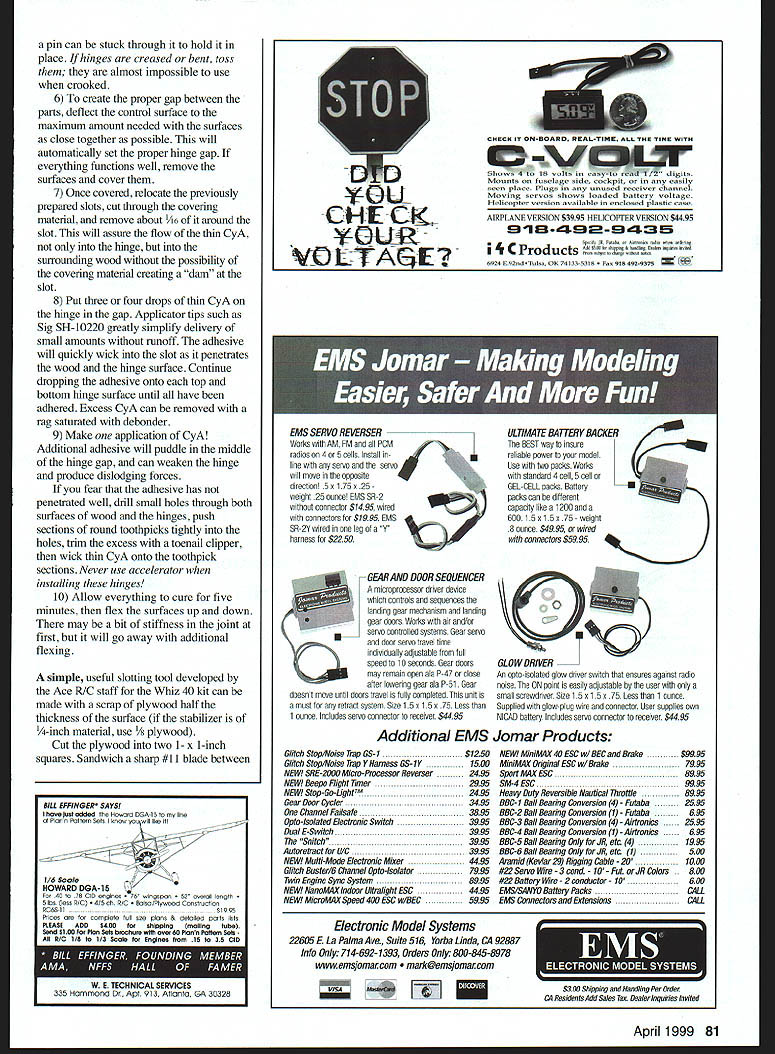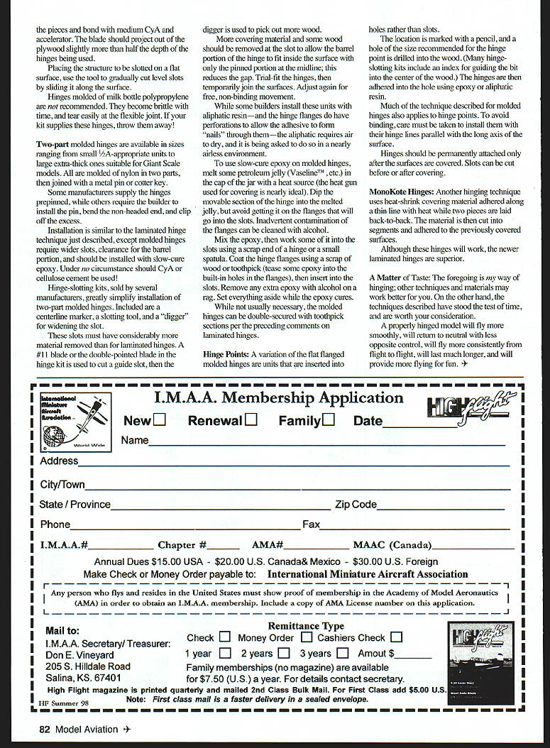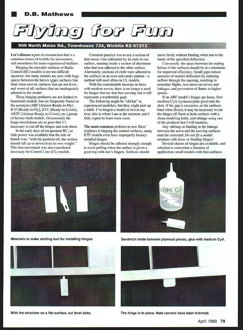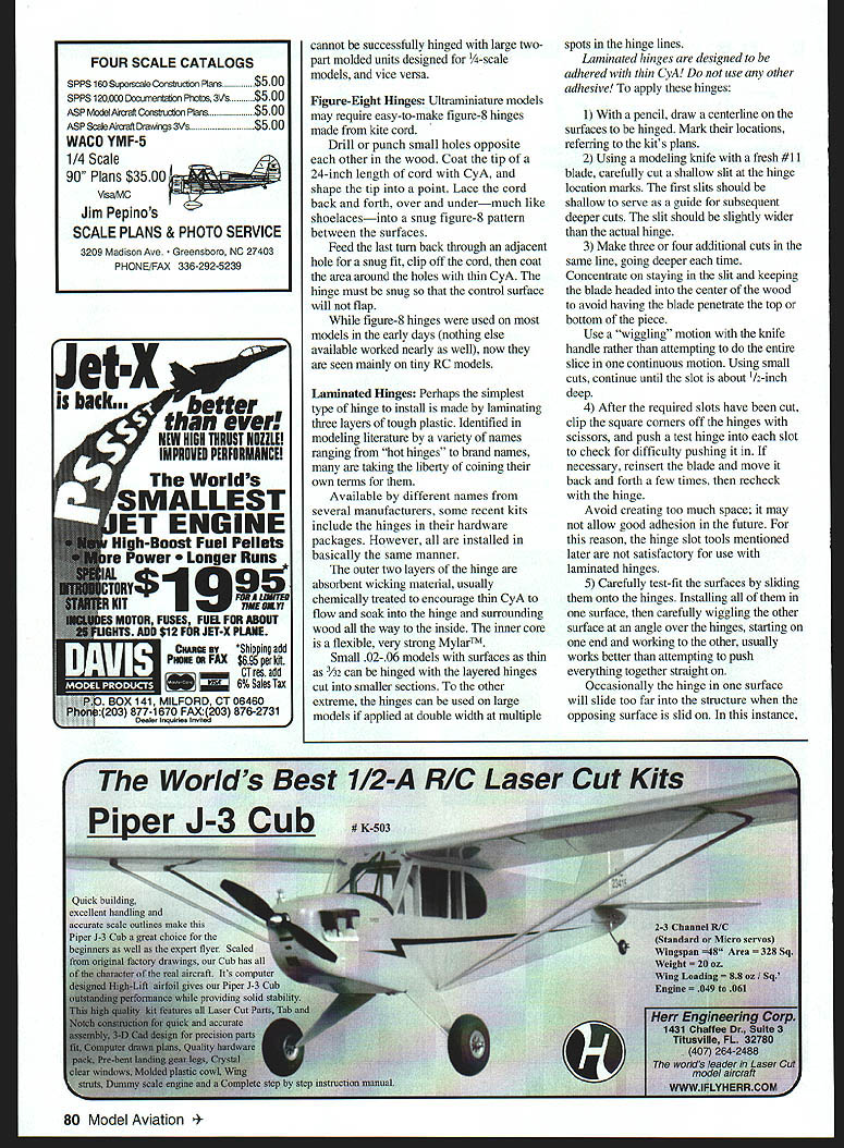 U DB Mathews ikZ L Lets discuss part construction common source trouble newcomers sometimes more-experienced builders Hinging movable surfaces Radio Control RC models too difficult anymore models seen huge spaces between halves gap surfaces bind moved surfaces level worst surfaces inadequately adhered model hinging problems limited homebuilt models frequently found acronym ARF [Almost-Ready-to-Fly] RTF [Ready-to-Fly] RTC [Ready-to-Cover] ARTC [Almost-Ready-to-Cover] etc group factory-built models Occasionally hinge installations poor its necessary cut off hinges redo early days escapement RC little power available rule thumb pushrod off surface should fall up down its own weight free movement also considered necessary Control Line CL models Common practice use section thin music wire imbedded its ends surface running inside section aluminum tube adhered other surface Alternately sections cloth adhered surfaces over-and-under patterna method still used often CL models considerable increase force modern servos no longer need hinges that free-moving still represents worthwhile goal following might old hat experienced modelers might pick up tidbit Ive hinged model two time am moment fully expect learn soon most-common problem new fliers airplanes hinging control surfaces RTF models have improperly factoryinstalled hinges Hinges should adhered strongly enough resist pulling surface given good tug ones fingers Surfaces should move freely binding run limits specified deflection Conversely space between mating halves surfaces should minimum improved efficiency Small gaps reduce amounts needed deflection reducing airflow through opening resulting smoother flights less stress servos linkages prevention flutter higher speeds ARF models hinges loose flow medium CyA cyanoacrylate glue slots gap excessive surfaces bind flexed may necessary cut hinges off flush both surfaces sharp modeling knife rehinge using products will mention Any rnbbing binding linkage between servo moving surfaces must corrected fly model airplane loose binding hinges Several classes hinges available selection somewhat function application small models thin surfaces April 1999 79 Materials make slotting tool installing hingesSandwich blade between plywood pieces glue medium CyA structure flat surface cut level slots hinge place Note corners have trimmed cannot successfully hinged large twopart molded units designed h-scale models vice versa Figure-Eight Hinges Ultraminiature models may require easy-to-make figure-8 hinges made kite cord Drill punch small holes opposite other wood Coat tip 24-inch length cord CyA shape tip point Lace cord back forth over undermuch like shoelacesinto snug figure-8 pattern between surfaces Feed last turn back through adjacent hole snug fit clip off cord coat area around holes thin CyA hinge must snug control surface will flap figure-8 hinges used models early days nothing else available worked nearly well now seen mainly tiny RC models Laminated Hinges Perhaps simplest type hinge install made laminating three layers tough plastic Identified modeling literature variety names ranging hot hinges brand names taking liberty coining own terms Available different names several manufacturers some recent kits include hinges hardware packages However installed basically same manner outer two layers hinge absorbent wicking material usually chemically treated encourage thin CyA flow soak hinge surrounding wood way inside inner core flexible very strong MylarTM Small 02-06 models surfaces thin /32 can hinged layered hinges cut smaller sections other extreme hinges can used large models applied double width multiple spots hinge lines Laminated hinges designed adhered thin CvA use other adhesive apply hinges 1 pencil draw centerline surfaces hinged Mark locations referring kits plans 2 Using modeling knife fresh #11 blade carefully cut shallow slit hinge location marks first slits should shallow serve guide subsequent deeper cuts slit should slightly wider actual hinge 3 Make three four additional cuts same line going deeper time Concentrate staying slit keeping blade headed center wood avoid having blade penetrate top bottom piece Use wiggling motion knife handle rather attempting entire slice continuous motion Using small cuts continue until slot about /2-inch deep 4 After required slots have cut clip square corners off hinges scissors push test hinge slot check difficulty pushing necessary reinsert blade move back forth few times recheck hinge Avoid creating too much space may allow good adhesion future reason hinge slot tools mentioned later satisfactory use laminated hinges 5 Carefully test-fit surfaces sliding onto hinges Installing surface carefully wiggling other surface angle over hinges starting end working other usually works better attempting push everything together straight Occasionally hinge surface will slide too far structure opposing surface slid instance 80 Model Aviation SCALE CATALOGS SPPS16osu~eCononPIs$500 SPPS 12OOfl Doajaentaton Photm 3Vs$500 ASP ModeLAJrraftComton Plans$500 ASP SiePJrmft Drawrus 3Vs$500 WACO YMF-5 1/4 Scale 90 Plans $3500 VaMC Jim Pepinos SCALE PLANS & PHOTO SERVICE 3209 Madison Ave Greensboro NC 27403 PHONE/FAX 336-292-5239 pin can stuck through hold place hinges creased bent toss almost impossible use crooked 6 create proper gap between parts deflect control surface maximum amount needed surfaces close together possible will automatically set proper hinge gap everything functions well remove surfaces cover 7 Once covered relocate previously prepared slots cut through covering material remove about 6 around slot will assure flow thin CyA hinge surrounding wood possibility covering material creating dam slot 8 Put three four drops thin CyA hinge gap Applicator tips such Sig SH-10220 greatly simplify delivery small amounts runoff adhesive will quickly wick slot penetrates wood hinge surface Continue dropping adhesive onto top bottom hinge surface until have adhered Excess