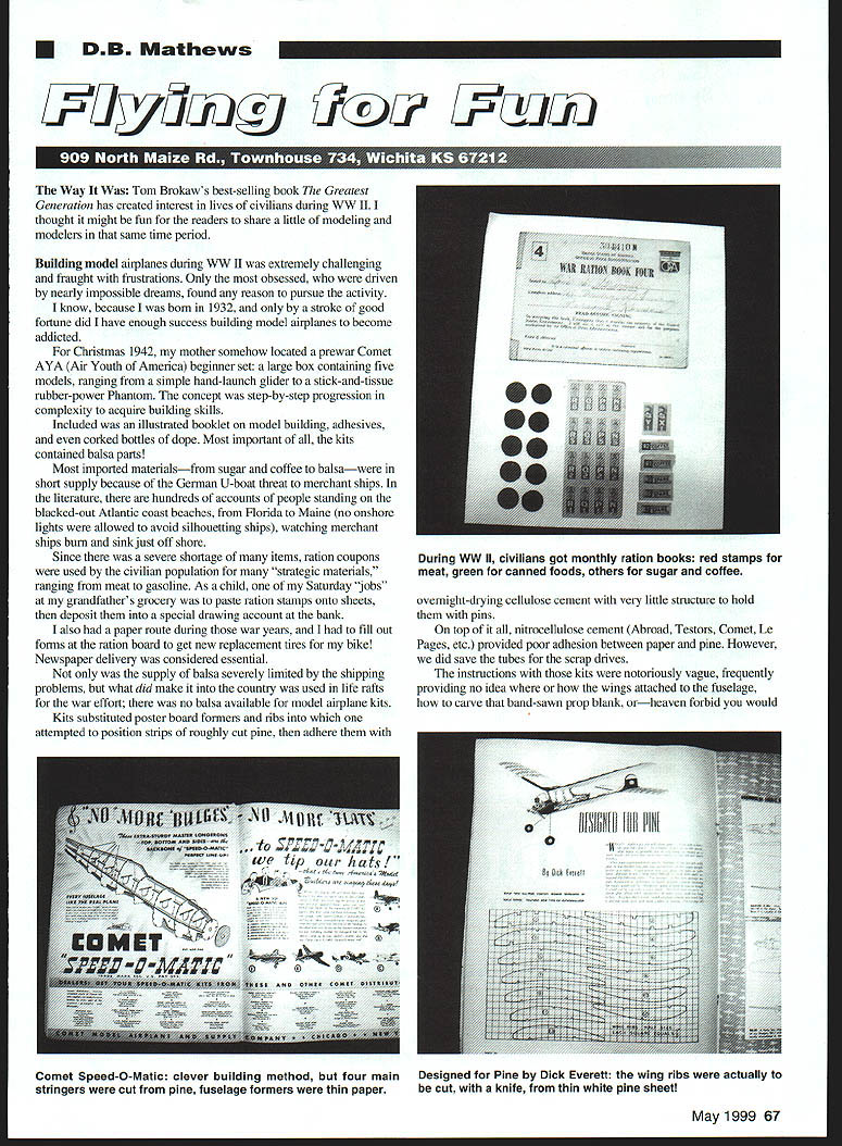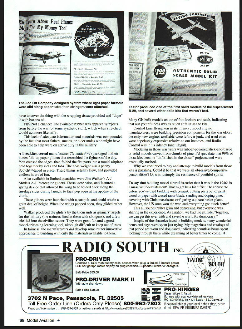 DB Mathews UyL1iy 1L7 ZtL1oIz1 r1 Eu F11iU f Way Tom Brokaws best-selling book Greatest Generation has created interest lives civilians during WW II thought might fun readers share little modeling modelers same time period Building model airplanes during WW II extremely challenging fraught frustrations Only obsessed driven nearly impossible dreams found reason pursue activity know because born 1932 stroke good fortune did have enough success building model airplanes become addicted Christmas 1942 mother somehow located prewar Comet AYA Air Youth America beginner set large box containing five models ranging simple hand-launch glider stick-and-tissue rubber-power Phantom concept step-by-step progression complexity acquire building skills Included illustrated booklet model building adhesives corked bottles dope Most important kits contained balsa parts Most imported materialsfrom sugar coffee balsawere short supply because German U-boat threat merchant ships literature hundreds accounts people standing blacked-out Atlantic coast beaches Florida Maine no onshore lights allowed avoid silhouetting ships watching merchant ships burn sink just off shore Since severe shortage items ration coupons used civilian population strategic materials ranging meat gasoline As child Saturday jobs grandfathers grocery paste ration stamps onto sheets deposit special drawing account hank also paper route during war years fill out forms ration board get new replacement tires bike Newspaper delivery considered essential supply balsa severely limited shipping problems what did make country used life rafts war effort no balsa available model airplane kits Kits substituted poster board formers ribs attempted position strips roughly cut pine adhere overnight-drying cellulose cement very little structure hold pins top nitrocellulose cement Abroad Testors Comet Le Pages etc provided poor adhesion between paper pine However did save tubes scrap drives instructions kits notoriously vague frequently providing no idea wings attached fuselage carve band-sawn prop blank orheaven forbid would May1999 67 During WW II civilians got monthly ration books red stamps meat green canned foods others sugar coffee Comet Speed-O-Matic clever building method four main stringers cut pine fuselage formers thin paper Designed Pine Dick Everett wing ribs actually cut knife thin white pine sheet have cover thing wrapping tissue provided dope banana oil Fly chance available rubber apparently rejects before war some synthetic stuff stretched would act like taffy lack adequate information materials compounded fact fathers uncles older males might have able help active duty military breakfast cereal manufacturer WheatiesTM packaged boxes fold-up paper gliders resembled fighters day creased edges folded flat parts model airplane held together slots tabs nose weight penny ScotchTM-taped place things actually flew provided endless hours fun Also available limited quantities Jim Walkers A-J Models A-J Interceptor gliders balsa featured spring device allowed wing folded back along fuselage sides during launch pop open apogee climb gliders launched catapult could obtain great deal height wings popped open glided rather well Walker produced gliders thousands gunnery targets military trainees fired shotguns few trickled civilian sector great fun good model-trimming learning tool although difficult keep out trees fairness manufacturers did develop some rather innovative approaches building materials available odel Aviation built models top foot lockers such indicating youthfulness much fault kits Control Line flying its infancy model engine manufacturers building precision components war effort new engines available leftover junk used ones hopelessly expensive relative incomes Radio Control its infancy illegal Modeling war years rubber-powered stick-and-tissue solid models carved chunks pine Id speculate 99% kits became unfinished closet projects eventually trashed continued buy attempt build models kits puzzling Could obsessive/compulsive personalities simply resilience youthful spirit say building model aircraft easier 1940s massive understatement might bit difficult appreciate unless youve tried building cement cutting parts out print wood paper used razor blade sanding doping pine covering Christmas tissue figuring out bare basics plans However US soon won war everything got much better sounds rather grim depressing everyone sharing experience As nation attitude together can get over save world democracy spite obstacles faced building models wonderful hours days spent just trying magazines catalogs period worn dog-eared indicating countless hours spent looking through dreaming better times come Joe Ott Company designed system light paper formers slid along paper tube stringers attachedTestor produced first solid models super-secret B-29 several other solid kits werent bad DIO SOUTH INC PRODRIVER Contains 4 1300 mah battery cells senses plug fouled & boosts power LED bar garaph meter display plug condition Supports Futaba J chargers Sale Price Pap iiPa PRO-DRIVER MARK. auto shut downa Pape Sale Price $5800PRO-HINGES _______Easiest Hinge Install use cyanocrylate adhesives 3702 N Pace Pensacola FL 32505RC- $2 49Ipkg 18 Scale $27gIpkg 24 Toll Free Order Line Orders Only Please800-962-7802II available local hobby shop order Repair formation 850-434-0909 visit website http//wwwwtpnet/DBEST/radiosouth/RSI htmldirect DEALER INQUIRIES INVITED