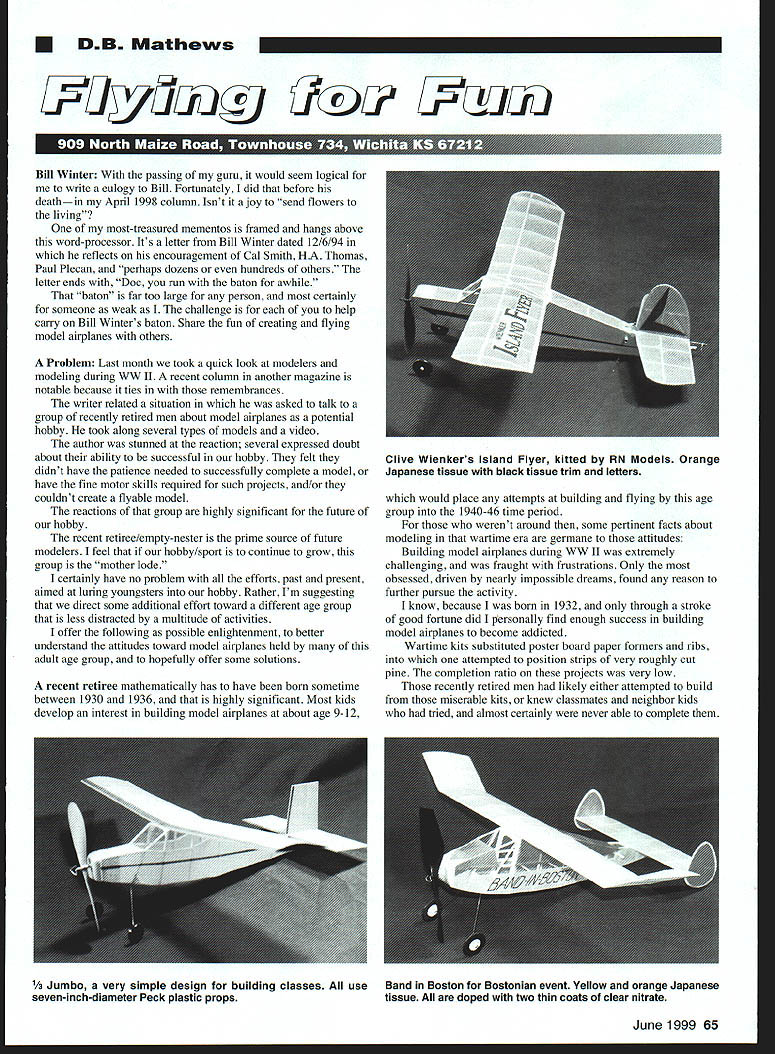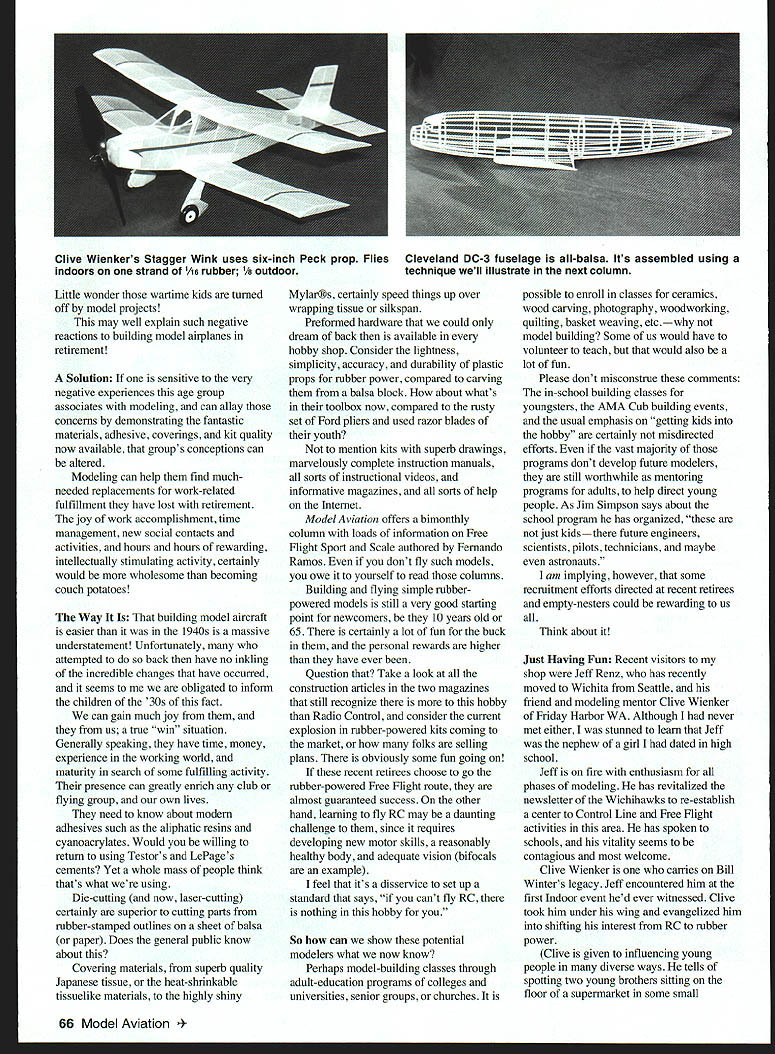 DB Mathews UJ 7Q/ fk~jjjj Bill Winter passing guru would seem logical write eulogy Bill Fortunately did before deathin April 1998 column Isnt ajoy send flowers living most-treasured mementos framed hangs above word-processor Its letter Bill Winter dated 12/6/94 reflects encouragement Cal Smith HA Thomas Paul Plecan perhaps dozens hundreds others letter ends Doc run baton awhile baton far too large person certainly someone weak challenge help carry Bill Winters baton Share fun creating flying model airplanes others Problem Last month took quick look modelers modeling during WW II recent column another magazine notable because ties remembrances writer related situation asked talk group recently retired men about model airplanes potential hobby took along several types models video author stunned reaction several expressed doubt about ability successful hobby felt didnt have patience needed successfully complete model have fine motor skills required such projects and/or couldnt create flyable model reactions group highly significant future hobby recent retiree/empty-nester prime source future modelers feel hobby/sport continue grow group mother lode certainly have no problem efforts past present aimed luring youngsters hobby Rather Im suggesting direct some additional effort toward different age group less distracted multitude activities offer following possible enlightenment better understand attitudes toward model airplanes held adult age group hopefully offer some solutions recent retiree mathematically has have born sometime between 1930 1936 highly significant Most kids develop interest building model airplanes about age 9-12 would place attempts building flying age group 1940-46 time period werent around some pertinent facts about modeling wartime era germane attitudes Building model airplanes during WW II extremely challenging fraught frustrations Only obsessed driven nearly impossible dreams found reason further pursue activity know because born 1932 through stroke good fortune did personally find enough success building model airplanes become addicted Wartime kits substituted poster board paper formers ribs attempted position strips very roughly cut pine completion ratio projects very low recently retired men likely either attempted build miserable kits knew classmates neighbor kids tried almost certainly never able complete June 1999 65 CHive Wienkers Island Flyer kitted RN Models Orange Japanese tissue black tissue trim letters V3 Jumbo very simple design building classes useBand Boston Bostonian event Yellow orange Japanese seven-inch-diameter Peck plastic propstissue doped two thin coats clear nitrate Little wonder wartime kids turned off model projects may well explain such negative reactions building model airplanes retirement Solution sensitive very negative experiences age group associates modeling can allay concerns demonstrating fantastic materials adhesive coverings kit quality now available groups conceptions can altered Modeling can help find muchneeded replacements work-related fulfillment have lost retirement joy work accomplishment time management new social contacts activities hours hours rewarding intellectually stimulating activity certainly would wholesome becoming couch potatoes Way building model aircraft easier 1 940s massive understatement Unfortunately attempted back have no inkling incredible changes have occurred seems obligated inform children 30s fact can gain much joy us true win situation Generally speaking have time money experience working world maturity search some fulfilling activity presence can greatly enrich club flying group own lives need know about modern adhesives such aliphatic resins cyanoacrylates Would willing return using Testors LePages cements Yet whole mass people think thats what using Die-cutting now laser-cutting certainly superior cutting parts rubber-stamped outlines sheet balsa paper Does general public know about Covering materials superb quality Japanese tissue heat-shrinkable tissuelike materials highly shiny Mylars certainly speed things up over wrapping tissue silkspan Preformed hardware could dream back available hobby shop Consider lightness simplicity accuracy durability plastic props rnbber power compared carving balsa block about whats toolbox now compared rusty set Ford pliers used razor blades youth mention kits superb drawings marvelously complete instruction manuals sorts instructional videos informative magazines sorts help Internet Model Aviation offers bimonthly column loads information Free Flight Sport Scale authored Fernando Ramos dont fly such models owe yourself read columns Building flying simple rubberpowered models still very good starting point newcomers 10 years old 65 certainly lot fun buck personal rewards higher have ever Question Take look construction articles two magazines still recognize hobby Radio Control consider current explosion rubber-powered kits coming market folks selling plans obviously some fun going recent retirees choose go rubber-powered Free Flight route almost guaranteed success other hand learning fly RC may daunting challenge since requires developing new motor skills reasonably healthy body adequate vision bifocals example feel its disservice set up standard says cant fly RC nothing hobby So bow can show potential modelers what now know Perhaps model-building classes through adult-education programs colleges universities senior groups churches possible enroll classes ceramics wood carving photography woodworking quilting basket weaving etcwhy model building Some us would have volunteer teach would also lot fun Please dont misconstrue comments in-school building classes youngsters AMA Cub building events usual emphasis getting kids hobby certainly misdirected efforts vast majority programs dont develop future modelers still worthwhile mentoring programs adults help direct young people As Jim Simpson says about school program has organized just kids re engineers scientists pil