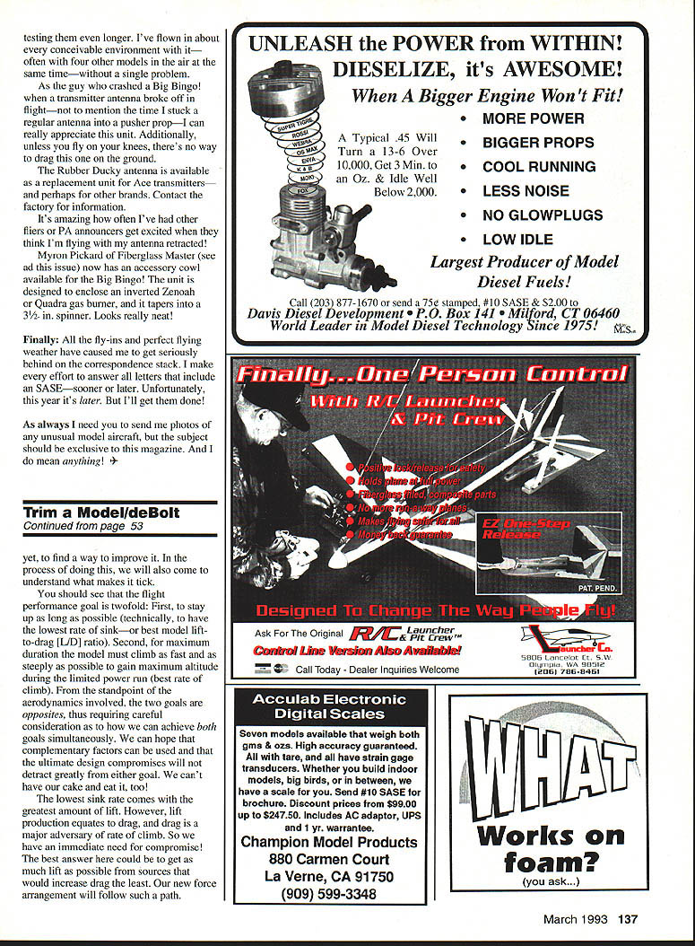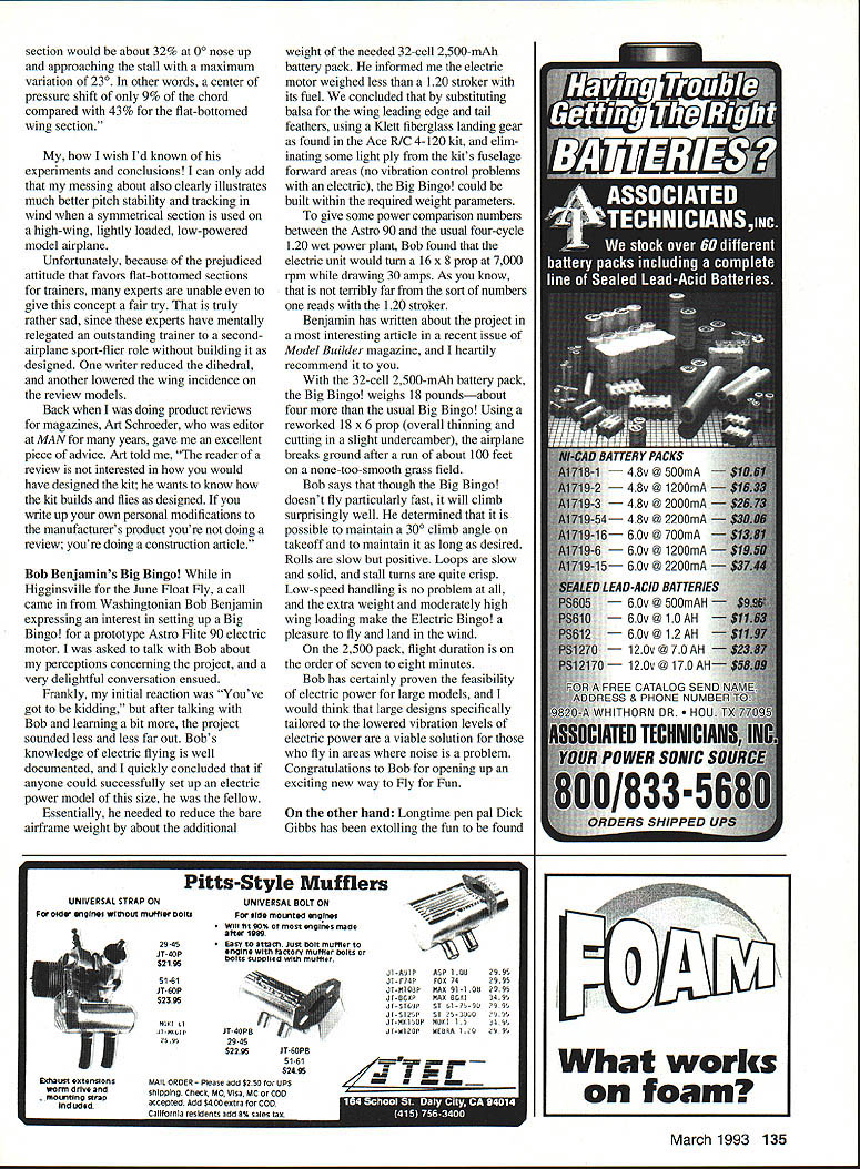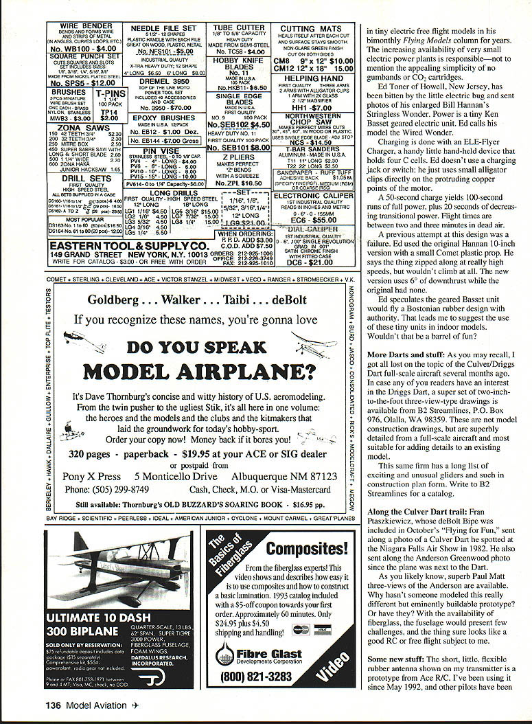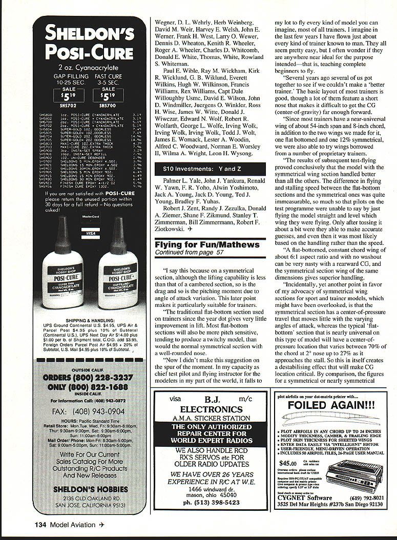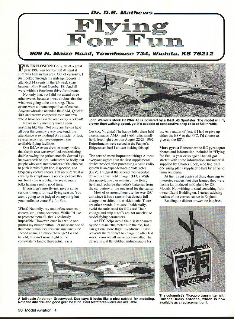 Dr. D B Mathews FUN EXPLOSION Golly what great year 1992 fly-ins least sure area Out curiosity just looked through mileage records attended 14 events 23-week span between May 9 October 18 within four-hour drive home did attend three other events because obvious wind going too strong events noncompetitive course Anyone also attended SAM Quickie 500 pattern competitions area would have road weekend Never memory have seen anything like fly-ins held over country weekend attendance exploding As matter fact several activities have outgrown available flying facilities IMAA event drew models pit area overfilled necessitating double rowing parked models Several flyins swamped local volunteers badly people members club pitch flight line inspection frequency control chores Im sure what causing explosion noncompetitive flyins sure delight see folks having really good time arent fly-ins give some serious thought next flying season arent going judged anything smile come Fly Fun What Naturally mail often contains contest etc announcements Id like promote thats obviously impossible However once pushes humor button Let share outlandish announces second annual Cuckoo Challenge Lo behold isnt some flight copywriters fancy actually Cuckoo Virginia happy folks held combination AMA- SAM-rules smallfield free flight event August 22-23 1992 Refreshments served Paupers Ridge snack bar am making up second important thing Almost everyone agrees first supplemental device needed after purchasing basic radio system expanded-scale volt meter ESV suggest second most-needed device fast field cbarger FFC gadget can remain flying field recharge radios batteries car battery used starter Most us around use Ace R/C unit since has sensor detects full charge shifts trickle mode other brands Im sure Incidentally avoid units used RC cars voltage amp cutoffs matched model-flying parameters An FFC helps avoid disaster caused classic meters red can get flight syndrome also prevents forgot charge up after last week error make occasionally device just flat-dabbed indispensable us As matter fact 1 give up either ESV FEC Id choose give up ESV gyros Remember RC gyrocopter photos information included Flying Fun year ago got started some information material supplied Charles Beck built using plans supplied him friend Australia first sent copies drawings interested readers learned kit produced England DB Models wishing steal something owner David Boddington started advising readers correct source England Boddington did answer inquiries 56 Model Aviation u FrF 909 N Maize Road Townhouse 734 Wichita KS 76212 John Walkers stock kit wniz 40 powered K&B 45 Sportster model will fly slower walking speed yet its capable consecutive snap rolls full throttle columnists Micropro transmitter full-scale Anderson Greenwood Doc says looks like nice subject modeling Rubber Ducky antenna now Note dihedral good gear location Paul Matt three-views available available replacement unit have unable verify whether DB Models still exists appeared put whole situation limbo Now along comes Peter H Johnson Walton Hills Ohio information will make possible others build fly wayout-of-the-mt models Peter has discovered Gyrace later design Boddington published construction article RCM&E some years ago drawings available Bob Holman Plans see ad issue plan number RC 1553 youre consider ordering Model Aircraft Plan Book illustrates hundreds free flight control line RC construction plans have published England over years Johnson says model will loop roll hover fly backward breeze 25-in rotors 26-in centers 50 negative pitch Power 05 25 FSR Frankly Gyrace attractive DB Models gyro anyway build Looks like true Flying Fun project Now tell As previously related column spent huge amount time developing trainer Ace RIC stumbled about trying several airfoil variations etc finally concluded moderately thick semisymmetrical airfoil superior traditional flat-bottom section calmest wind conditions As often case discovery original just thought Ted Off Ventura California recently sent copies series columns written way back 1981 RCM&E England Peter Russell life certainly would have simpler seen Russells material Above Astro Flight 90 motor installed Big Bingo swings 16 x 8 prop 8 10 minutes 32-cell 2500-mAh battery pack Left Completed model covered Coverites 21st Century Fabric Lightweight fiberglass gear replaced kits heavy-duty aluminum unit before beginning trainer project familiar Peter Russell considered preeminent authority modeling matters England English-speaking world essentially Bill Winter Ken Willard Europe Im going quote sections columns Russell wrote September 1981 December 1981 May 1982 issues RCM&E have done lot experimenting matching aerofoils aeroplanes have come conclusion plain straightforward symmetrical wing between 10 15% thickness located about 35% chord takes lot beating practically powered model aircraft March 1993 57 Top Left Bob Benjamins Electric Big Bingo uncovered kits ruggedness enabled Bob safely lighten structure Continued page 134 Peter Johnsons Gyrace RCM&E plan #1553 available E4. 0 howell New Jersey eniargea iiannan iringies through Bob Holman Plans Powered OS 25 FSR Wonder 13-in span Ed calls model Wired Wonder Its model will loop roll hover fly backwards breeze powered tiny Ken Basset geared electric motor unit Wegner D L Wehrly Herb Weinberg David M Weir Harvey E Welsh John E Werner Frank H West Larry 0 Wewer Dennis D Wheaton Kenith R Wheeler Roger Wheeler Charles D Whitcomb Donald E White Thomas White Rowland S Whiteman Paul E Wible Ray M Wickham Kirk R Wicklund G B Wikiund Everett Wilkins Hugh W Wilkinson Francis Williams Rex Williams Capt Dale Willoughby Usmc David E Wilson John D Windmiller Juergens 0 Winkler Ross H Wise James W Witte Donald J Wiwczar Edward N Wolf Robert R Wolfarth George L Wolfe Irving Wolk Irving Wolk Irving Wolk Todd J Wolt James E Womack Lester Woodin Alfred C Woodward Norman E Worsley II Wilma Wright Leon H Wysong Palmer 