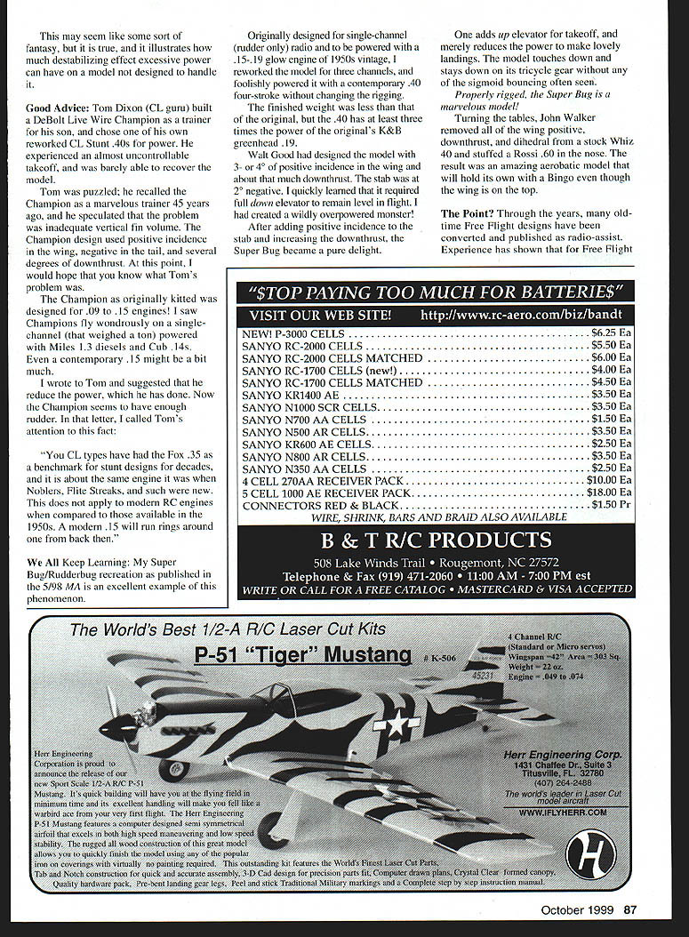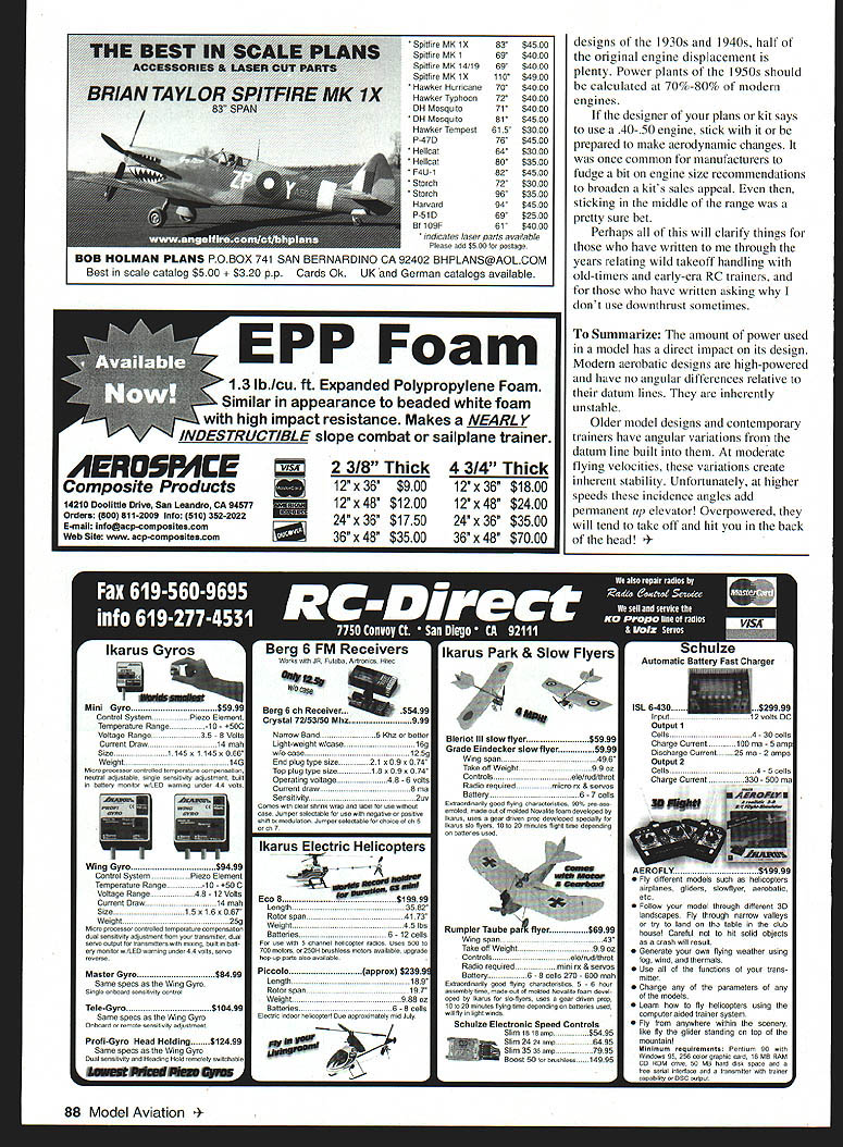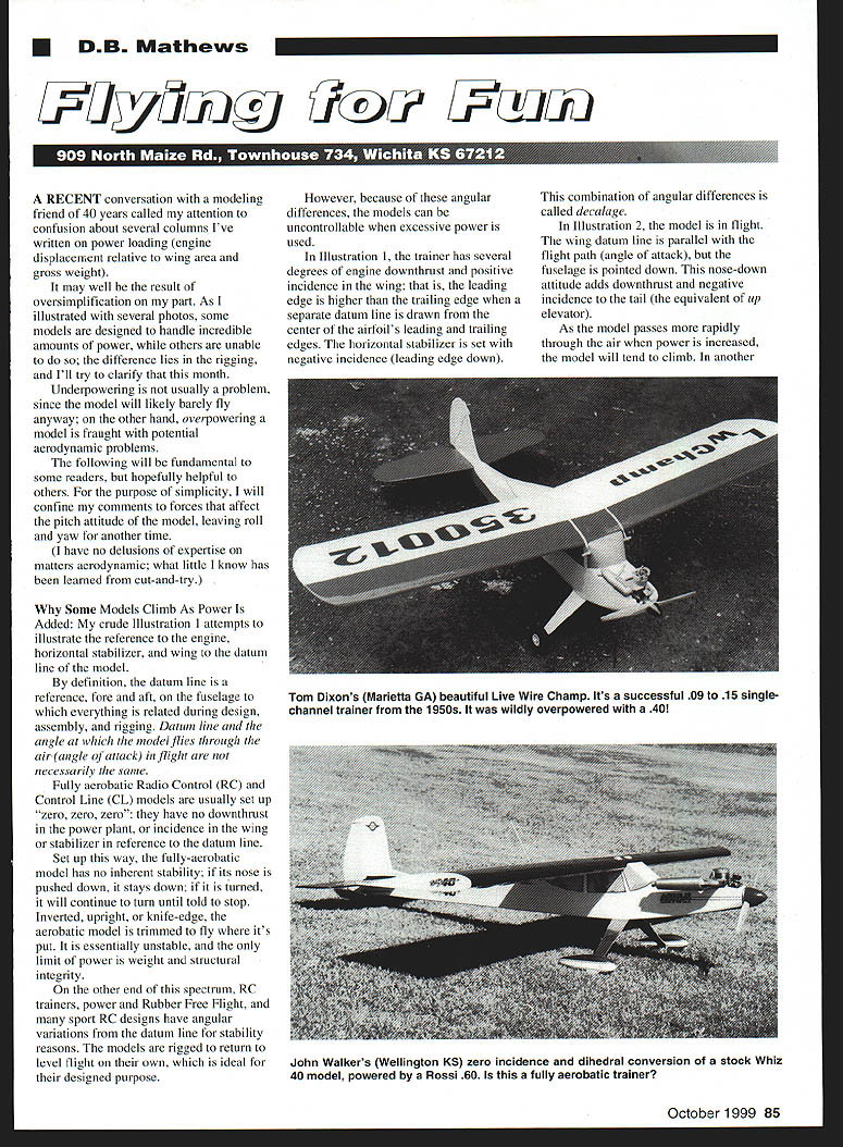 U DB Mathews RECENT conversation modeling friend 40 years called attention confusion about several columns Ive written power loading engine displacement relative wing area gross weight may well result oversimplification part As illustrated several photos some models designed handle incredible amounts power others unable difference lies rigging Ill try clarify month Underpowering usually problem since model will likely barely fly anyway other hand overpowering model fraught potential aerodynamic problems following will fundamental some readers hopefully helpful others purpose simplicity will confine comments forces affect pitch attitude model leaving roll yaw another time have no delusions expertise matters aerodynamic what little know has learned cut-and-try Some Models Climb As Power Added crude Illustration attempts illustrate reference engine horizontal stabilizer wing datum line model definition datum line reference fore aft fuselage everything related during design assembly rigging Datum line angle model flies through air angle attack flight necessarily same Fully aerobatic Radio Control RC Control Line CL models usually set up zero zero zero have no downthrust power plant incidence wing stabilizer reference datum line Set up way fully-aerobatic model has no inherent stability its nose pushed down stays down turned will continue turn until told stop Inverted upright knife-edge acrobatic model trimmed fly its put essentially unstable limit power weight structural integrity other end spectrum RC trainers power Rubber Free Flight sport RC designs have angular variations datum line stability reasons models rigged return level flight own ideal designed purpose However because angular differences models can uncontrollable excessive power used Illustration 1 trainer has several degrees engine downthrust positive incidence wing leading edge higher trailing edge separate datum line drawn center airfoils leading trailing edges horizontal stabilizer set negative incidence leading edge down combination angular differences called decalage Illustration 2 model flight wing datum line parallel flight path angle attack fuselage pointed down nose-down attitude adds downthrust negative incidence tail equivalent up elevator As model passes rapidly through air power increased model will tend climb another October 1999 85 Tom Dixons Marietta GA beautiful Live Wire Champ Its successful 09 15 singlechannel trainer 1950s wildly overpowered 40 John Walkers Wellington KS zero incidence dihedral conversion stock Whiz 40 model powered Rossi 60 fully aerobatic trainer situation power remains constant model pushed dive down elevator will naturally return level flight elevator returned neutral way pitch-axis stability built inexactly what designer wants trainer also reason instructors heard say throttle back let go sticks student pilots model gets out control desirable qualities become liability model grossly overpowered its velocity exceeds built-in stability overemphasizing Look Illustration 2 consider what would occur model flew really fast decalage Though engine downthrust used help control climb tendency limits much can used excess downthrust will require up elevator engine running wide open yet throttled back model will tend stall model flown under continuous power needs 50 downthrust youre wasting much power might well use smaller power plant Free Flight power applied short time case rubber power delivered short bursts declining thrust much downthrust can sometimes should used Free Flight designs also incorporate considerable angular differences between wing stabilizer prevent tendency model drop its nose dive under power Conversely Free Flight model passes vertical becomes inverted look drawing see what will happen Classic Example Raw Power 1950s multichannel reed radios became available separate classes RC competition created provide chance less-complex gear still compete separately full fouractually eight- channel reed aircraft few years classes based number surfaces controlled Class II limited two movable surfaces may find bard believe some instances choice rudder throttle throttlenot elevatorwas used control pitch attitude strange designs set up loop roll Vast amounts power such 45s what would considered 19 models coupled huge amounts downtbrust such 200 enough right thrust control torque Negative incidence built stabilizer models often steerable ground takeoff involved applying full throttle until takeoff speed achieved throttle reduced eliminate force downthrust allowing model take off flight stab negative overcome adjusting throttle climb descent pure power function loop full power added generate forward speed throttle chopped forcing model up over effect stabilizer roll power rudder added top loop dihedral ineffective roll axis since wing inverted Standard side view datum line parallel ground Showing downthrust positive wing negative stab same aircraft shown flight angle attack matches wings datum line Note angular changes 86 Model Aviation ABILIZER AT 30 DOWNTHRUST ILLUSTRATION 1 AS SEEN ON PLANS WING NOW AT 00 STABILIZER NOW AT 6o AT 6O ILLUSTRATION 2 ANGLE OF ATTACK IN FLIGHT may seem like some sort fantasy true illustrates much destabilizing effect excessive power can have model designed handle Good Advice Tom Dixon CL guru built DeBolt Live Wire Champion trainer son chose own reworked CL Stunt 40s power experienced almost uncontrollable takeoff barely able recover model Tom puzzled recalled Champion marvelous trainer 45 years ago speculated problem inadequate vertical fin volume Champion design used positive incidence wing negative tail several degrees downthrust point would hope know what Toms problem Champion originally kitted designed 09 15 engines saw Champions fly wondrously singlechannel weighed ton powered Miles 13 diesels Cub 14s contemporary 15 might bit much wrote Tom suggested reduce power has done Now Champion seems have enough rudder letter called Toms attention fact CL types have