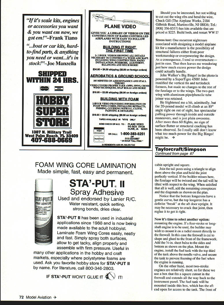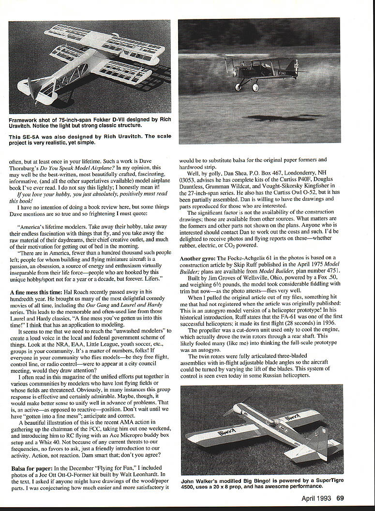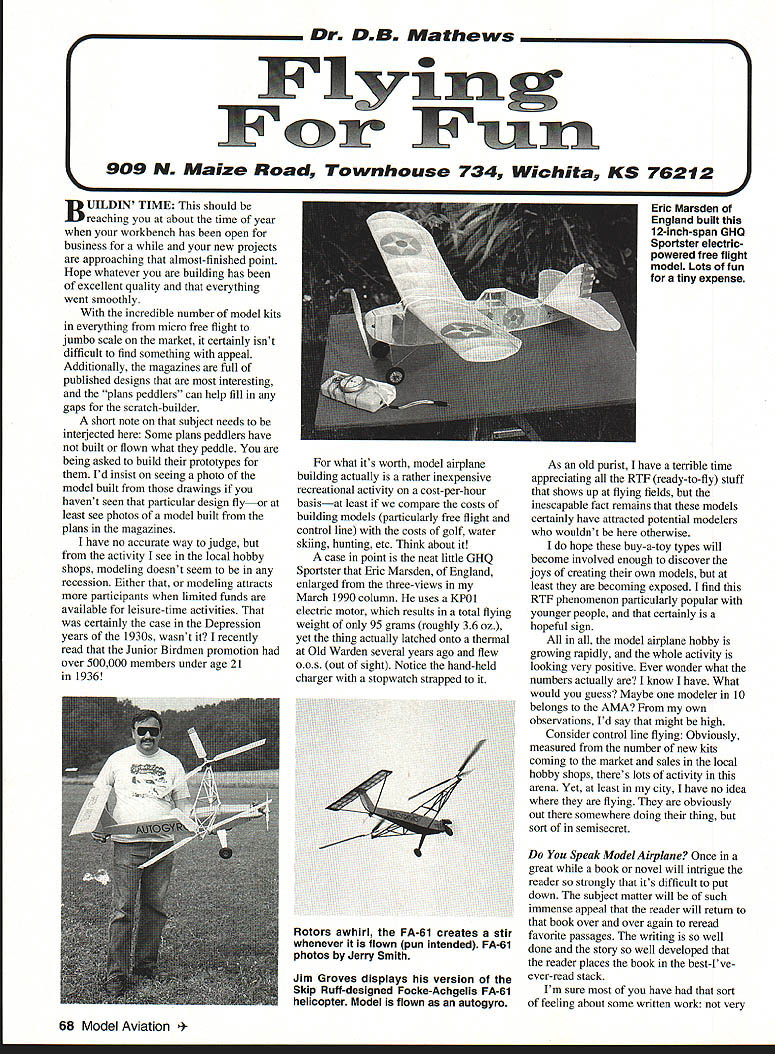 Dr DB Mathews B UILDIN TIME should reaching about time year workbench has open business new projects approaching almost-finished point Hope whatever building has excellent quality everything went smoothly incredible number model kits everything micro free flight jumbo scale market certainly isnt difficult find something appeal Additionally magazines full published designs interesting plans peddlers can help fill gaps scratch-builder short note subject needs interjected Some plans peddlers have built flown what peddle being asked build prototypes Id insist seeing photo model built drawings havent seen particular design flyor least see photos model built plans magazines have no accurate way judge activity see local hobby shops modeling doesnt seem recession Either modeling attracts participants limited funds available leisure-time activities certainly case Depression years 1930s wasnt recently read Junior Birdmen promotion over 500000 members under age 21 1936 what its worth model airplane building actually rather inexpensive recreational activity cost-per-hour basisat least compare costs building models particularly free flight control line costs golf water skiing hunting etc Think about case point neat little GHQ Sportster Eric Marsden England enlarged three-views March 1990 column uses KPOl electric motor results total flying weight 95 grams roughly 36 oz yet thing actually latched onto thermal Old Warden several years ago flew oos out sight Notice hand-held charger stopwatch strapped Jim Groves displays version Skip Ruff-designed Focke-Achgelis FA-61 helicopter Model flown autogyro Eric Marsden England built 12-inch-span GHQ Sportster electricpowered free flight model Lots fun tiny expense As old purist have terrible time appreciating RTF ready-to-fly stuff shows up flying fields inescapable fact remains models certainly have attracted potentiai modelers wouldnt otherwise hope buy-a-toy types will become involved enough discover joys creating own models least becoming exposed find RTF phenomenon particularly popular younger people certainly hopeful sign model airplane hobby growing rapidly whole activity looking very positive Ever wonder what numbers actually know have What would guess Maybe modeler 10 belongs AMA own observations Id say might high Consider control line flying Obviously measured number new kits coming market sales local hobby shops theres lots activity arena Yet least city have no idea flying obviously out somewhere doing thing sort semisecret Speak ModelAirplane Once great book novel will intrigue reader strongly its difficult put down subject matter will such immense appeal reader will return book over over again reread favorite passages writing well done story well developed reader places book best-Iveever-read stack Im sure have sort feeling about some written work very 68 Model Aviation zig Fr Fu 909 N Maize Road Townhouse 734 Wichita KS 76212 Rotors awhirl FA-61 creates stir whenever flown pun intended FA-61 photos Jerry Smith SE-SA also designed Rich Uravitch scale project very realistic yet simple often least once lifetime Such work Dave Thomburgs Speak ModelAirplane opinion may well best-written beautifully crafted fascinating informative other superlatives available model airplane book Ive ever read say lightly honestly mean love hobby just absolutely positively must read book have no intention doing book review some things Dave mentions true frightening must quote Americas lifetime modelers Take away hobby take away endless fascination things fly take away raw material daydreams chief creative outlet much motivation getting out bed morning America fewer hundred thousand such people left people building flying miniature aircraft passion obsession source energy enthusiasm virtually inseparable life forcepeople hooked unique hobby/sport year decade forever Lifers fine mess time Hal Roach recently passed away hundredth year brought us delightful comedy movies time including Gang Laurel Hardy series leads memorable often-used line Laurel Hardy classics fine mess youve gotten us time think has application modeling seems need reach unwashed modelers create loud voice local federal government scheme things Look NRA BAA Little League youth soccer etc groups community Its matter numbers folks everyone community flies modelsbe free flight control line radio controlwere appear city council meeting would draw attention often read magazine unified efforts put together various communities modelers have lost flying fields fields threatened Obviously instances group response effective certainly admirable Maybe though would make better sense unify well advance problems activeas opposed reactiveposition Dont wait until have gotten fine mess anticipate correct beautiful illustration recent AMA action gathering up chairman FCC taking him out weekend introducing him RC flying Ace Micropro buddy box setup Whiz 40 because current threats frequencies no favors ask just friendly introduction activity Action reaction Darn smart dont agree Balsa paper December Flying Fun included photos Joe Ott Ott-O-Former kit built Walt Leonhardt text asked anyone might have drawings wood/paper parts conjecturing much easier satisfactory would substitute balsa original paper formers hardwood strip Well golly Dan Shea PO Box 467 Londonderry NH 03053 advises has complete kits Curtiss P4OF Douglas Dauntless Grumman Wildcat Vought-Sikorsky Kingfisher 27-inch-span series also has Curtiss Owl 0-52 has partially assembled Dan willing have drawings parts reproduced interested significant factor availability construction drawings available other sources What matters formers other parts shown plans Anyone interested should contact Dan work Out costs such Id delighted receive photos flying reports thesewhether rubber electric CO2 powered Another gyro Focke-Achgelis 61 photos based construction article Skip Ruff published April 1975 Model Builder plans available Model Builder plan number 4751 Built Jim Groves We