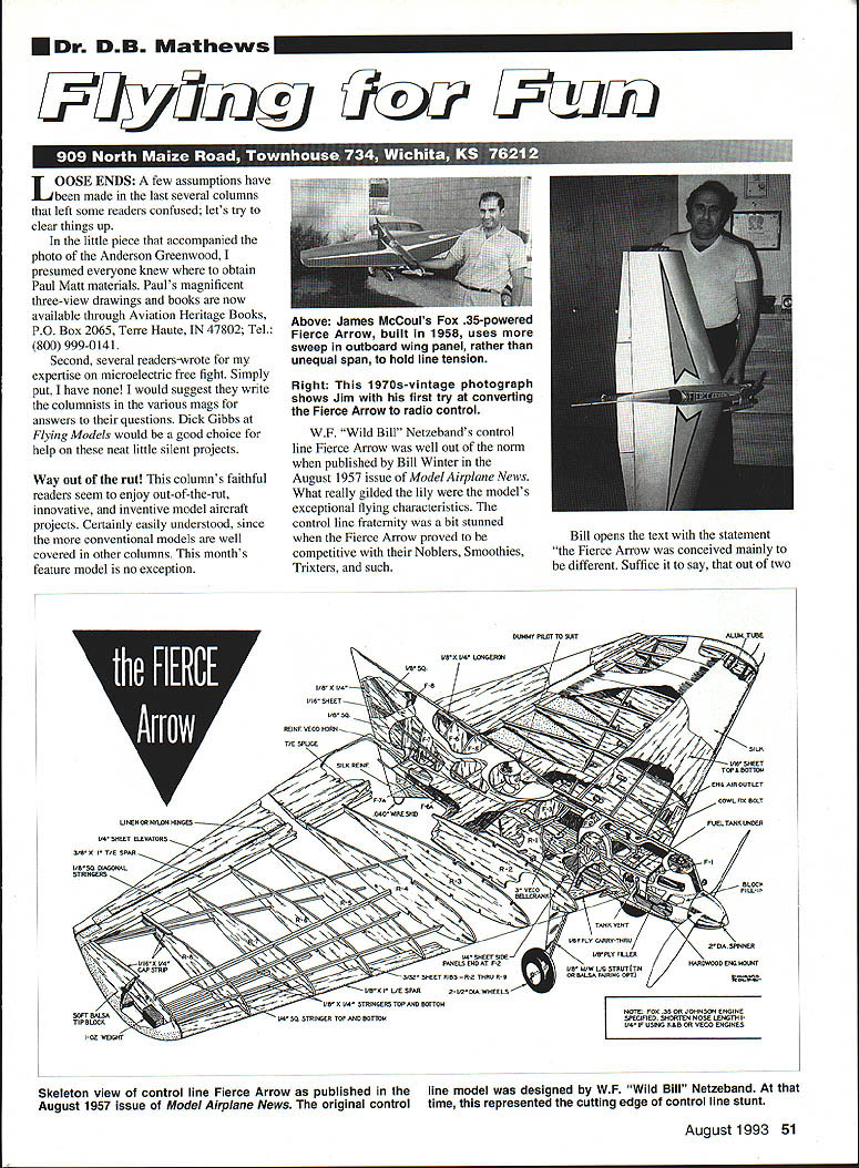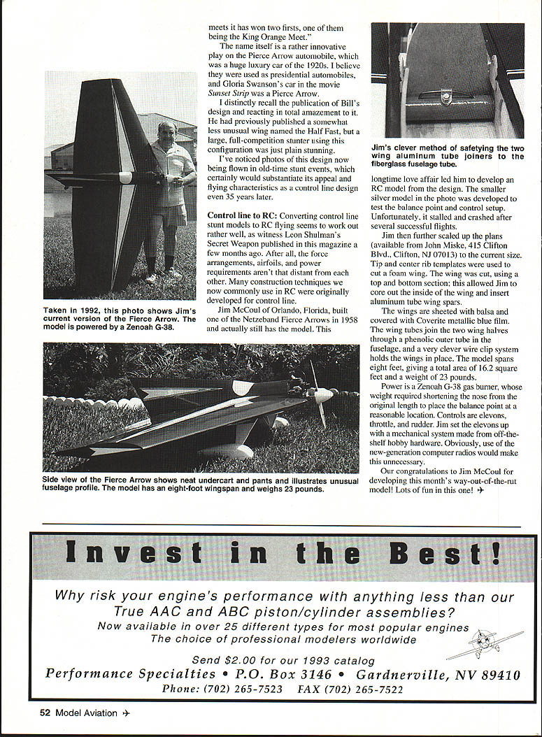 LOOSE ENDS few assumptions have made last several columns left some readers confused lets try clear things up little piece accompanied photo Anderson Greenwood presumed everyone knew obtain Paul Matt materials Pauls magnificent three-view drawings books now available through Aviation Heritage Books PO Box 2065 Terre Haute IN 47802 Tel 800 999-0141 Second several readers-wrote expertise microelectric free fight Simply put have would suggest write columnists various mags answers questions Dick Gibbs Flying Models would good choice help neat little silent projects Way out rut columns faithful readers seem enjoy out-of-the-rut innovative inventive model aircraft projects Certainly easily understood since conventional models well covered other columns months feature model no exception Above James MoCouls Fox 35-powered Fierce Arrow built 1958 uses sweep outboard wing panel rather unequal span hold line tension Right This 1970s-vintage photograph shows Jim first try converting Fierce Arrow radio control WF Wild Bill Netzeband s control line Fierce Arrow well out norm published Bill Winter August 1957 issue Model Airplane News What really gilded lily models exceptional flying characteristics control line fraternity bit stunned Fierce Arrow proved competitive Noblers Smoothies Trixters such Bill opens text statement Fierce Arrow conceived mainly different Suffice say out two REINE VECO AURA /ENS AIR OUTLET PANELS END AT F-S js SrRUTTh -3/32 REET RIBS TURO R-9OR BALSA ENIRING OPT 1180 r L/E SPAR2- I/O DIA WHEELS NOTE FOX 35 OR JOHNSON ENGINE SPEOFIED Si-LORTEN NOSE LENGTh I/41F USING GaB OR VECO ENGINES Skeleton view control line Fierce Arrow published line model designed WF Wild Bill Netzeband August 1957 issue Model Airplane News original control time represented cutting edge control line stunt August1993 51 meets has won two firsts being King Orange Meet name itself rather innovative play Pierce Arrow automobile huge luxury car 1920s believe used presidential automobiles Gloria Swansons car movie Sunset Strip Pierce Arrow distinctly recall publication Bills design reacting total amazement previously published somewhat less unusual wing named Half Fast large full-competition stunter using configuration just plain stunning Ive noticed photos design now being flown old-time stunt events certainly would substantiate its appeal flying characteristics control line design 35 years later Control line RC Convening control line stunt models RC flying seems work out rather well witness Leon Shulmans Secret Weapon published magazine few months ago After force arrangements airfoils power requirements arent distant other construction techniques now commonly use RC originally developed control line Jim McCoul Orlando Florida built Netzeband Fierce Arrows 1958 actually still has model longtime love affair led him develop RC model design smaller silver model photo developed test balance point control setup Unfortunately stalled crashed after several successful flights Jim further scaled up plans available John Miske 415 Clifton Blvd Clifton NJ 07013 current size Tip center rib templates used cut foam wing wing cut using top bottom section allowed Jim core out inside wing insert aluminum tube wing spars wings sheeted balsa covered Coverite metallic blue film wing tubes join two wing halves through phenolic outer tube fuselage very clever wire clip system holds wings place model spans eight feet giving total area 162 square feet weight 23 pounds Power Zenoah G-38 gas burner weight required shortening nose original length place balance point reasonable location Controls elevons throttle rudder Jim set elevons up mechanical system made off-theshelf hobby hardware Obviously use new-generation computer radios would make unnecessary congratulations Jim McCoul developing months way-out-of the-mt model Lots fun engines performance anything less True AAC ABC piston/cylinder assemblies Now available over 25 different types popular engines choice professional modelers worldwide Send $200 1993 catalog Performance Specialties ox 3146 uerville NV 89410 Phone 702 265-7523 FAX 702 265-7522 52 Model Aviation clever method safetying two wing aluminum tube joiners fiberglass fuselage tube Taken 1992 photo shows Jims current version Fierce Arrow model powered Zenoah 0-38 Side view Fierce Arrow shows neat undercart pants illustrates unusual fuselage profile model has eight-foot wingspan weighs 23 pounds