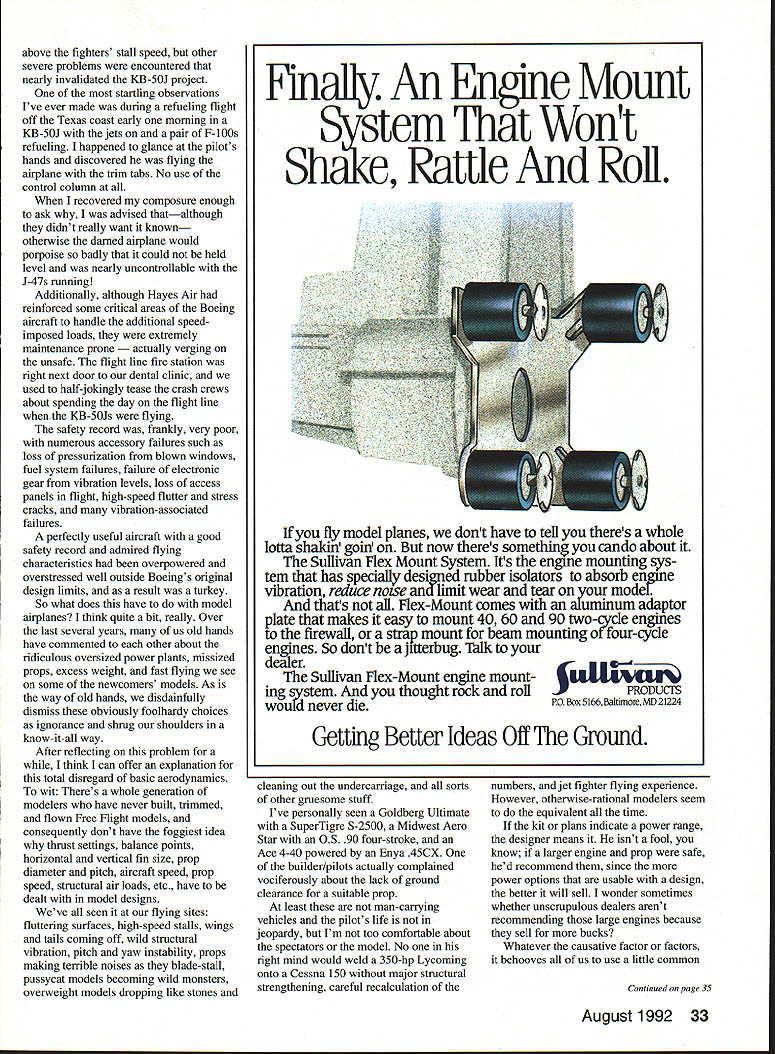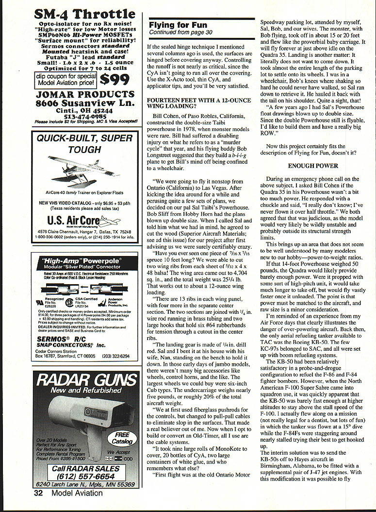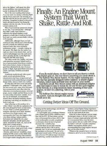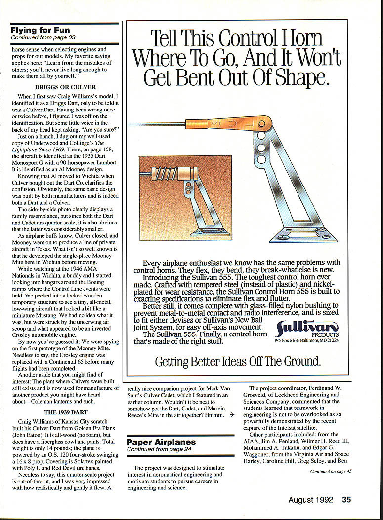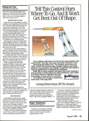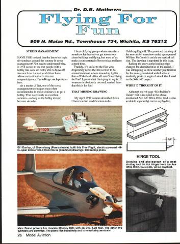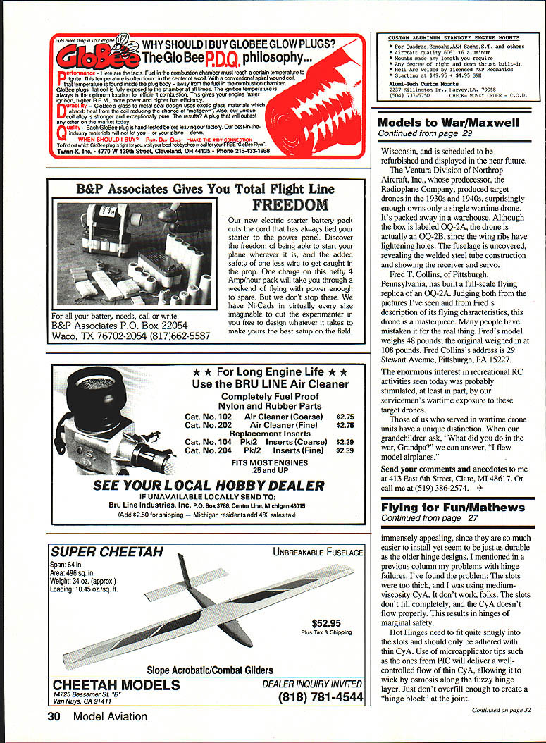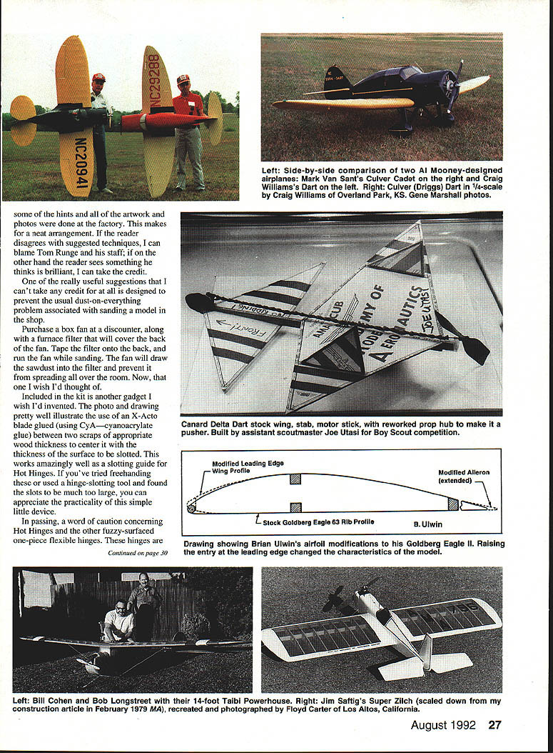 Dr D B Mathews STRESS MANAGEMENT HAVE YOU noticed latest hot topic seminars around country stress management hard understand occurs people hobby like better able blow off stresses real world recreational activities nonparticipatory Im talking couch potatoes As matter fact stress management techniques often recommended seminars get hobby certainly excellent solutionas long hobby doesnt become stressful hear flying groups members somehow let themselves get too serious about building flying us make concentrated effort relax have good time Franldy its unfair flier desperately needs stress relief around someone wound up tighter Wakefield After arent flying Fun guess what Im trying say someone obviously stressed remind fun THAT MISSING DRAWING April 1992 column described Brian Ulwins airfoil modifications Goldberg Eagle II promised drawing new airfoil somehow ended up part William McCombss article vertical tail size drawing reprinted issue Raising entry leading edge changed characteristics model attempting show another justification semisymmetrical airfoil set markedly positive angle attack used Whiz 40 project WISH ID THOUGHT OF IT Although 42-page Kit-Builders Guide included abovementioned Ace R/C Whiz 40 kit also available separately carries by-line 26 Model Aviation ccTh 909 N Maize Rd Townhouse 734 Wichita KS 76212 Bill Dunlop Greensburg Pennsylvania built Free Flight electric-powered 44in-span Dornier DO-X HiLine Don Srull drawings Bill Dunlop photo 15/St HINGE TOOL Drawing photograph neat slotting tool Hot Hinges Ace Whiz 40 kit So RimnIA vAt fl nrnctlcal Mary Reese powers 114scale Mooney Mite OS 120 twin other two cylinders dummies plane flies beautifully remarkably aerobatic some hints artwork photos done factory makes neat arrangement reader disagrees suggested techniques can blame Tom Runge staff other hand reader sees something thinks brilliant can take credit really useful suggestions cant take credit designed prevent usual dust-on-everything problem associated sanding model shop Purchase box fan discounter along furnace filter will cover back fan Tape filter onto back run fan sanding fan will draw sawdust filter prevent spreading over room Now wish Id thought Included kit another gadget wish Id invented photo drawing pretty well illustrate use X-Acto blade glued using CyAcyanoacrylate glue between two scraps appropriate wood thickness center thickness surface slotted works amazingly well slotting guide Hot Hinges youve tried freehanding used hinge-slotting tool found slots much too large can appreciate practicality simple little device passing word caution concerning Hot Hinges other fuzzy-surfaced one-piece flexible hinges hinges Continued page 30 August1992 27 Left Side-by-side comparison two Al Mooney-designed airplanes Mark Van Sants Culver Cadet right Craig Williamss Dart left Right Culver Driggs Dart 1/4-scale Craig Williams Overland Park KS Gene Marshall photos canard eita Dan StOCK wing stab motor stick reworked prop hub make pusher Built assistant scoutmaster Joe Utasi Boy Scout competition Modified Leading Edge wing ProfileModified Aileron extended Stock Goldberg Eagle 63 Rib Profile9 Ulwin Drawing showing Brian VIwins airfoil modifications Goldberg Eagle II Raising entry leading edge changed characteristics model Len BlIl Cohen Bob Longstreet 14-foot Taibi Powerhouse Right Jim Saftigs Super Zilch scaled down construction article February 1979 MA recreated photographed Floyd Carter Los Altos California battery needs call write B&P Associates PO Box 22054 Waco TX 76702-2054 817662-5587 new electric starter battery pack cuts cord has always tied starter power panel Discover freedom being able start plane wherever added safety less wire get caught prop charge hefty 4 Amp/hour pack will lake through weekend flying power enough spare dont stop have Ni-Cads virtually size imaginable cut experimenter free design whatever takes make yours best setup field * * Long Engine Life * * Use BRU LINE Air Cleaner Completely Fuel Proof Nylon Rubber Parts Cat No 102 Air Cleaner Coarse $275 Cat No 202 Air Cleaner Fine $275 Replacement Inserts Cat No 104 PkI2 Inserts Coarse $239 Cat No 204 PkI2 Inserts Fine $239 FITS MOST ENGINES 25 UP SEE YOUR LOCAL HOBBY DEALER IF UNAVAILABLE LOCALLY SEND TO Bru Line Industries Inc po Box 3788 Center Line Michigan 48015 Add $250 shipping igan residents add 4% sales taxi Models War/Maxwell Continued page 29 Wisconsin scheduled refurbished displayed near future Ventura Division Northrop Aircraft Inc predecessor Radioplane Company produced target drones 1930s 1940s surprisingly enough owns single wartime drone Its packed away warehouse Although box labeled OQ-2A drone actually OQ-2B since wing ribs have lightening holes fuselage uncovered revealing welded steel tube construction showing receiver servo Fred T Collins Pittsburgh Pennsylvania has built full-scale flying replica OQ-2A Judging both pictures Ive seen Freds description its flying characteristics drone masterpiece people have mistaken real thing Freds model weighs 48 pounds original weighed 108 pounds Fred Collinss address 29 Stewart Avenue Pittsburgh PA 15227 enormous interest recreational RC activities seen today probably stimulated least part servicemens wartime exposure target drones us served wartime drone units have unique distinction grandchildren ask What did war Grandpa can answer flew model alrplanes Send comments anecdotes 413 East 6th Street Clare MI 48617 call 519 386-2574 ng Fun/Mathews Continued page 27 immensely appealing since much easier install yet seem just durable older hinge designs mentioned previous column problems hinge failures Ive found problem slots too thick using mediumviscosity CyA dont work folks slots dont fill completely CyA doesnt flow properly results hinges marginal safety Hot Hinges need fit quite snugly slots should adhered thin CyA Use microapplicator tips such ones PlC will deliver wellcontrolled flow thin CyA allowing wick osmosis along fuzzy hinge layer Jus