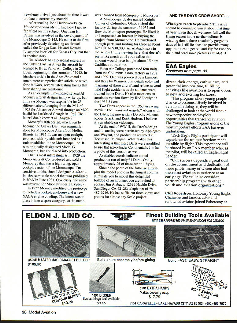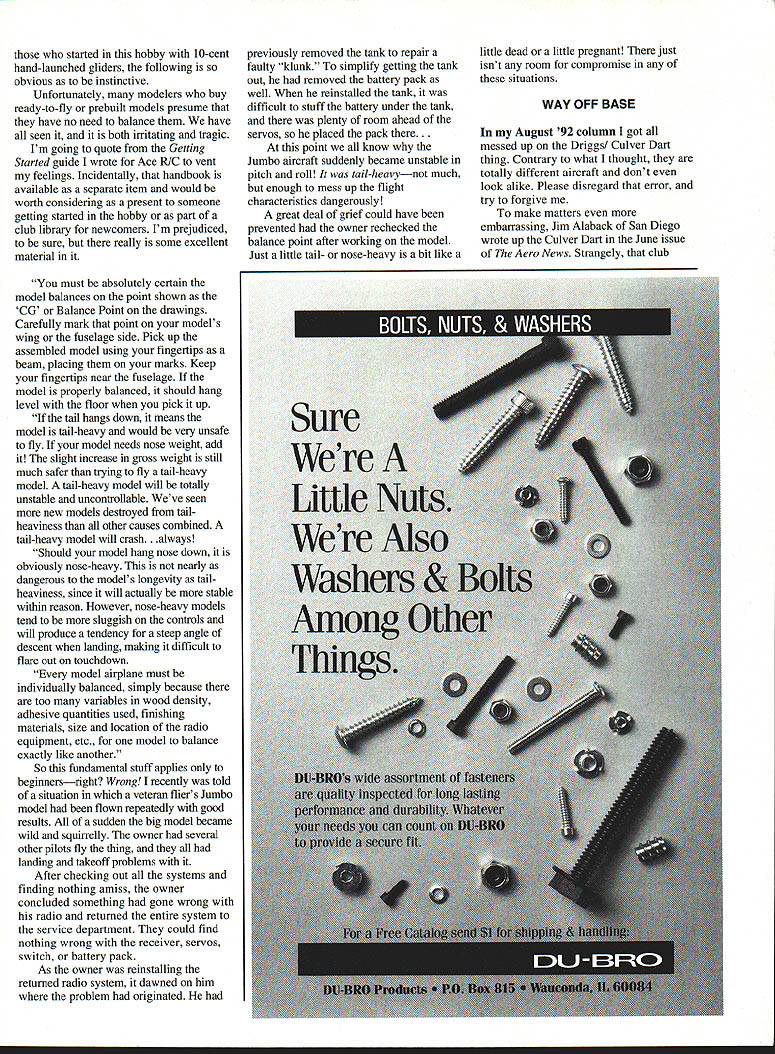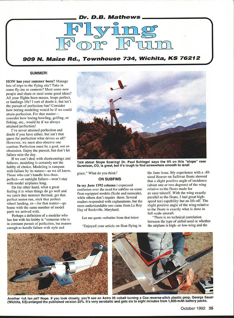 Dr D B Math ws SUMMER HOW has summer Manage lots trips flying site Take some fly-ins contests Meet some new people share steal some good ideas flights maxes loops perfect landings lOs sort doubt isnt pursuit perfection fun Consider boring modeling would could attain perfection matter consider boring bowling golfing fishing etc would always attained perfection Ive never attained perfection doubt have either isnt quest perfection what drives us However must also observe caution Perfection must goal obsession Enjoy pursuit dont let failure ruin day cant deal shortcomings failures modeling certainly hobby choice Modeling rampant failure its natureas know cant handle less-thanperfector outright failurewont stay model airplanes long other hand what great feeling things go well catch monster thermal get perfect motor run stick perfect wheel landing orfor mattergo home same number model parts arrived Perhaps definition modeler has fun hobby someone constant pursuit perfection mature enough handle failure style grace What think ON SUBFINS June 1992 column expressed confusion over need subfins some float-equipped models Scale nonscale others dont require Several readers responded explanations understandable came Le Roy Day Rockville Maryland Let quote verbatim letter Enjoyed article float flying June issue experience 40sized Beaver Sullivan floats showed slight positive angle incidence about two degrees wing relative floats made easy takeoff wing exactly parallel floats great highspeed taxi capability no lift-off slight positive angle wing relative floats exactly what done full-scale aircraft no technical correlation between type airfoil used whether airplane high- low-wing October1992 35 909 N Maize Rd Townhouse 734 Wichita KS 76212 Talk about Slope Soaring Dr Paul Schiegel says lift sIope near Gunnison CO great its tough find somewhere smooth land Another 1/2A fan jet Nope look closely youll see Astro 05 cobalt turning Cox reverse-pitch plastic prop George Sauer Wichita KS enlarged published version 25% Its very aerobatic gets six eight minutes 1 800-mAh battery packs need subfin provide adequate yaw stability airplane quite stable yaw long tail moment large vertical tail area floats may need subfin floats floats added airplane portion side area forward CG destabilizing yaw opposite effect tail aft CG course side area floats aft contributes some small amount positive yaw stability forward area usually dominates Hence need usually add additional vertical surface get back same degree yaw stability look side view airplane floats think can visualize easily worrying about engineering Le Roy independent aerospace management consultant Need say WEATHERS WESTERNER referring Westerners really necessary preface name designers name two distinctly different Free Flight designsboth eligible SAM useby name absolutely beautiful Weathers design included month published MAN May 1938 eight-footer later semipylon configuration Don Foote published Air Trails August 1943 Additionally Foote design killed several sizes Model Hobby Products highly successful West Coast contest machine just before WW II other hand usual Weathers concept directed much competing beauty later 10-foot pioneer RC version written up MAN never published Eut Tileston 1800 Carmelo Drive Carmichael CA 95606 has scaled Weathers design up down appropriate structural sizes As often has Eut has proved Weathers Westerner nice look very competitive SAM events Eut has drawings available sizes ranging 108 67 sized accommodate SAM size/engine requirements various classes Write Eut details prices also has available Gross Flying Wing 1941 New Cyclone Lancer several sizes three-views photos see April 1988 column Grossing Wing June 1985 Lancer ARE YOU BALANCED last column mentioned marginal understanding among newer RC fliers importance balancing 36 Model Aviation Plans Demeco KITS like WIS 47 wipe available Fran Ptaskiewicz 23 Marlee Dr Towanda NY 14150 John R Walker Charlottesville VA scratch-built CO2 FF Curtiss Swift enlarged three-views Donna Burts Lynn Haven FL Fly Baby construction article October 1990 Model Aviation Joe Weatherss beautiful Westerner reduced 575 sq Eut Tileston frontrotor Ohlsson Rice 60 antique ignition engine wingspan 80 Left Culver Dart NC 20941 82 EAA Fly-In Oshkosh Wisconsin Right Dart converted flat engine has touch French Jodel about somehow isnt production version mentioned text Both photos taken Jim Alaback started hobby 10-cent hand-launched gliders following obvious instinctive Unfortunately modelers buy ready-to-fly prebuilt models presume have no need balance have seen it both irritating tragic Im going quote Getting Started guide wrote Ace R/C vent feelings Incidentally handbook available separate item would worth considering present someone getting started hobby part club library newcomers Im prejudiced sure really some excellent material previously removed tank repair faulty ldunk simplify getting tank out removed battery pack well reinstalled tank difficult stuff battery under tank plenty room ahead servos placed pack there. point know Jumbo aircraft suddenly became unstable pitch roll tail-heavynot much enough mess up flight characteristics dangerously great deal grief could have prevented owner rechecked balance point after working model Just little tail- nose-heavy bit like little dead little pregnant just isnt room compromise situations WAY OFF BASE August 92 column got messed up Driggs/ Culver Dart thing Contrary what thought totally different aircraft dont look alike Please disregard error try forgive make matters embarrassing Jim Alaback San Diego wrote up Culver Dart June issue Aero News Strangely club must absolutely certain model balances point shown CG Balance Point drawings Carefully mark point models wing fuselage side Pick up assembled model using fingertips beam placing marks Keep fingertips near fuselage model properly balanced should hang level floor pick up tail hangs down means model tail-heavy would