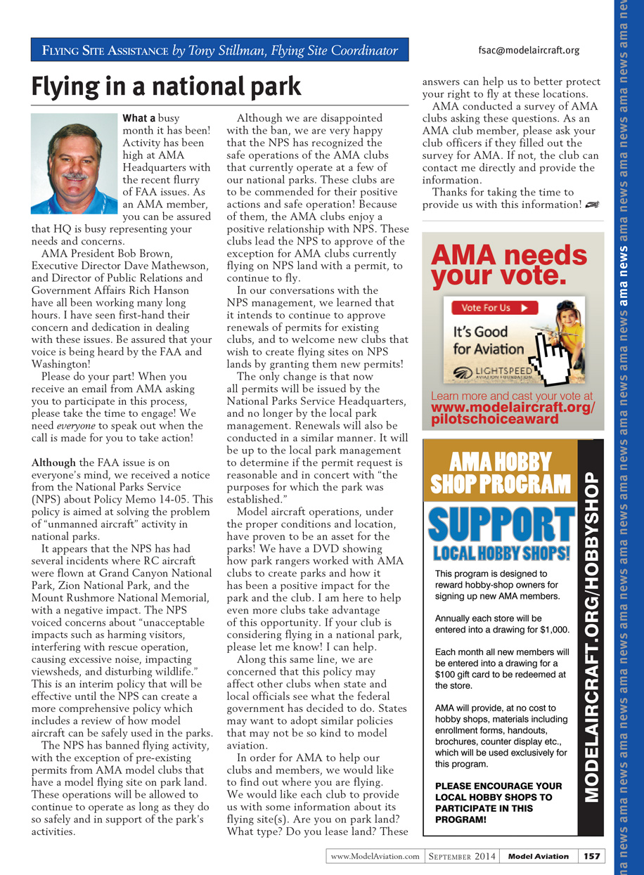 Although we are disappointed with the ban, we are very happy that the NPS has recognized the safe operations of the AMA clubs that currently operate at a few of our national parks. These clubs are to be commended for their positive actions and safe operation! Because of them, the AMA clubs enjoy a positive relationship with NPS. These clubs lead the NPS to approve of the exception for AMA clubs currently flying on NPS land with a permit, to continue to fly.