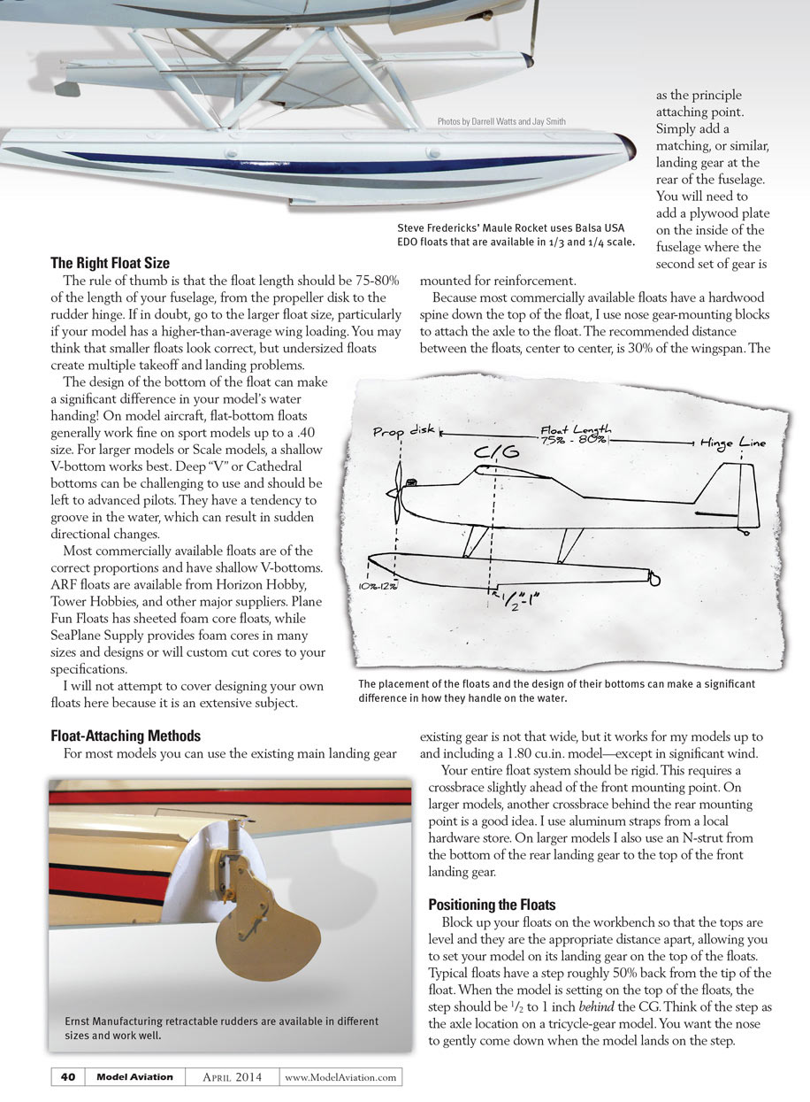 The rule of thumb is that the float length should be 75-80% of the length of your fuselage, from the propeller disk to the rudder hinge. If in doubt, go to the larger float size, particularly if your model has a higher-than-average wing loading. You may think that smaller floats look correct, but undersized floats create multiple takeoff and landing problems.