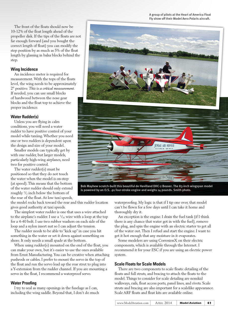 There are two components to Scale floats: detailing of the floats and full struts, and bracing to attach the floats to the model. Things to consider for scale detailing are nonskid walkways, rails, float access ports, panel lines, and rivets. Scale struts and bracing are also important for Scale appearance. Scale ARF floats and float kits are available online.