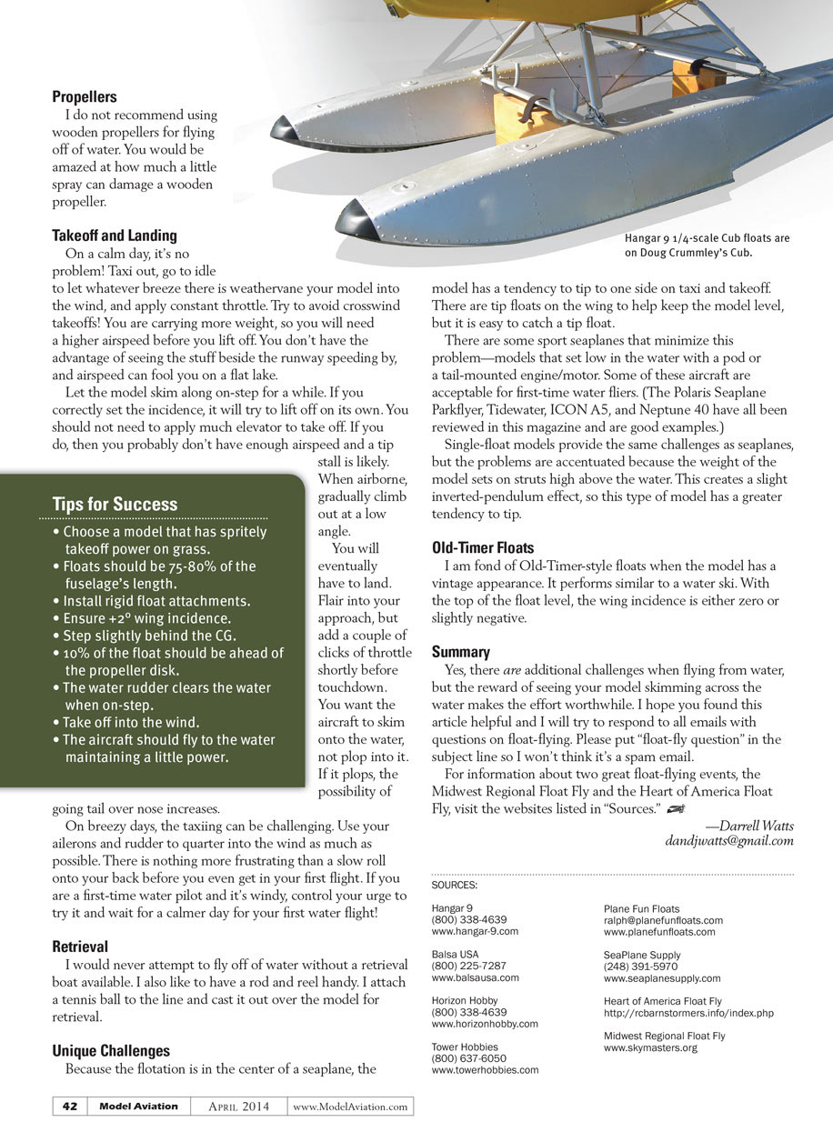 Yes, there are additional challenges when flying from water, but the reward of seeing your model skimming across the water makes the effort worthwhile. I hope you found this article helpful and I will try to respond to all emails with questions on float-flying. Please put “float-fly question” in the subject line so I won’t think it’s a spam email.